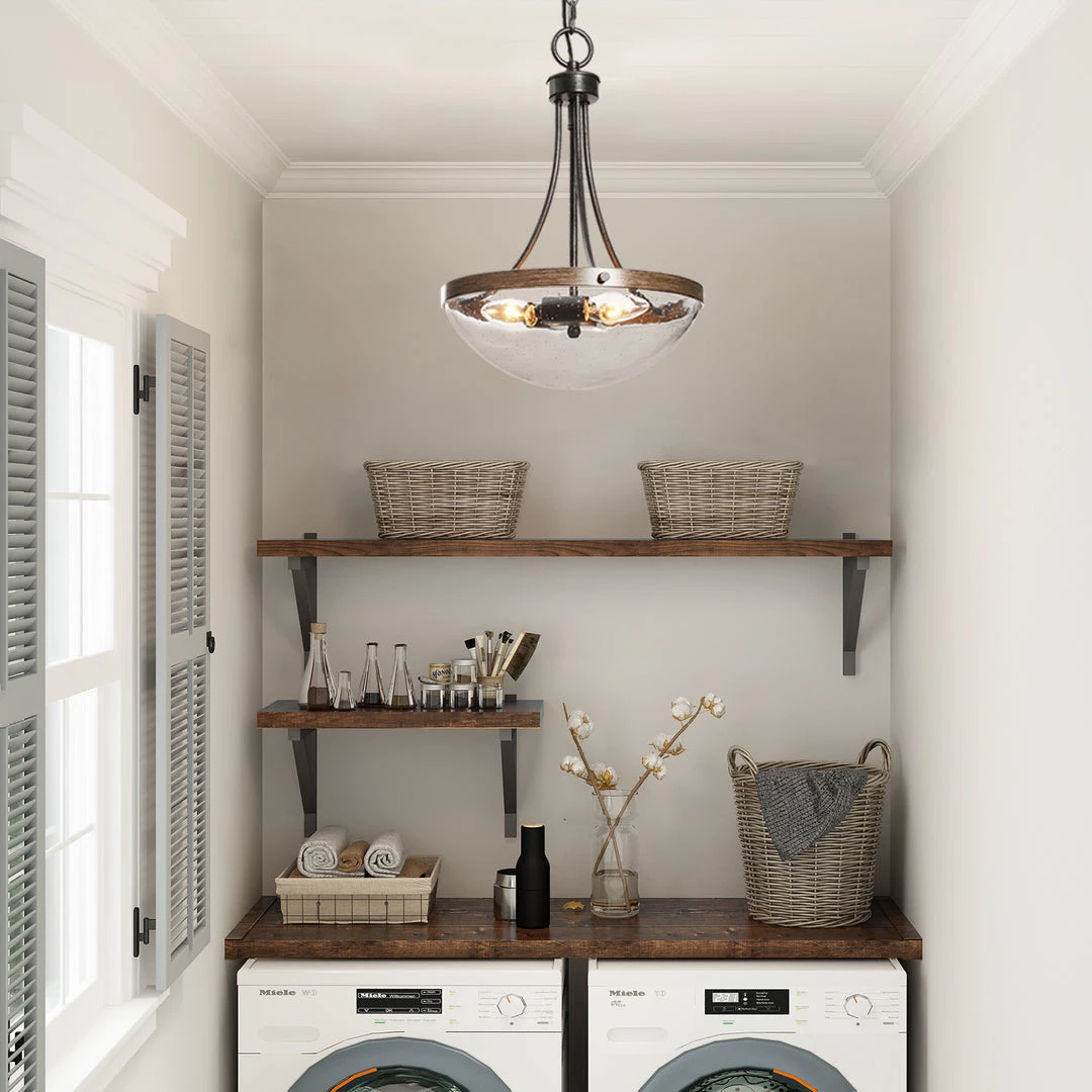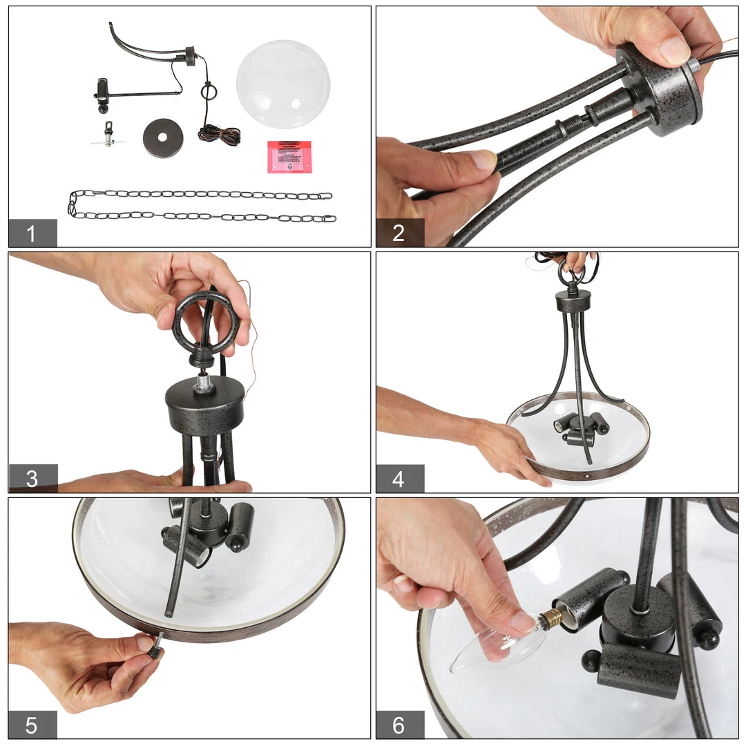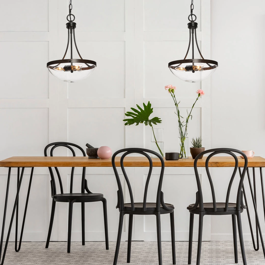 Finished in a half-bowl clear glass shade and rust color rods, this chandelier is a perfect mix of modernity and innovation. Without too many ornate ornaments, this light could be paired with different styles and bring a chic and finishing touch.