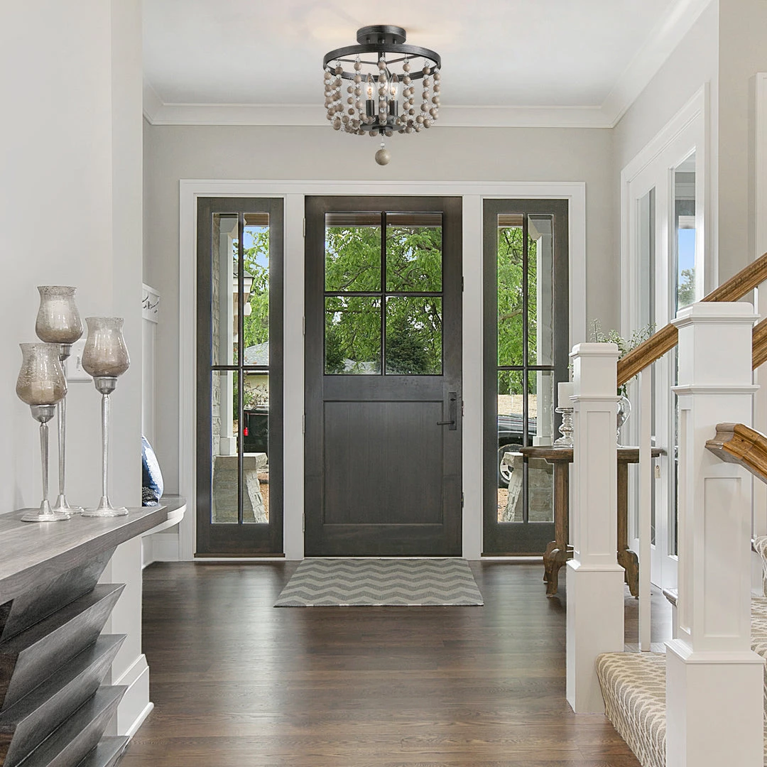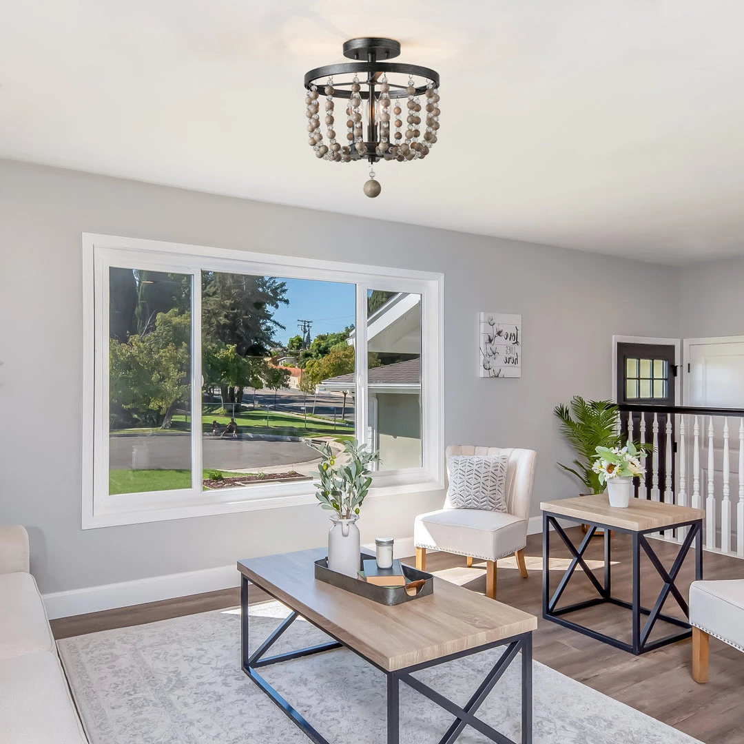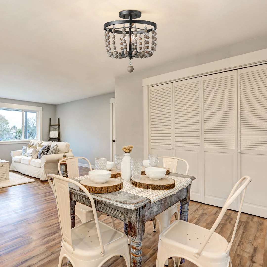This light fixture is a prominent display of round distressed wooden beads & crystal beads. The bead rings are hung on the black silver-plated iron round frame to add bohemian charm. Without a doubt, this lighting fixture is designed to impress your guests in any room: kitchen, bedroom, or living room.