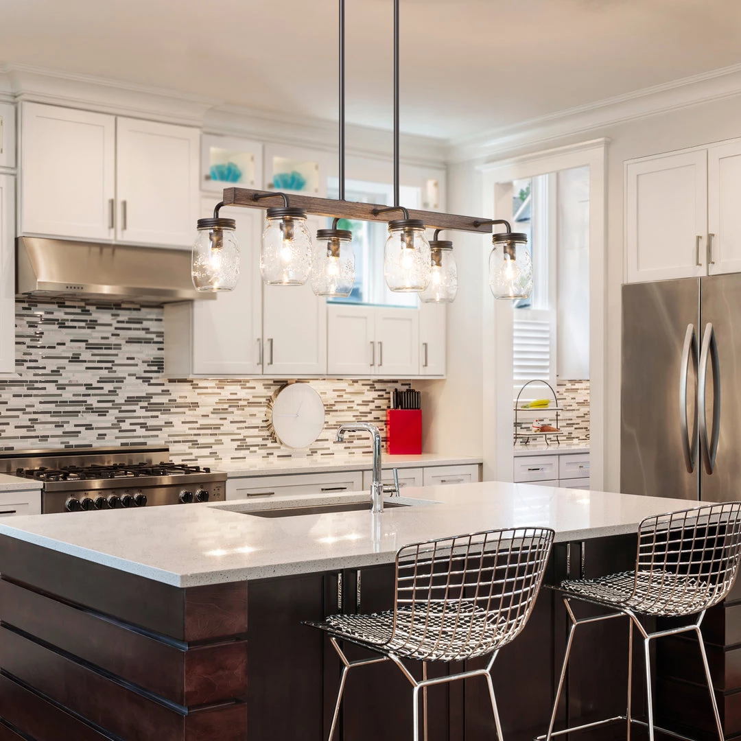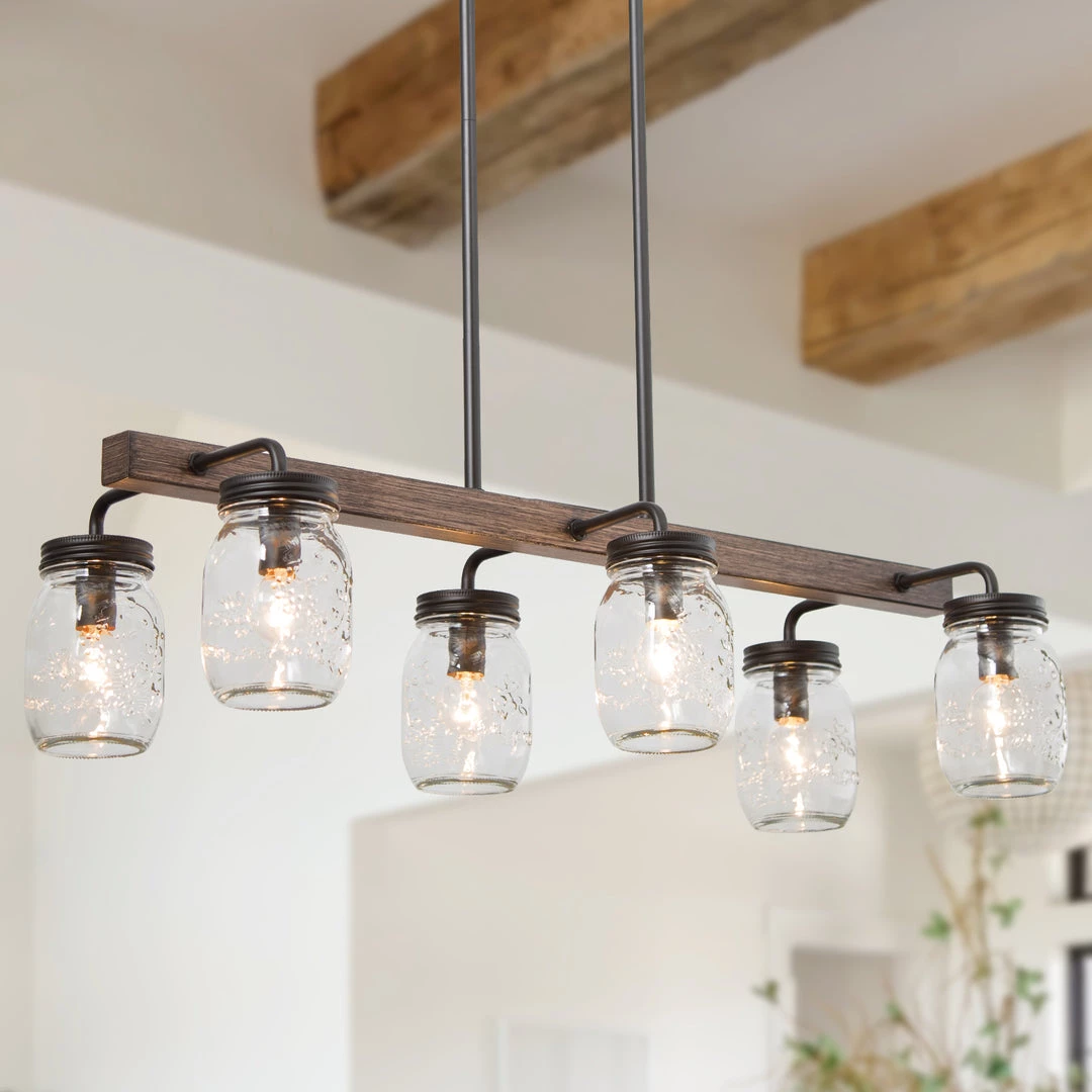 Materials, shapes, and finishes combine harmoniously in this clean rustic Mason Jar Chandelier. The farmhouse styling will be a welcoming touch in a soft modern farmhouse foyer or kitchen. The hand-painted column is finished in distressed grey which underscores the rustic motif of this truly gorgeous piece. Perfect to be hung over a kitchen island or in a living room.