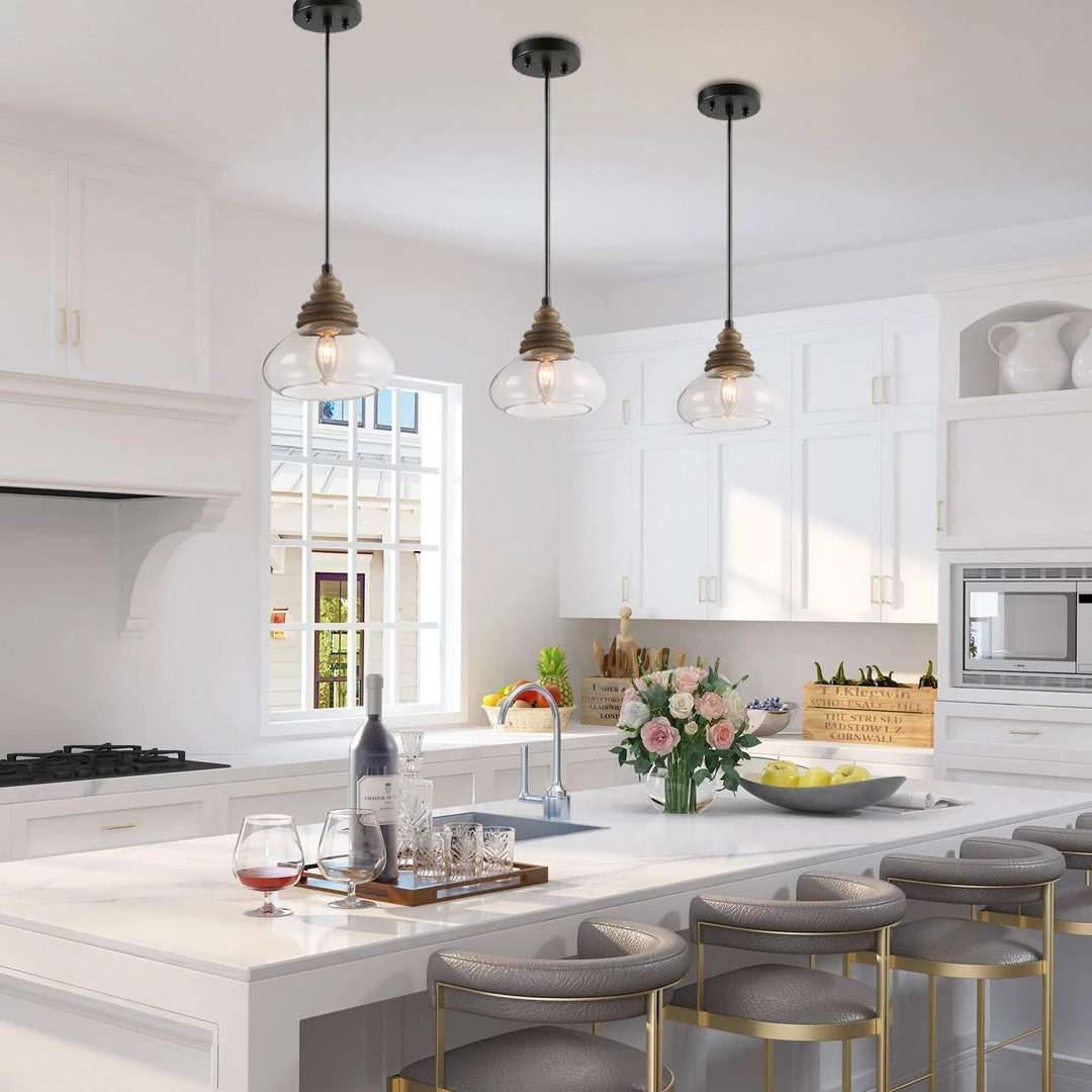 This elegant pendant lighting features a clear glass teardrop shade with old wood top, and inviting lighting that makes you feel welcome and relaxed. Hanging in groups of two or more, it will give off plenty of brilliance while creating a charming retro touch to your dining room, bedroom, kitchen, living room, entryway, foyer, and stairway.