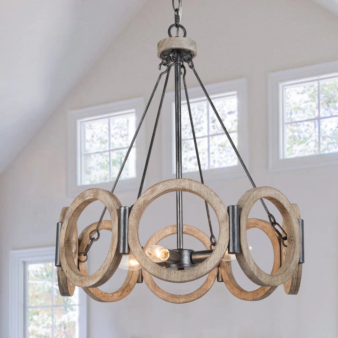 This beautiful farmhouse chandelier features wooden circles linked with metallic rivets. This is a modern design that is loaded with rustic materials. The contrasting styles of shape and materials give this piece the edgy look that is perfect to be incorporated in home decor of myriads of styles: ranging from farmhouse to modern, vintage to industrial.