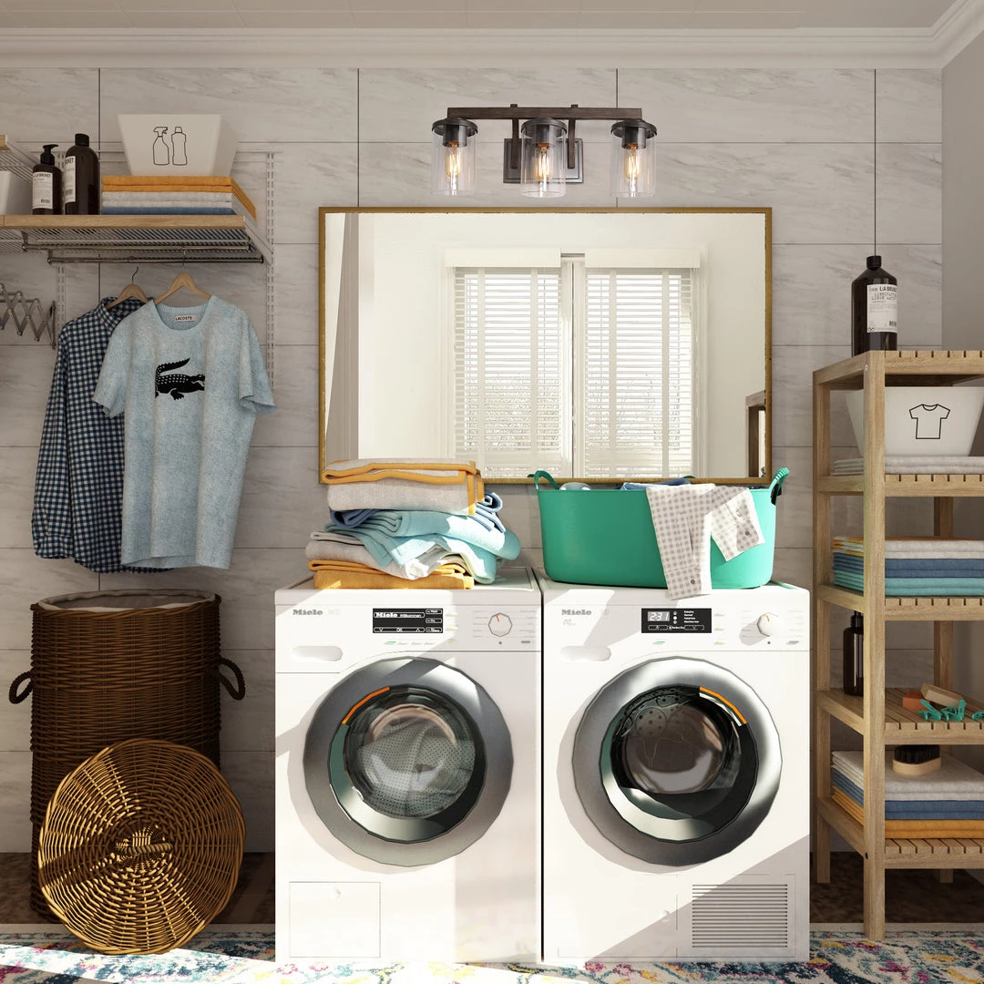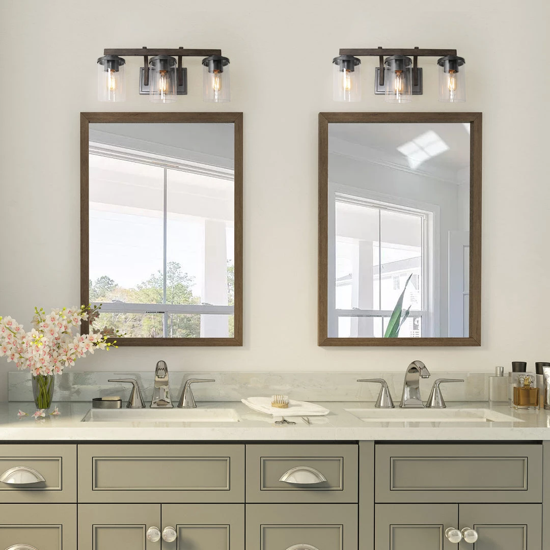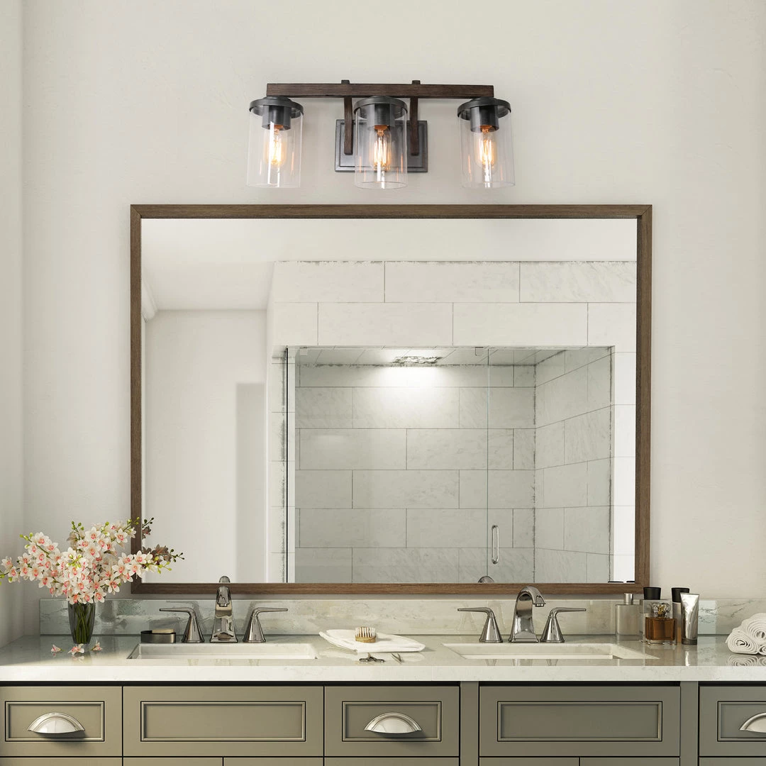 This 3-light vanity light fixture is a wonderful blend of rustic and industrial tastes. The faux wood finish accents stand out against the distressed black finish of the backing and decorative pieces. Three clear glass shades give a creative touch to this accent piece.