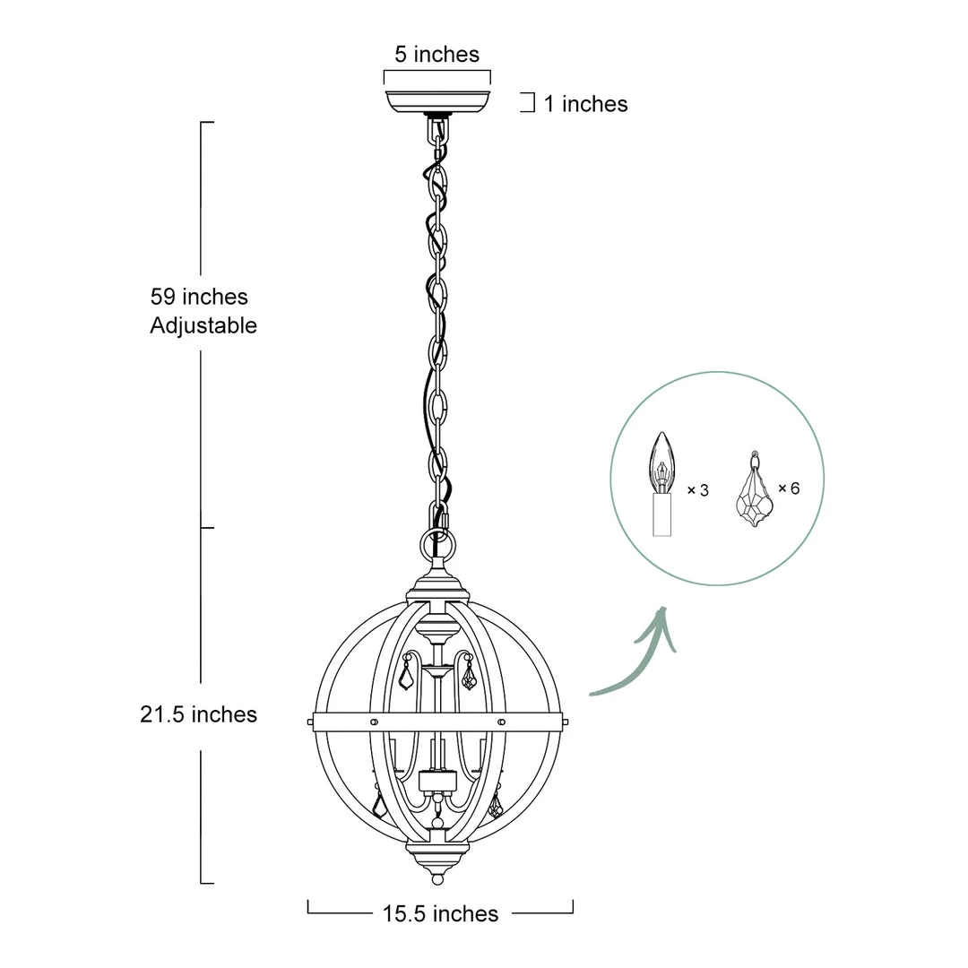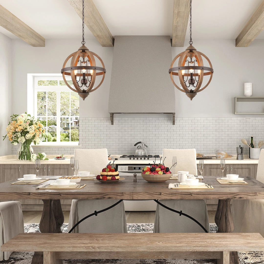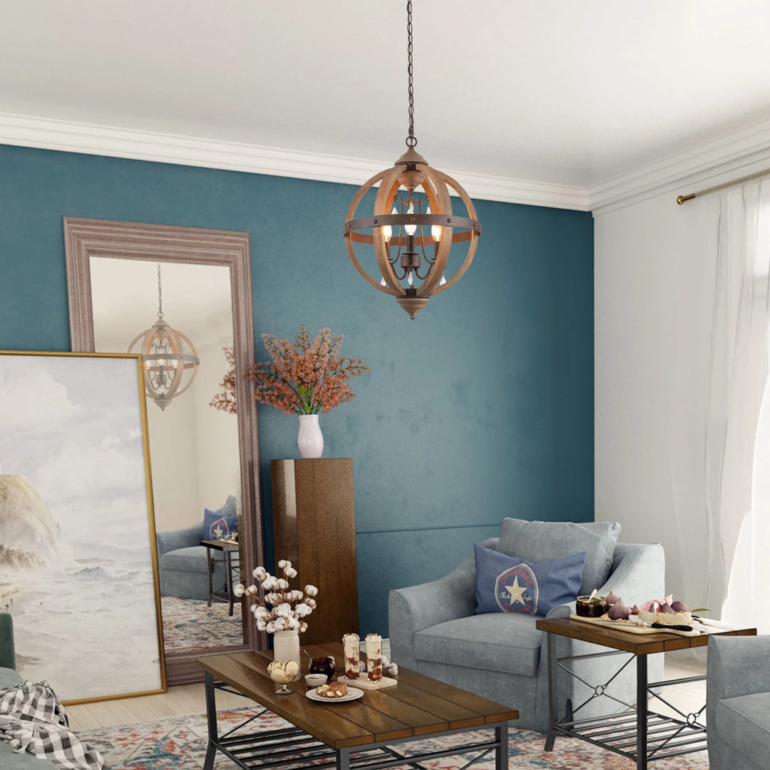 Crafted of natural solid wood frame in high-grade wood color, this farmhouse chandelier features an elegant sphere wrapped with rustic metal strap, glittering and translucent crystal pendants make it a vigorous trendy piece.