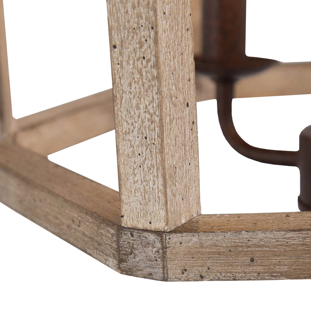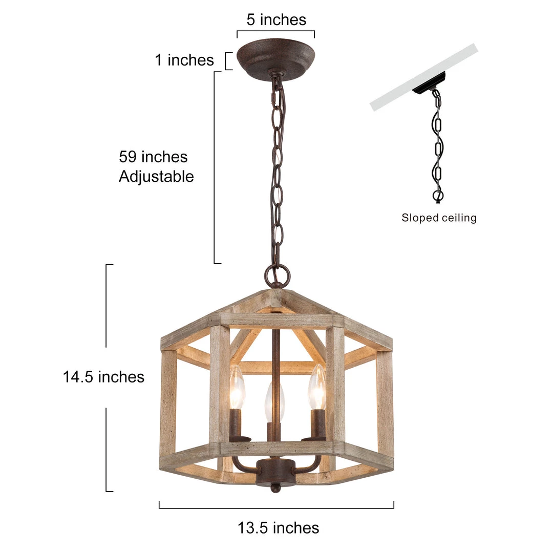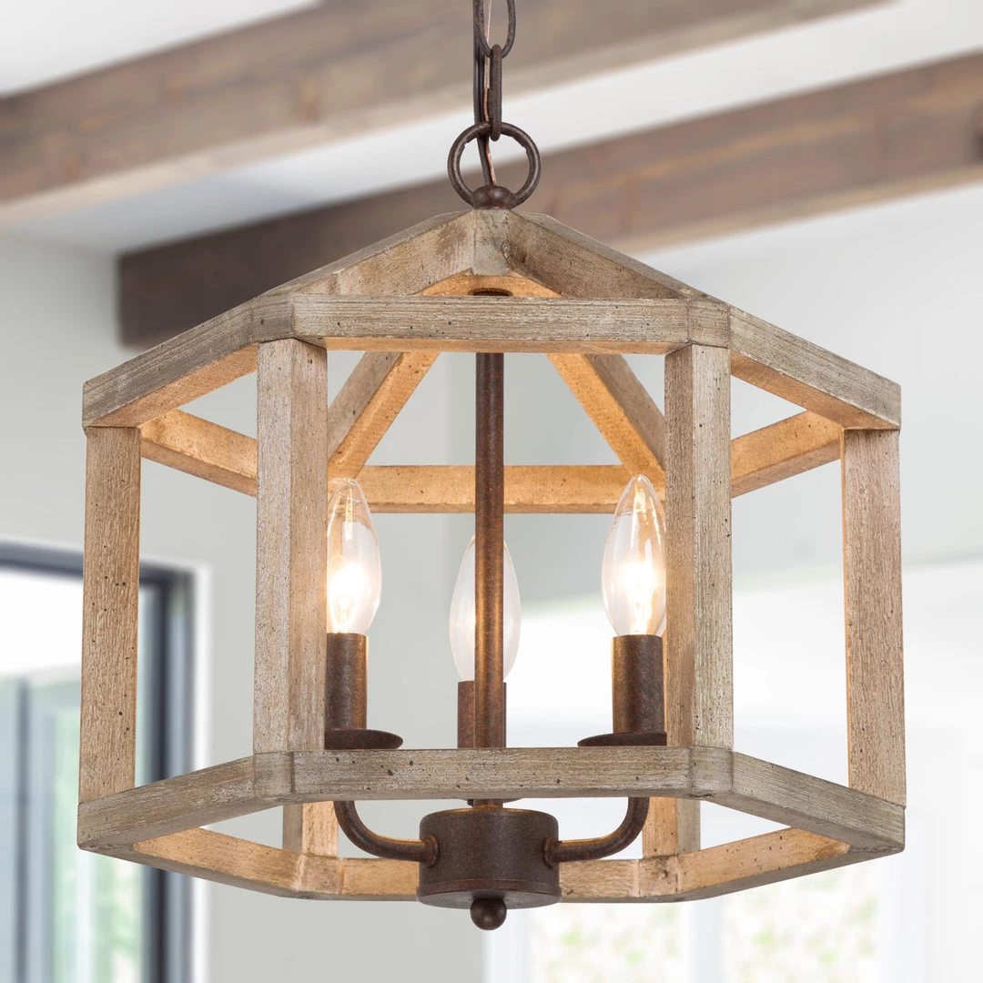Bring antique-inspired charm to farmhouse and rustic living room, kitchen or foyer with this quietly refined lantern chandelier. With the open frame design, this fixture shines your space with light and charm. The combination of the geometric frame and rustic grain stain veneer creates the understated farmhouse look that fuses character and the demure vibes to your spaces.
