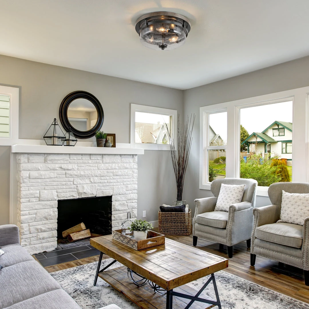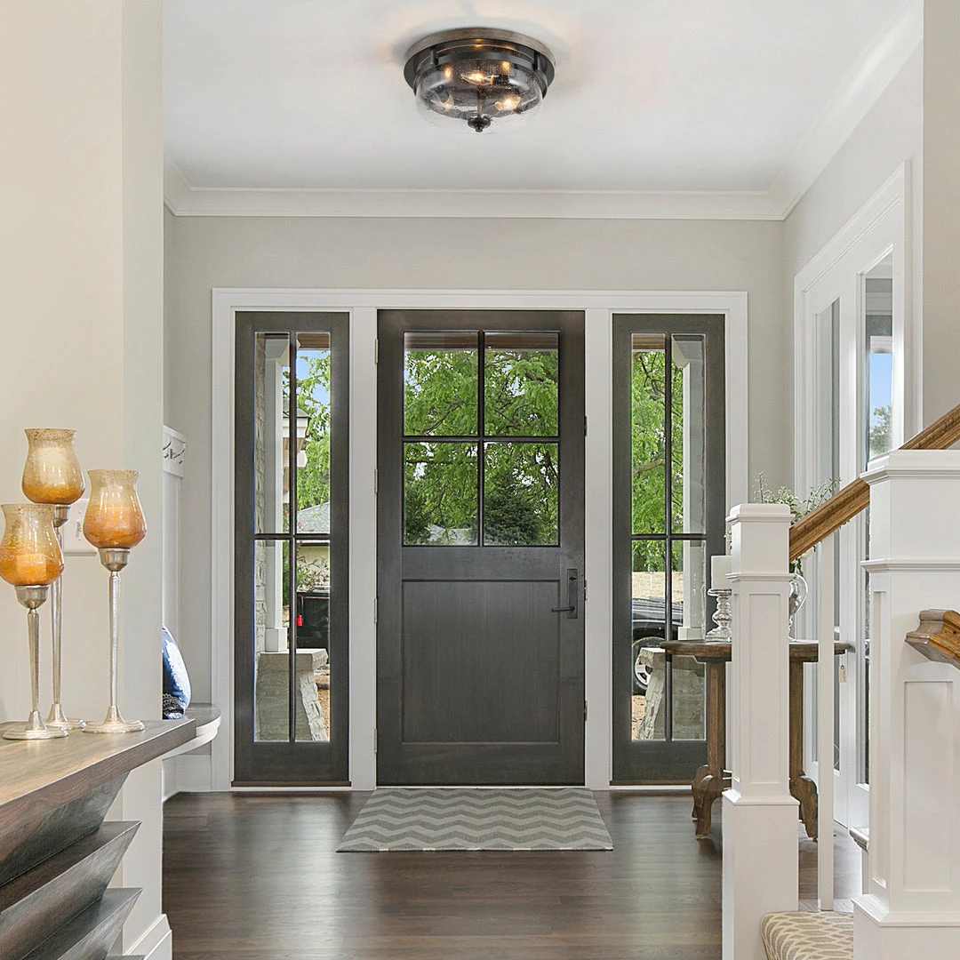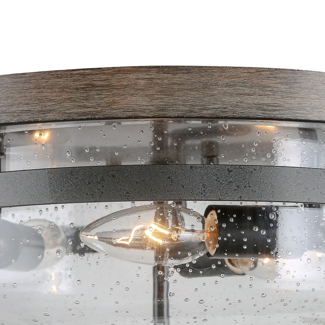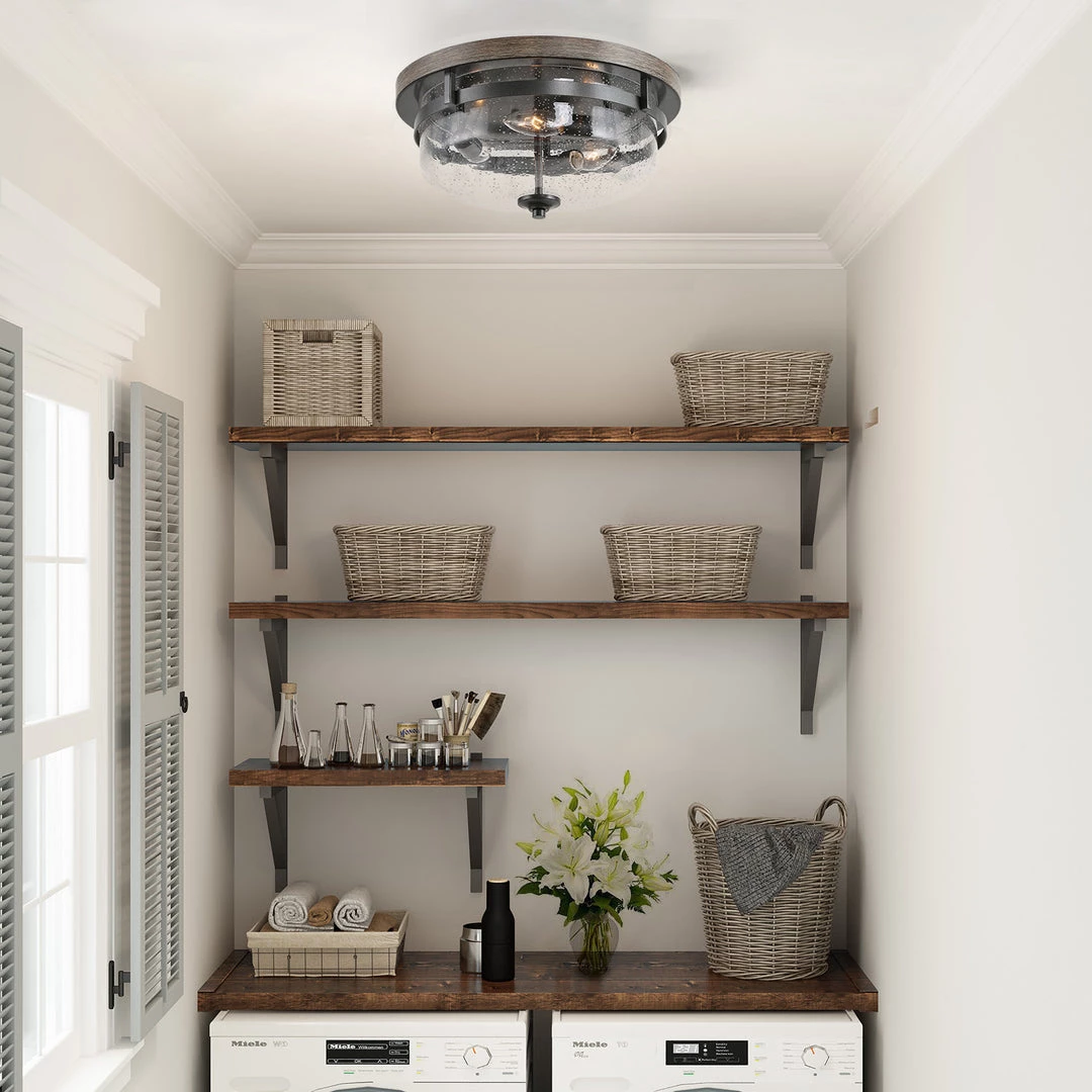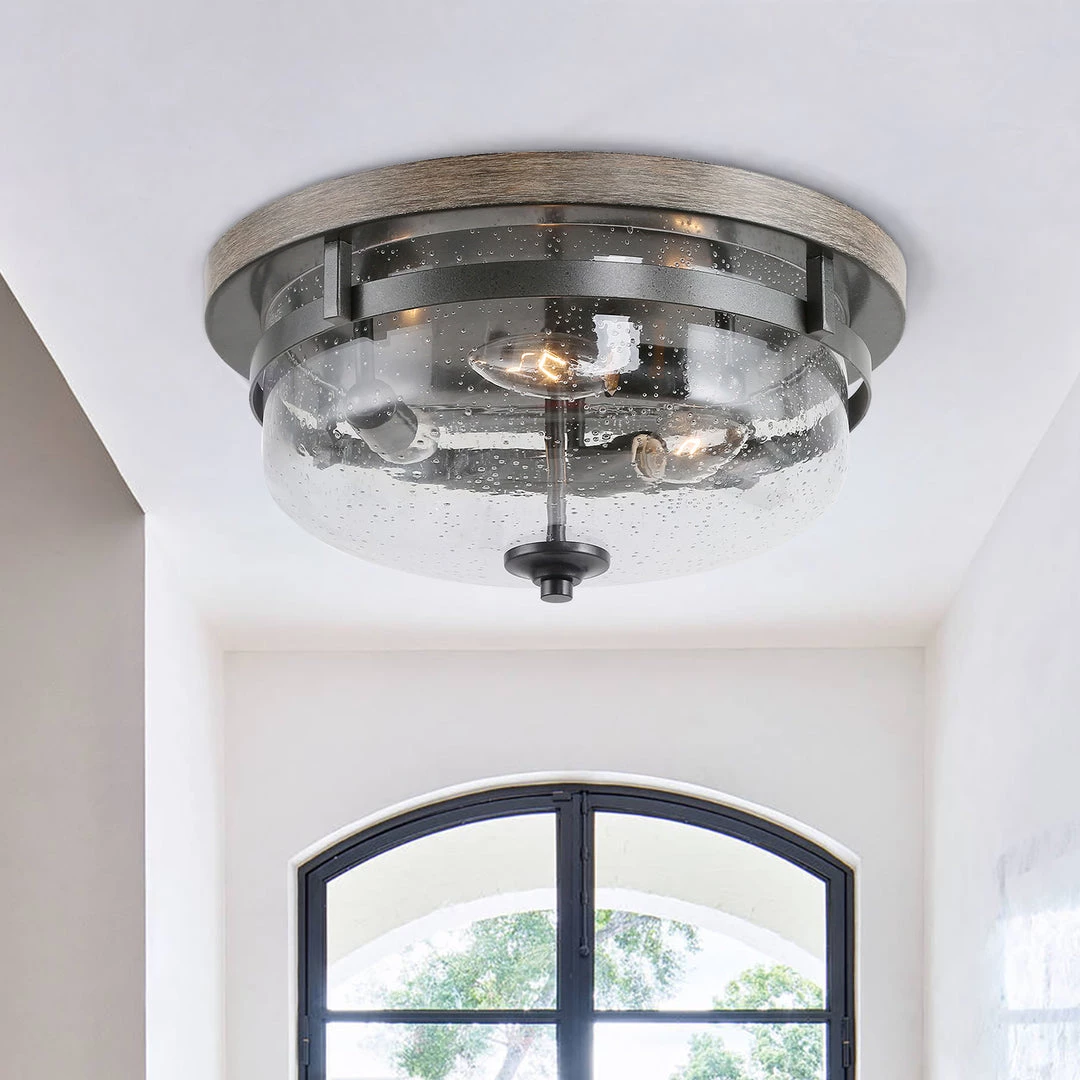 Beautifully crafted, this dimmable three-light full flush mount ceiling light is a magnificent design. It features a lovely, clear seeded glass shade suspended from a round steel frame in an earth black finish. Place this fabulous fixture in a kitchen, entryway, living room, or any space in need of elegant illumination.