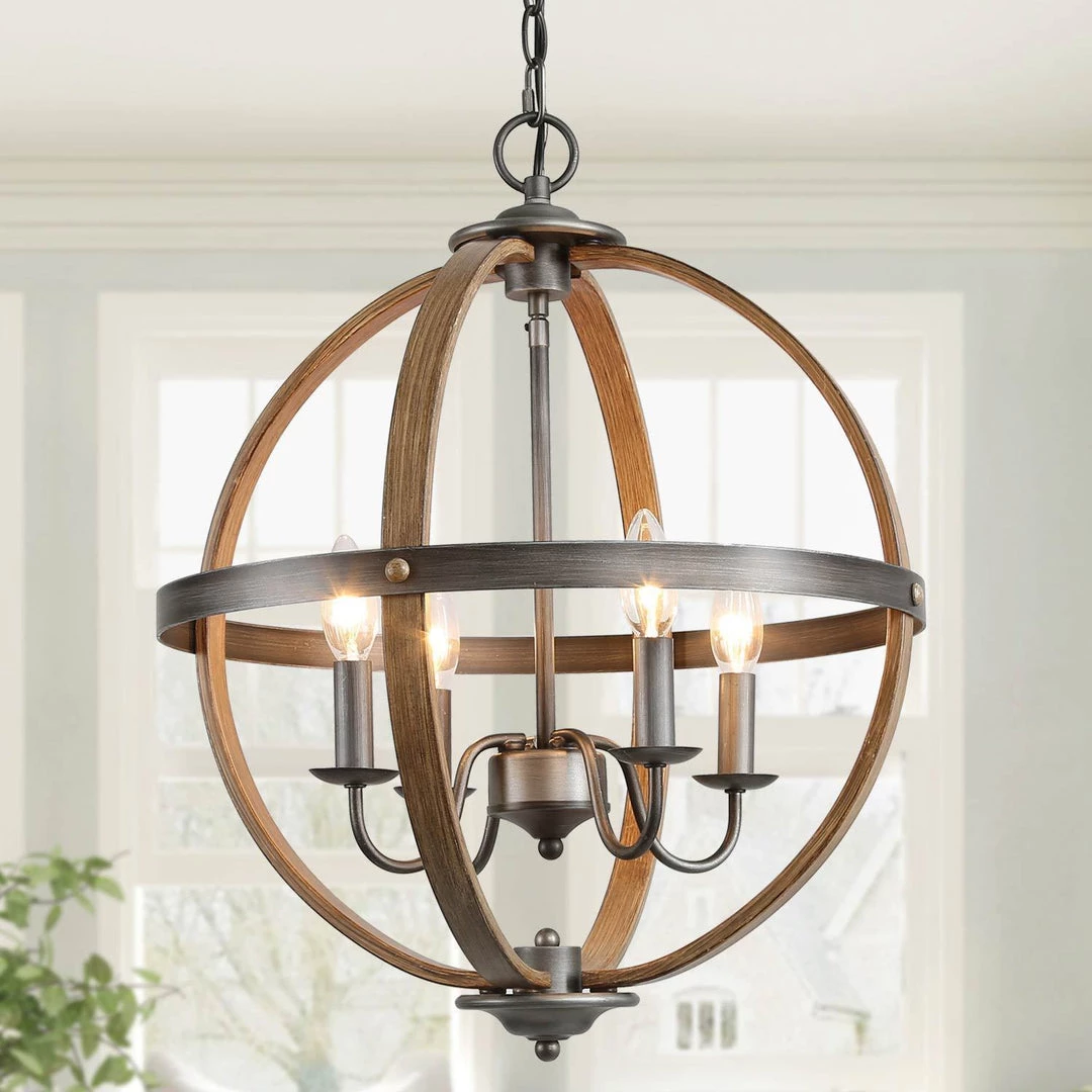 Featuring solid metal with faux wood and silver brushed finish and 4 graceful arms, this farmhouse chandelier is perfect for dining rooms, bedrooms, entryway and any other places that you want farmhouse and modern charm.