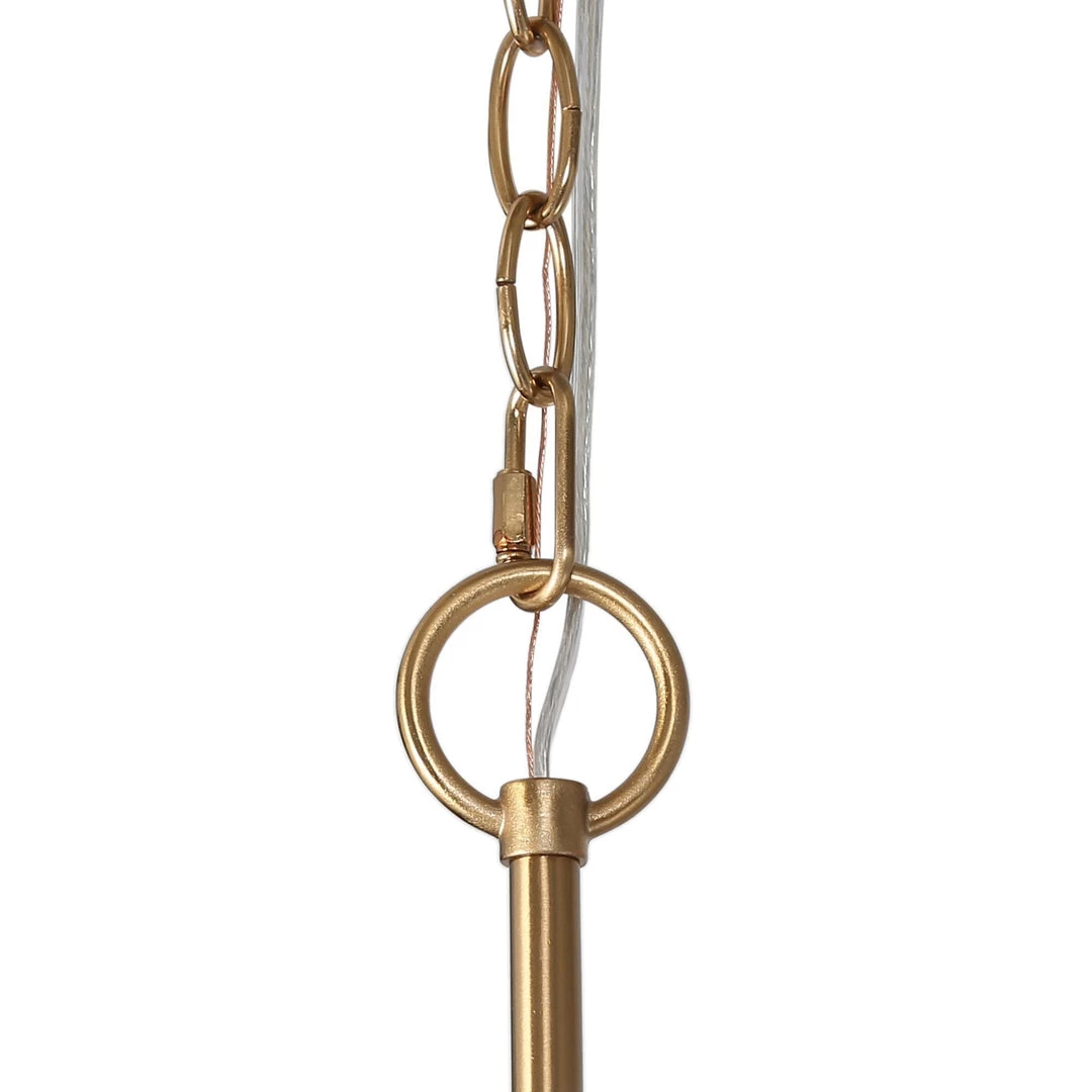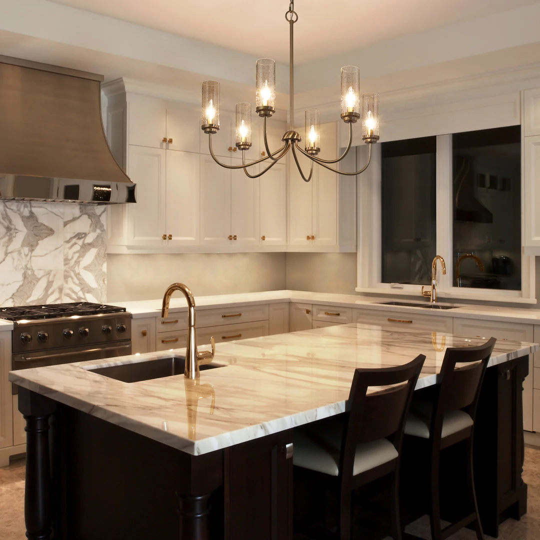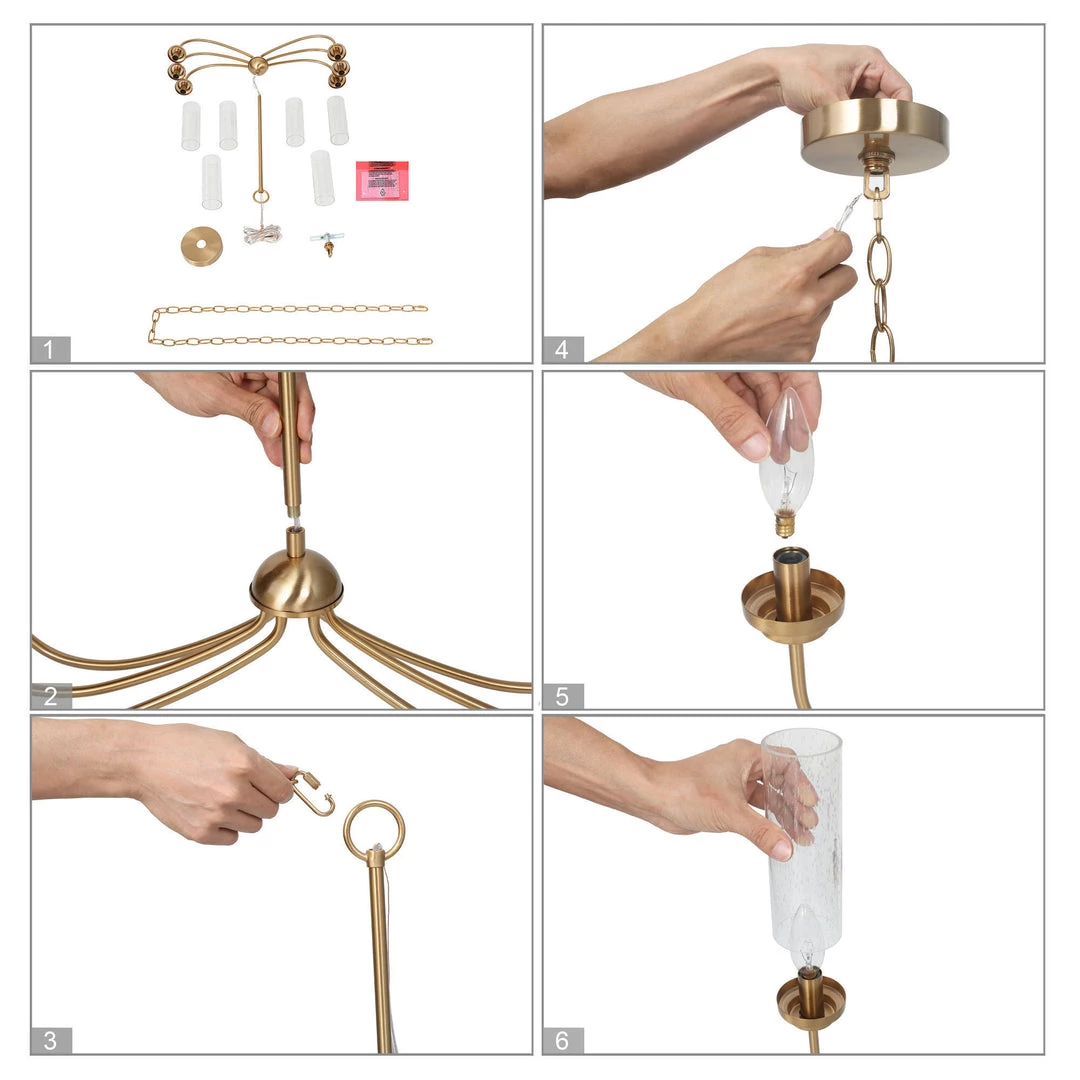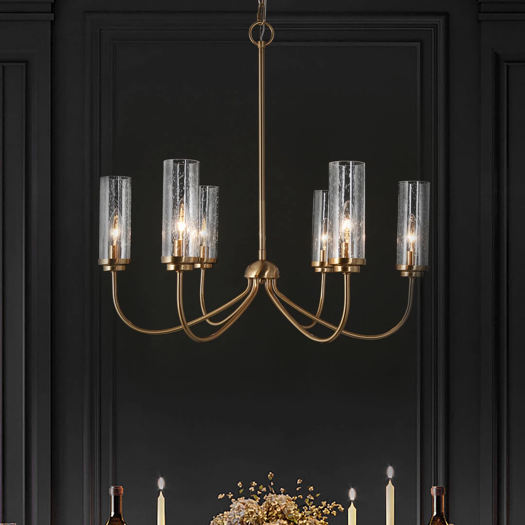 This gorgeous chandelier merges traditional elegance with the beautiful contemporary shape and finishes. The metal frame has a streamlined classic shape, which is complemented by the thin clear glass shades. Ideal for your bedroom, living room, or kitchen.