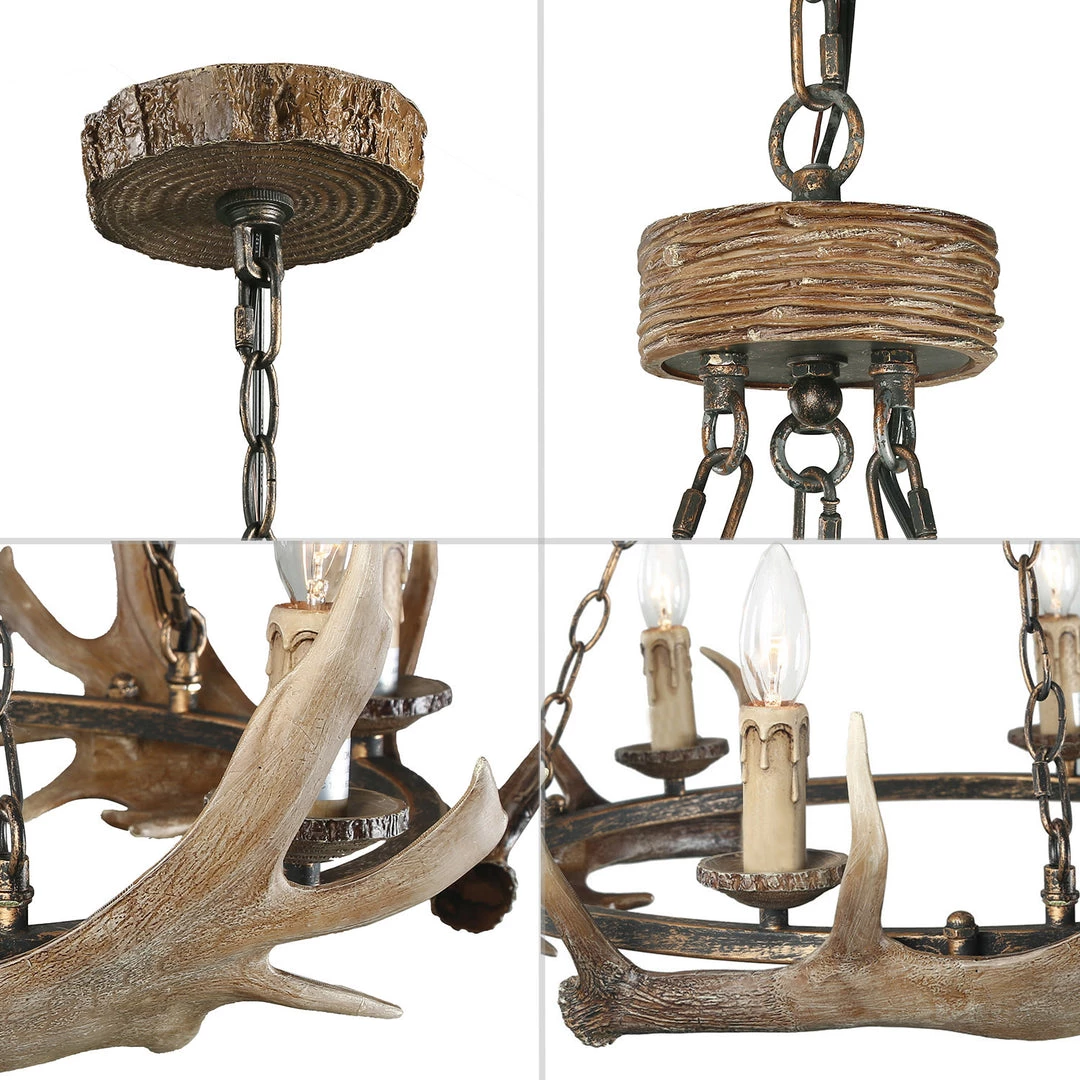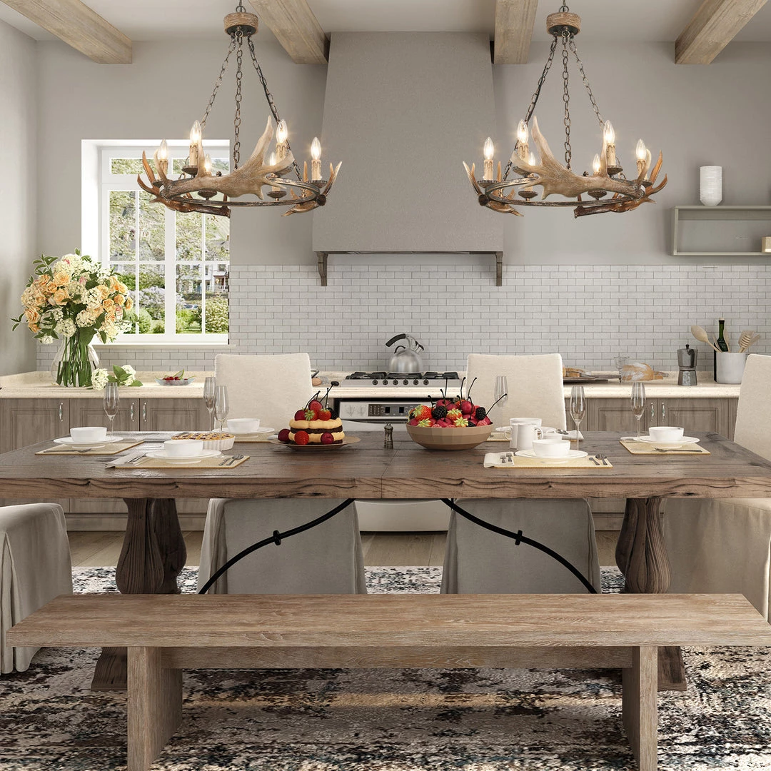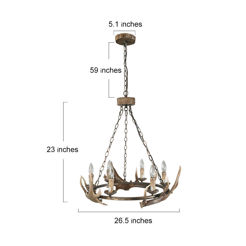 The Elegant antler-shaped chandelier, specially designed to illuminate the heart of your kitchen, entry, or farmhouse-style places. Crafted of hand-applied resin and rusty metal, this design features a vintage round base and 6 candle-shaped bulb stems with dish cups.- The farmhouse lighting package includes all the necessary assembling and installation parts along with clearly marked cords.