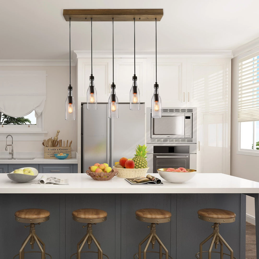 Clearly, this versatile glass lamp and matching pendant can swing in a modern or traditional scenario. Add an antique and unique touch to your home decor by acquiring this wonderful glass bottle pendant light which will amend the appearance of your living place.5 clear bottle pendants will not only brighten up your living place but also illuminate it interestingly with different interior decorations.