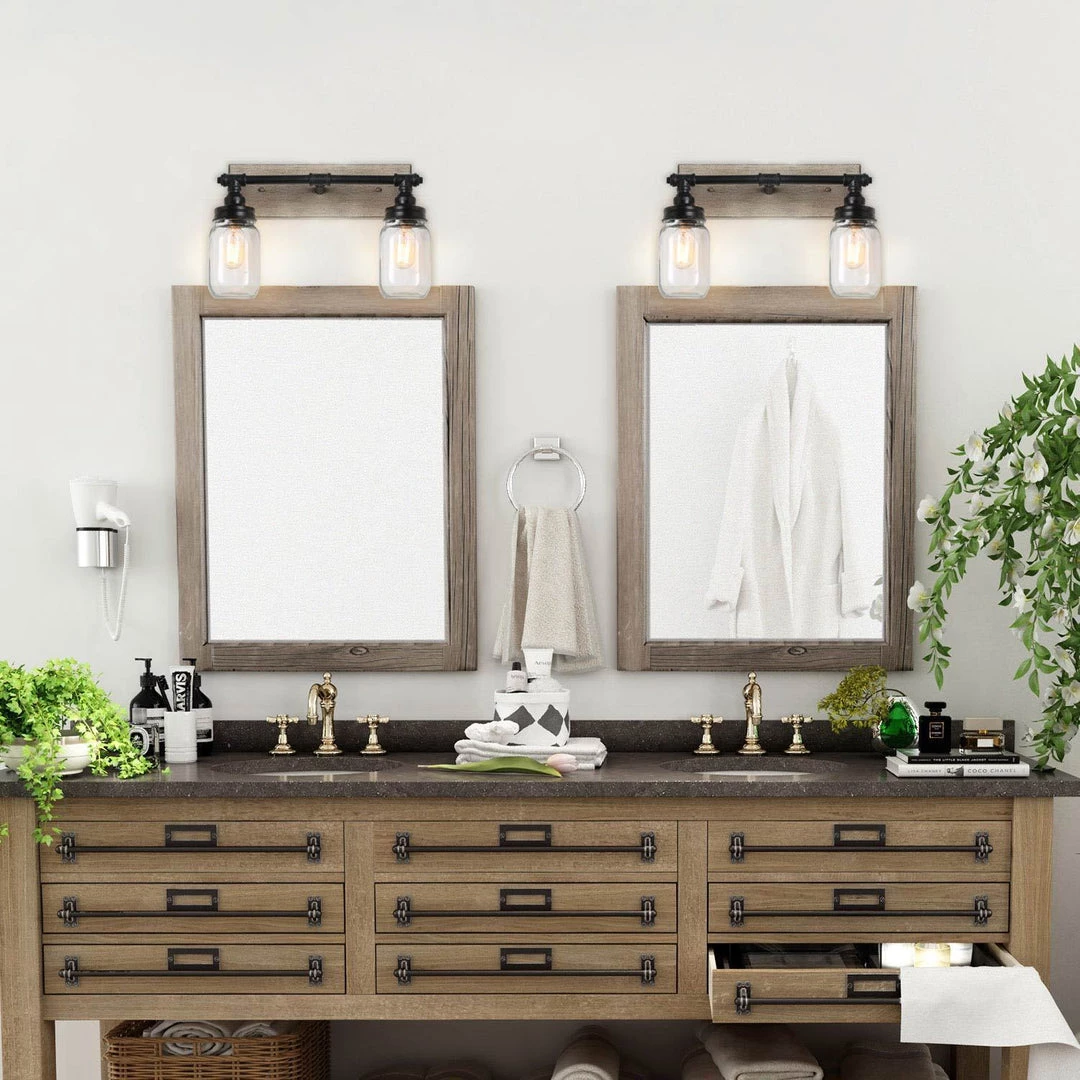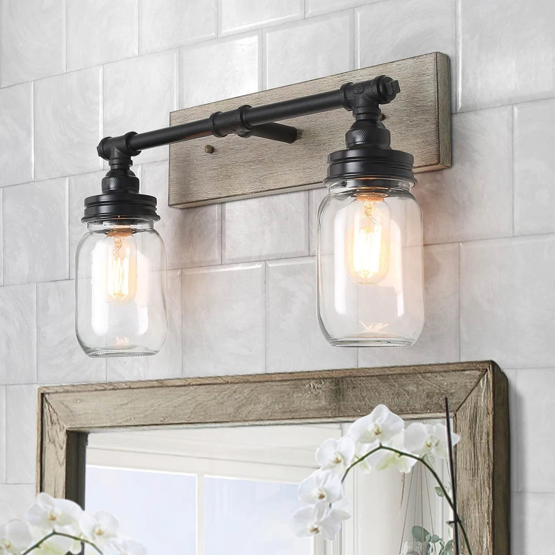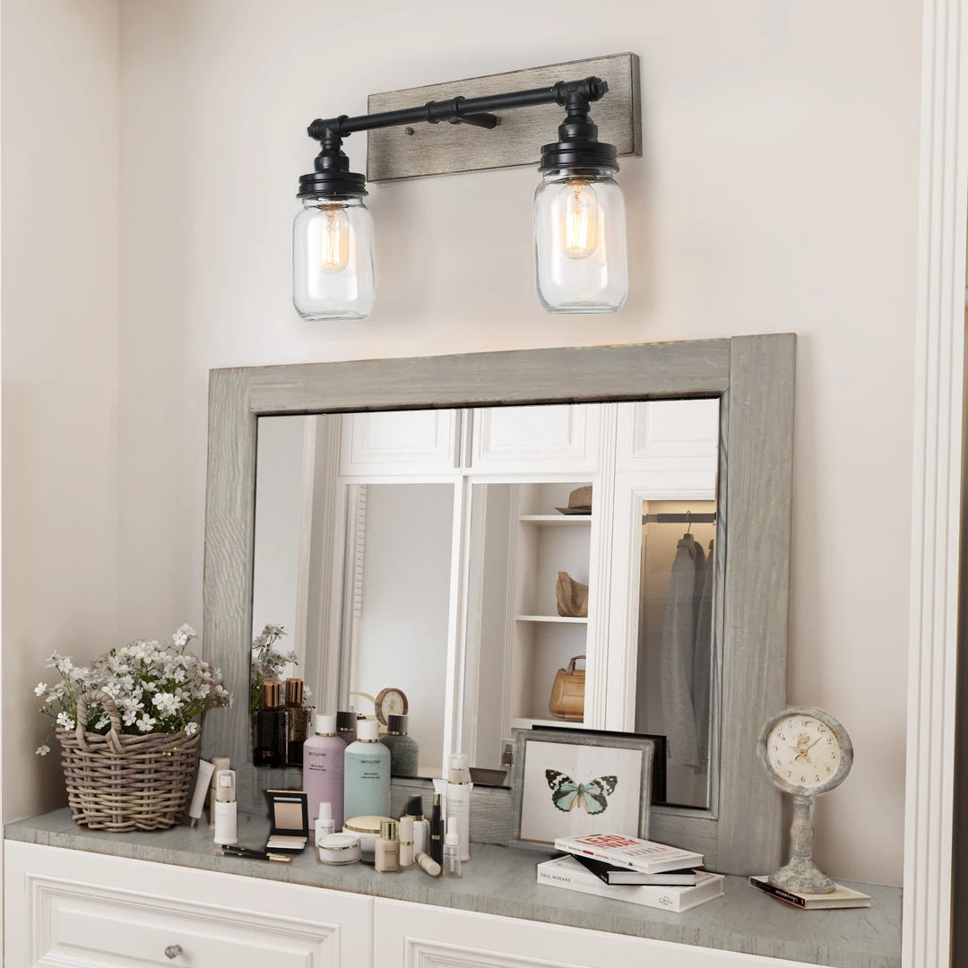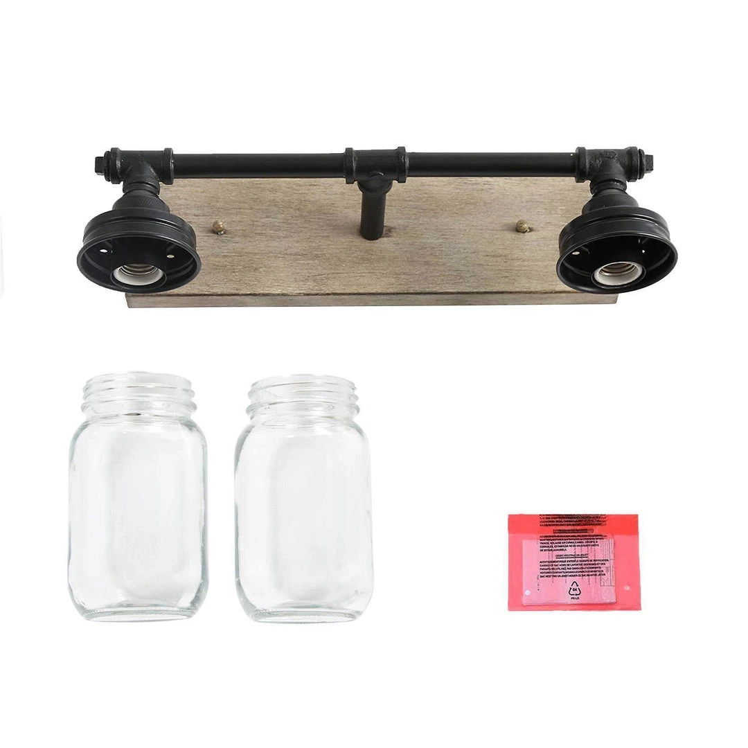 This handcrafted 2-Light wall sconce features 2 quart-size and cute mason jars with polished black bar, which steadily connect two little fairies. This unique farmhouse design gives people a feeling of days gone but beauty never fades in your stylish space. It can add a romantic atmosphere to your bathroom, dressing room, or above the mirror of your foyer.