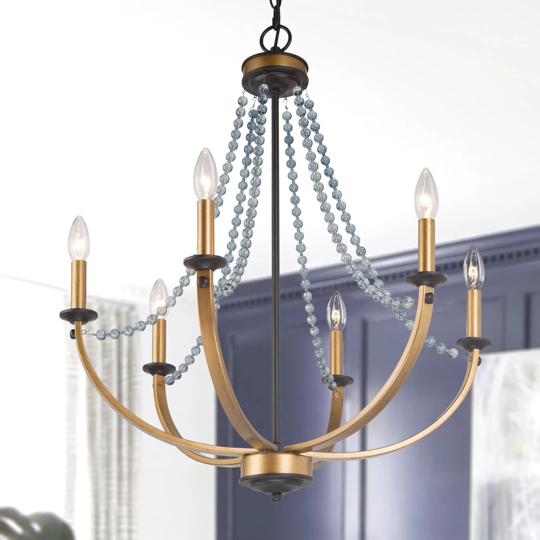 Draped with beads galore from the top to each candelabra with endless amounts of charm. This collection is glamorous in design finished in gold and black, adding an elegant charm to your styles palette. This chandelier will add instant drama to a bedroom, living or dining room, or foyer!
