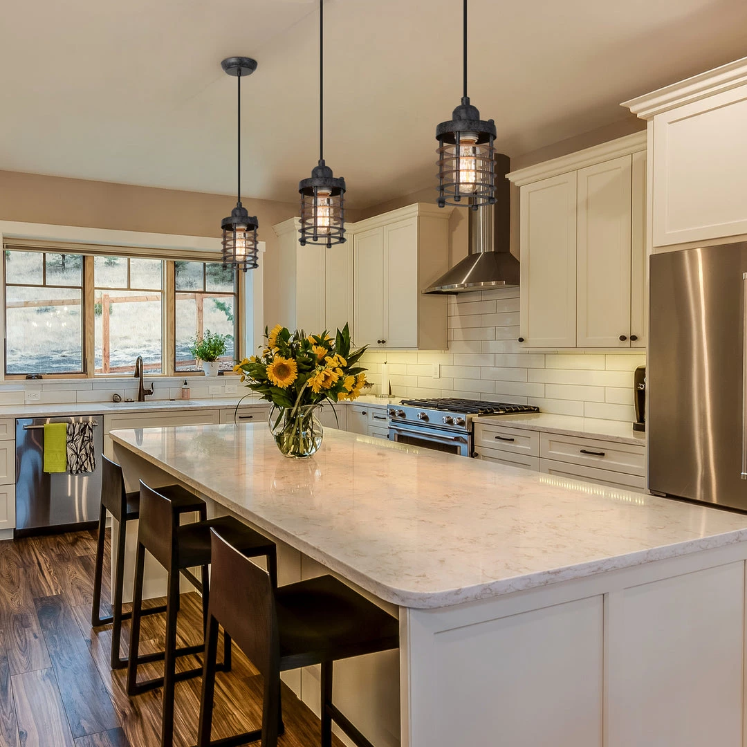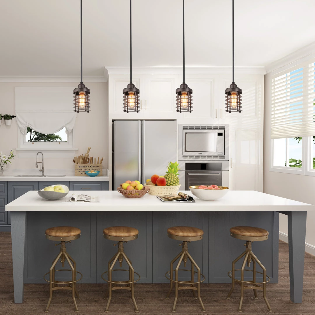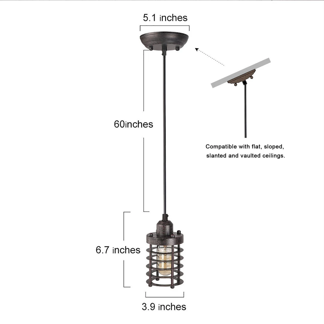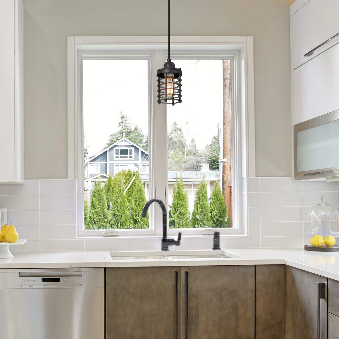 This single-light mini pendant features an industrial-inspired cage design, giving off a modern accent to a sleek collection. The mini pendant has a rust-colored finish for a dynamic effect. The bottom is open to allow for easy bulb changes for residential kitchens, hallways, and entryways.