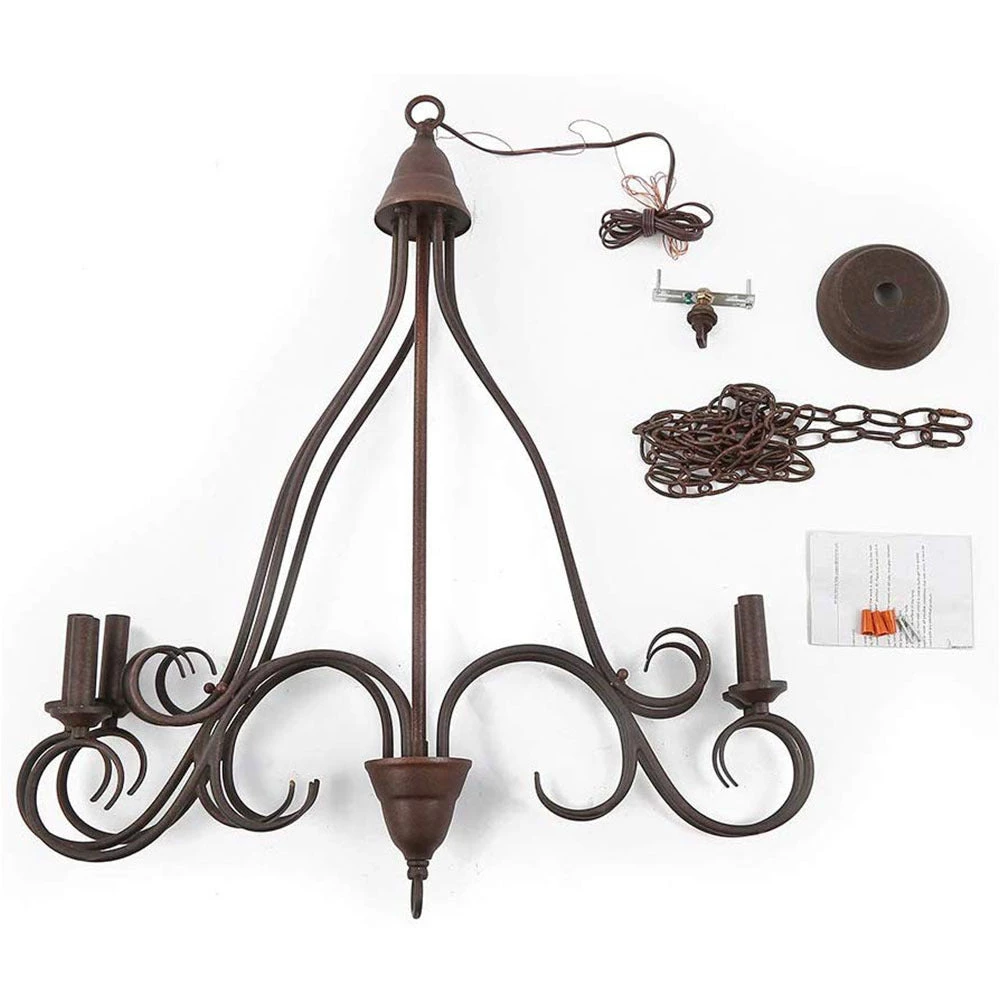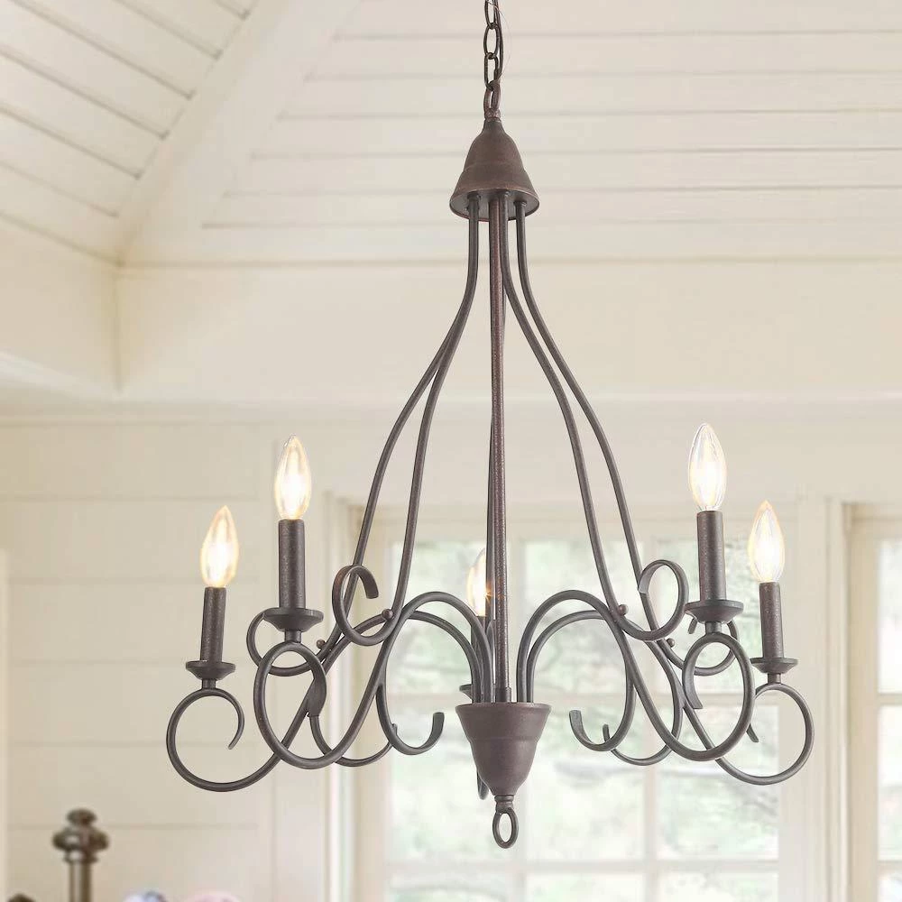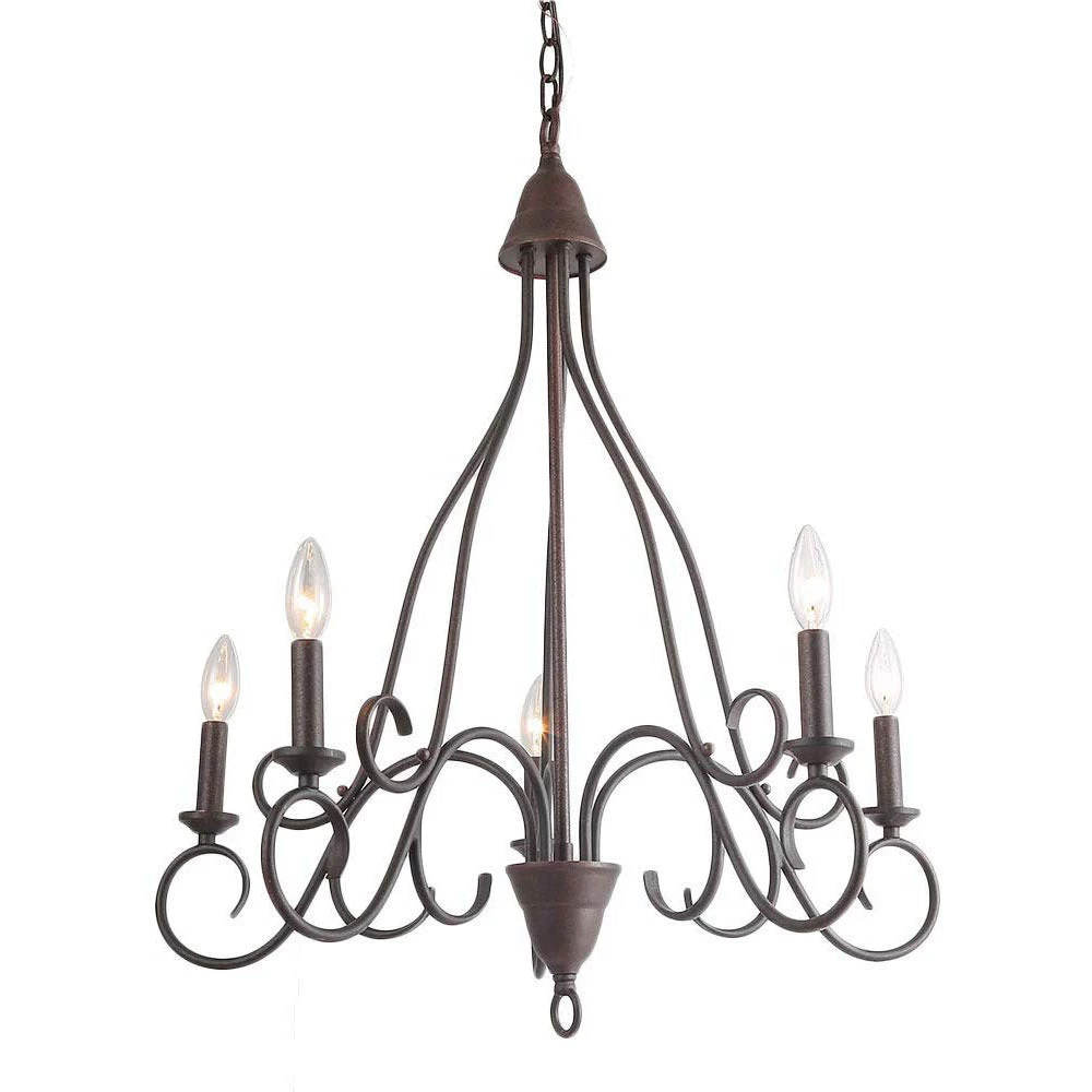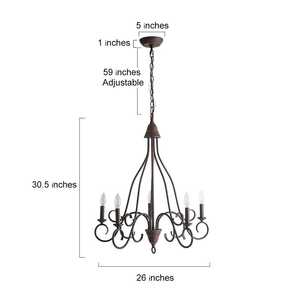 Being crafted in a rusty metal finish, this design features 5 candle-shaped bulb stems with dish cups, placed on 5 curved iron arms. The five curved arms topped by five illuminating candlesticks suits both modern and traditional home styles. This chandelier was specially designed to brighten up the heart of your cozy rooms whether it was a kitchen, dining room, entryway, or bedroom, it fits most transitional-styled places.