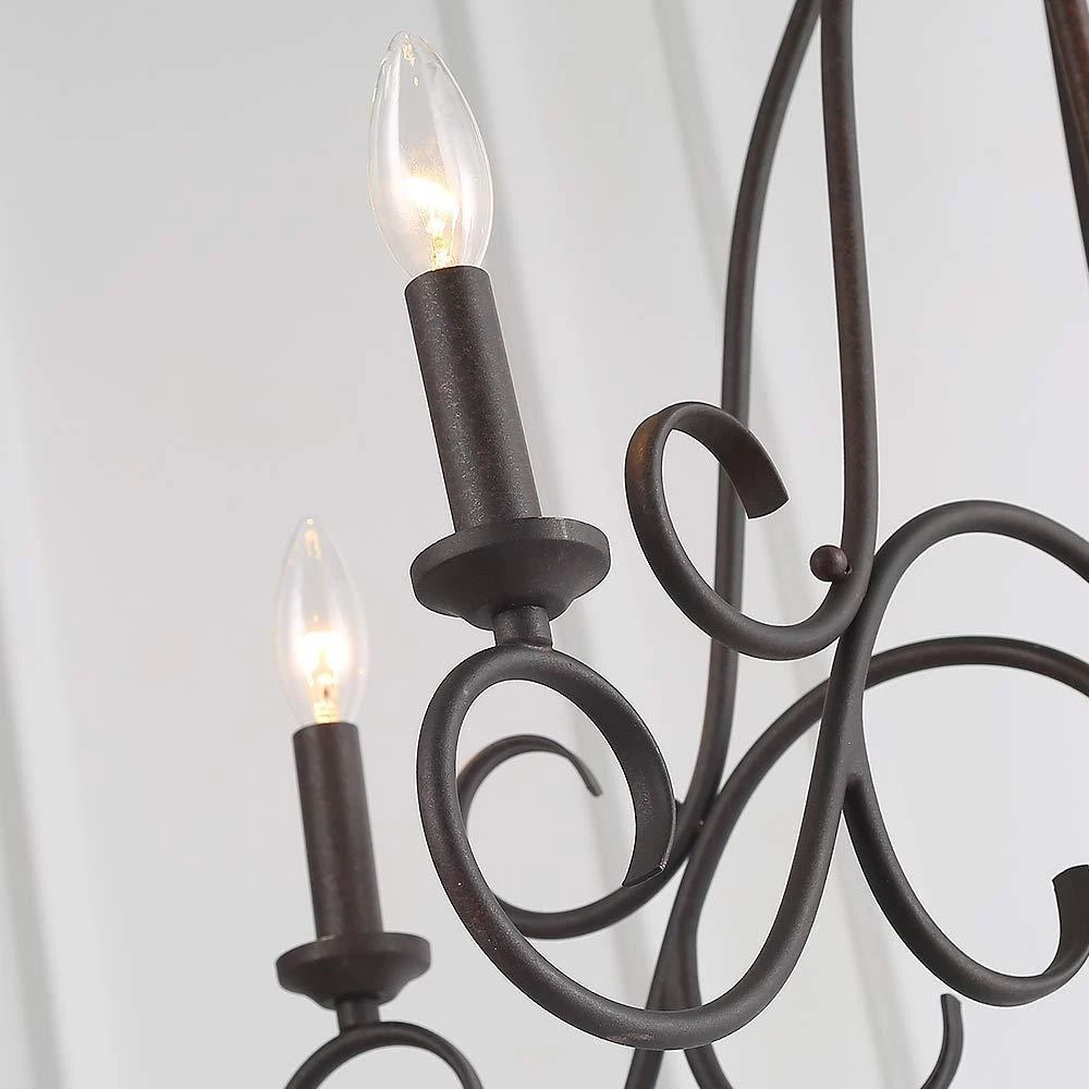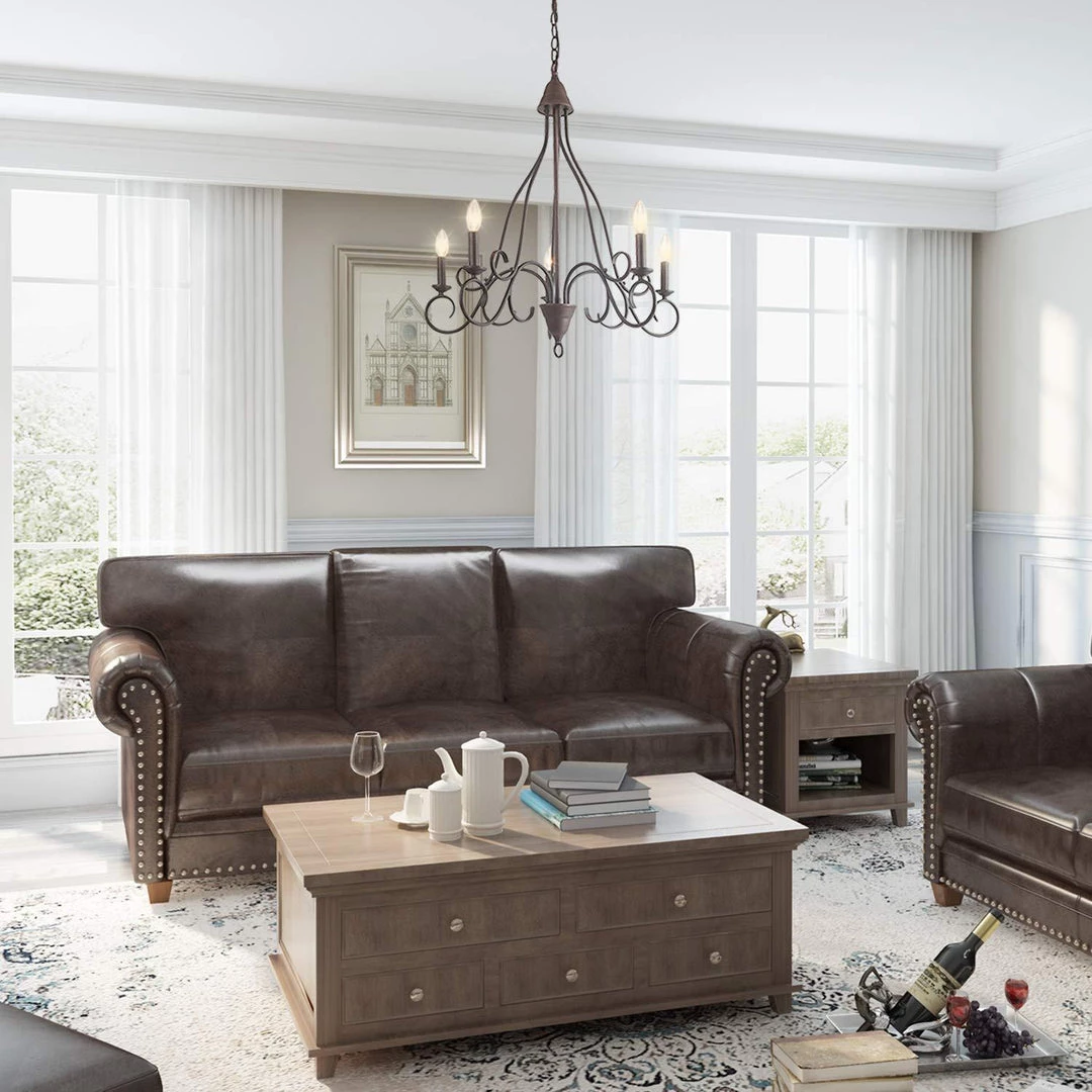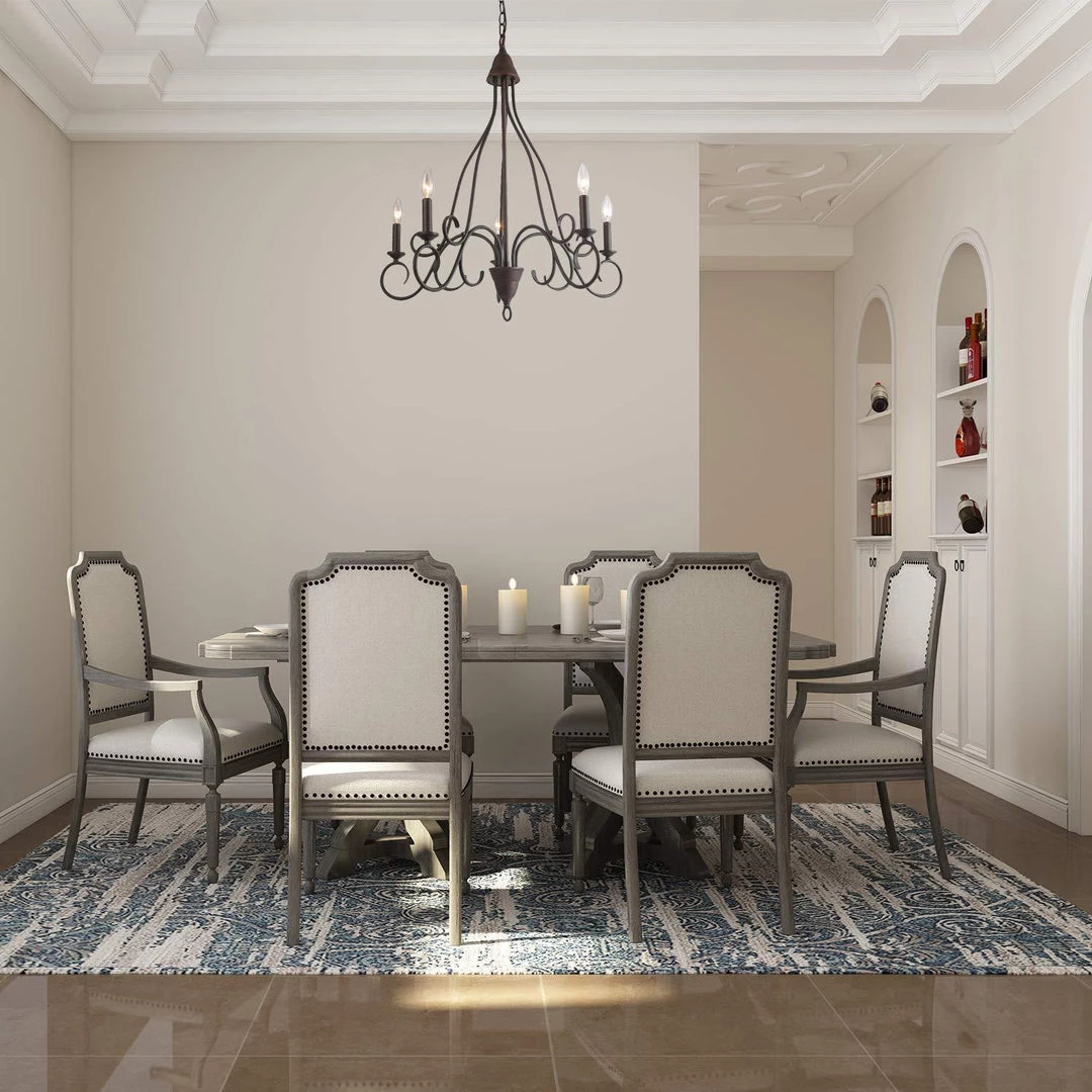 Being crafted in a rusty metal finish, this design features 5 candle-shaped bulb stems with dish cups, placed on 5 curved iron arms. The five curved arms topped by five illuminating candlesticks suits both modern and traditional home styles. This chandelier was specially designed to brighten up the heart of your cozy rooms whether it was a kitchen, dining room, entryway, or bedroom, it fits most transitional-styled places.