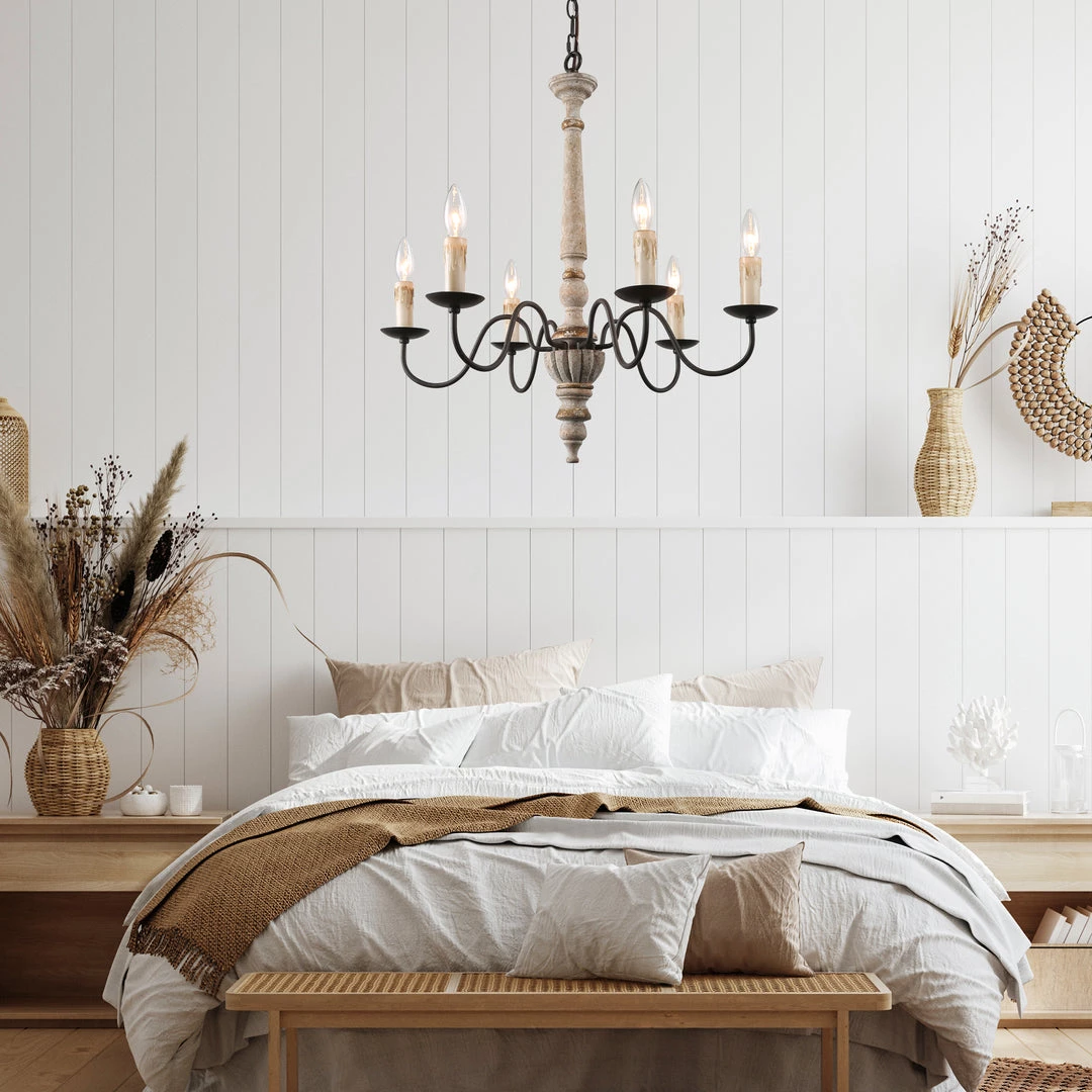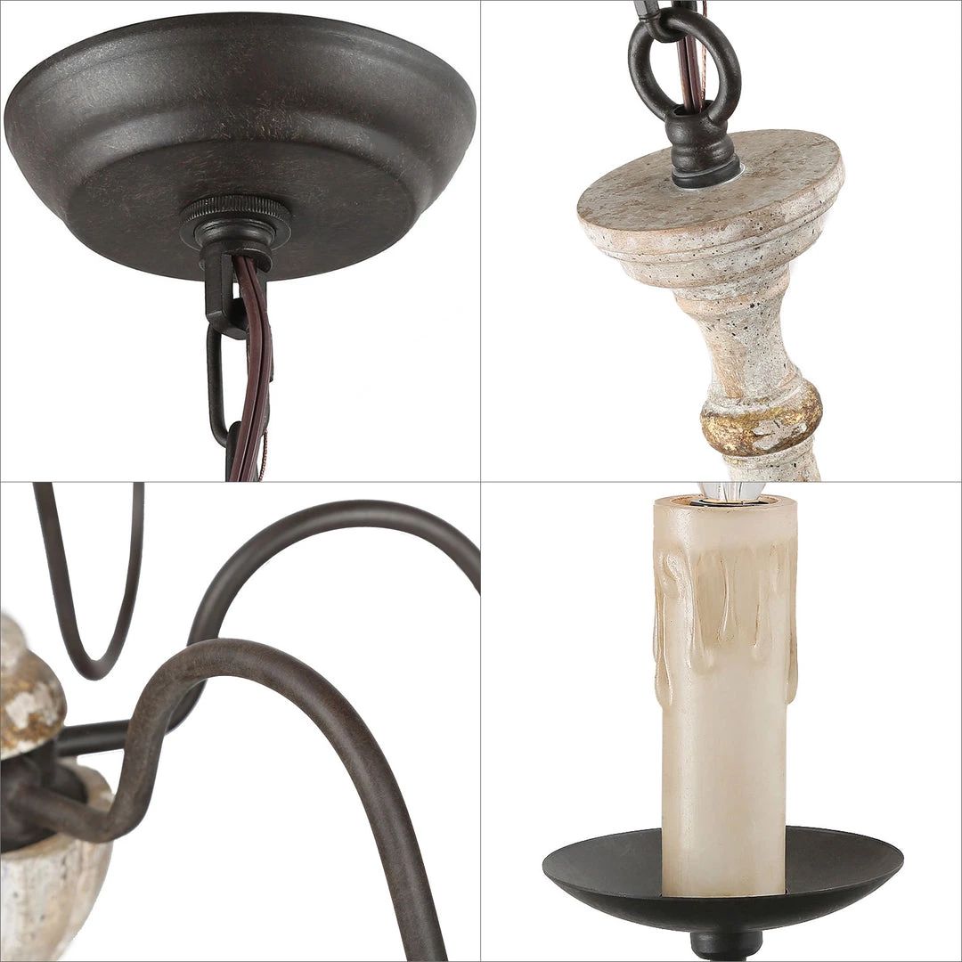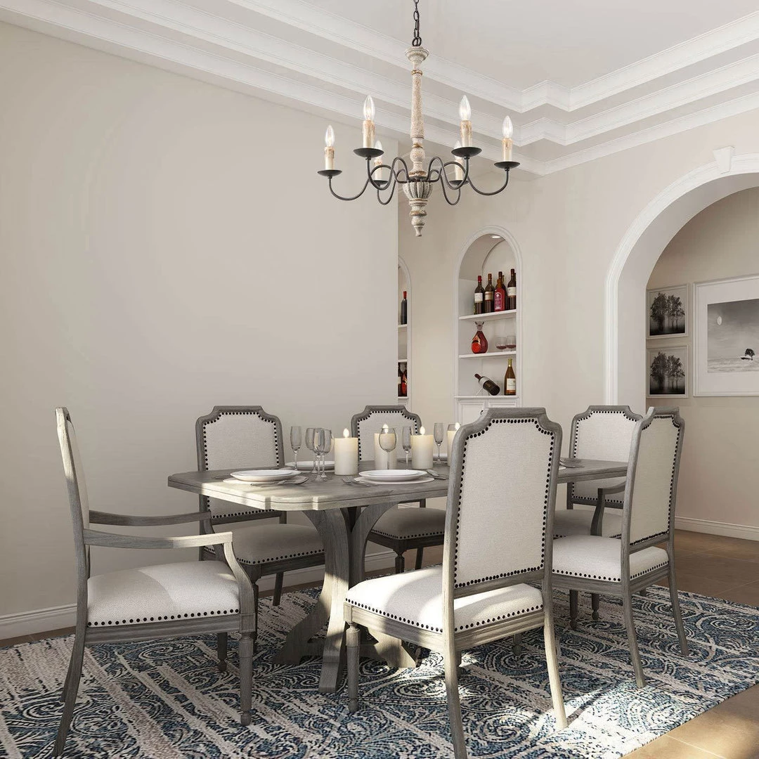 Brimming with rustic countryside flair, the 6-light+farmhouse+chandelier features beautifully curved arms, a hand-carved wood center column, and a Persian white finish. Antiqued distressing and rust finish gives it a rich texture and well-worn appearance.