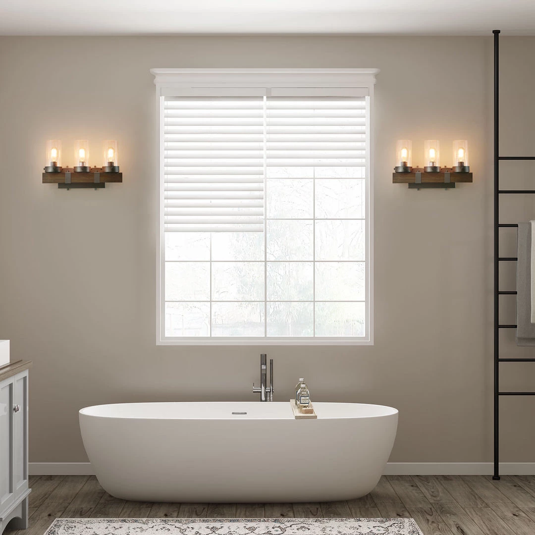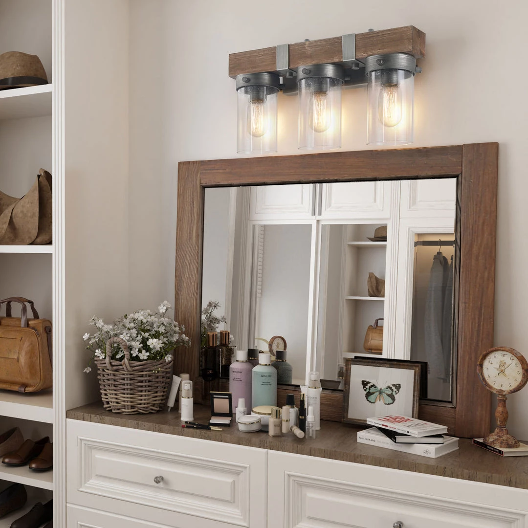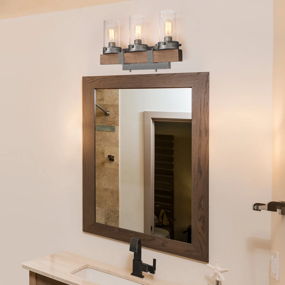 The cylindrical bubbled glass softly diffuses the light and cast a warm upwards/downwards glow. Simple chic yet rustic wall lighting for bathroom, especially designed to illuminate the heart of your vanity, bathroom or farmhouse styled places. Crafted of real wood and hand-applied brushed antique silver finish, this vanity lighting features a rectangular frame for a vintage appearance.