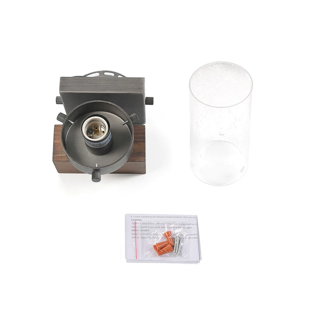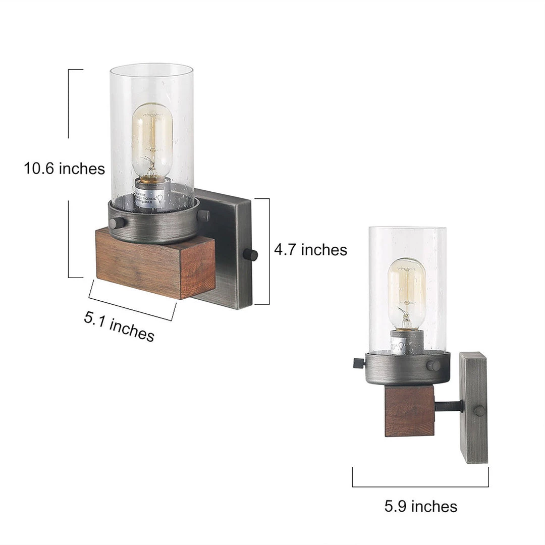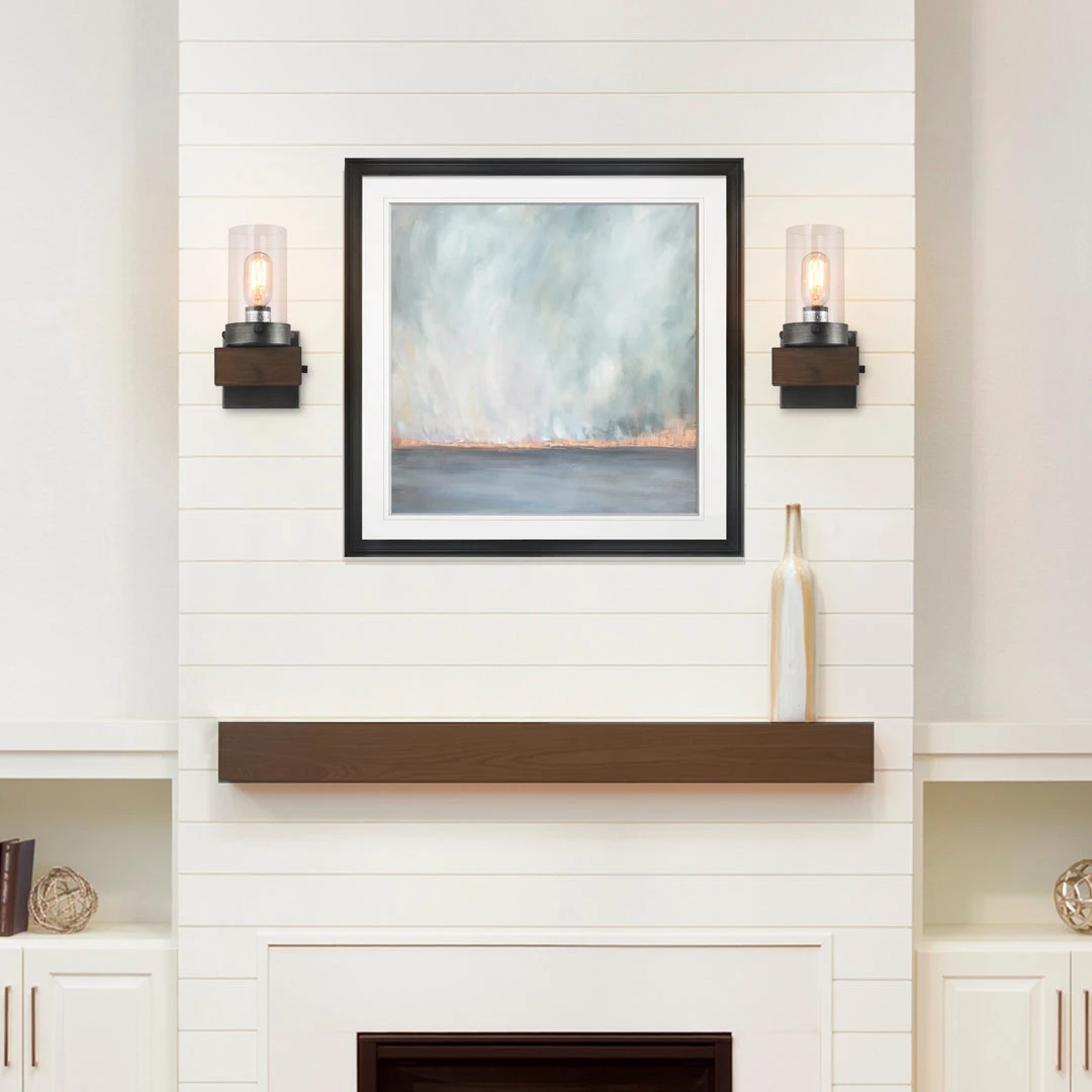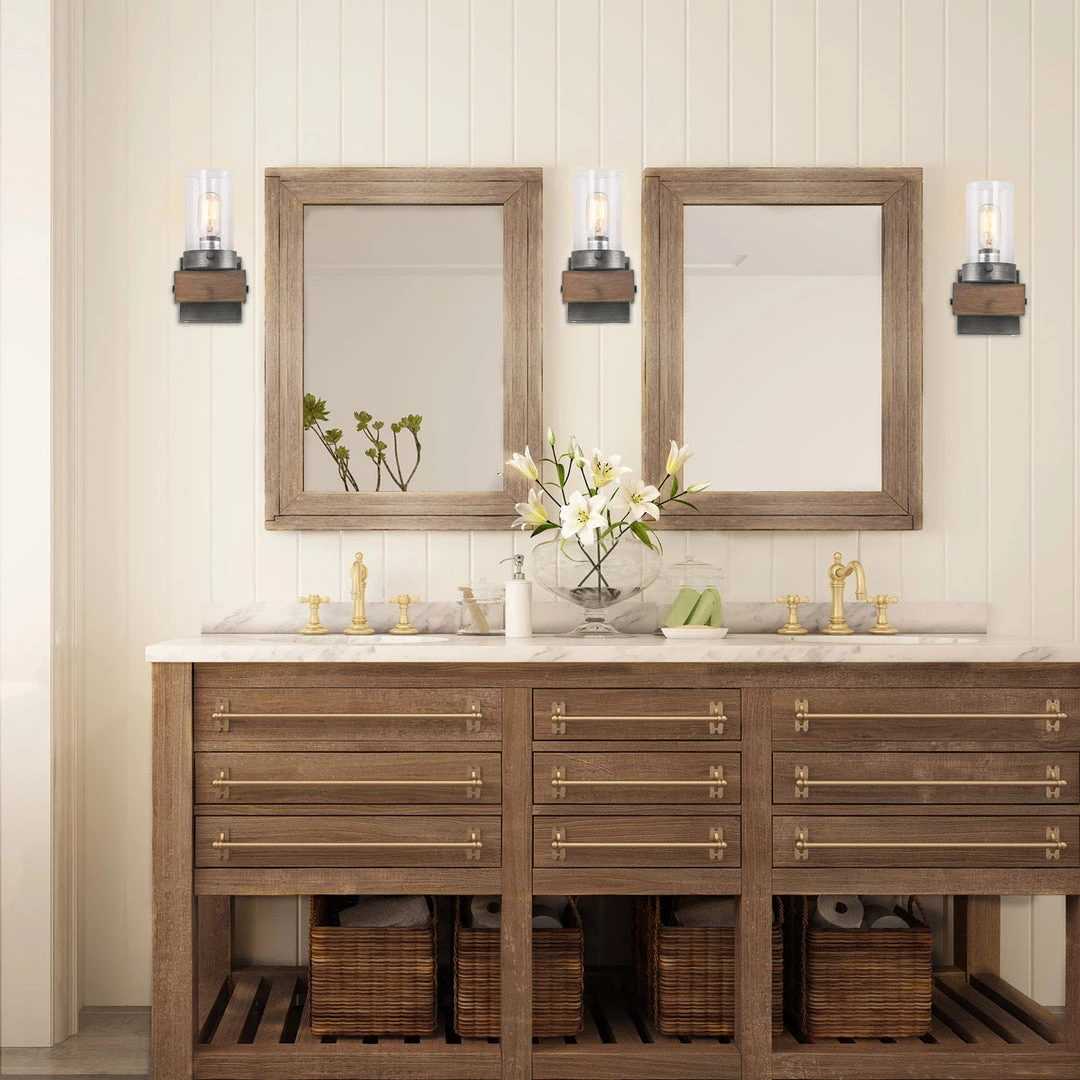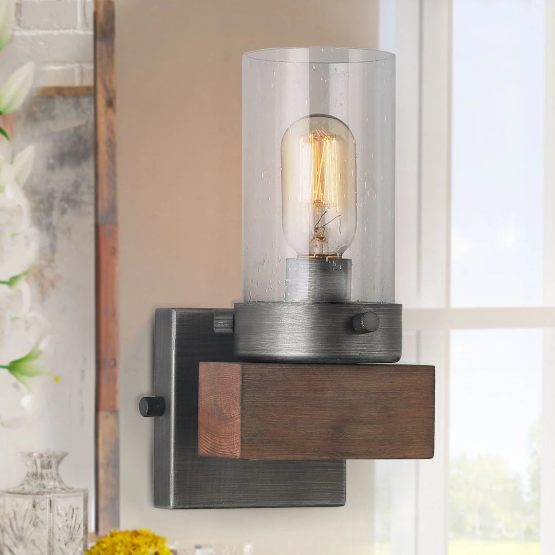 This sconce has a modern body with a rustic wooden base that exudes farmhouse charm.