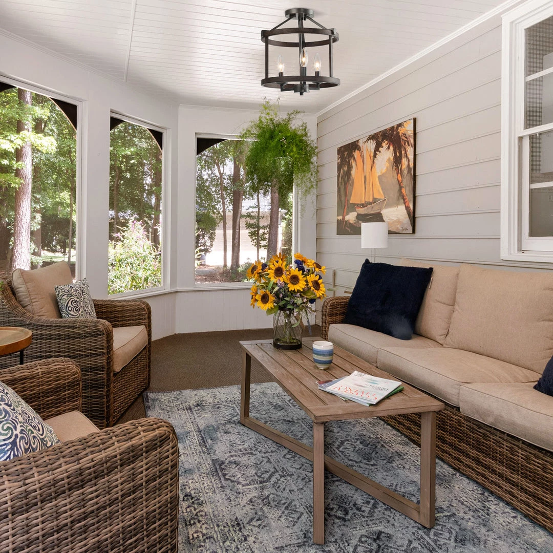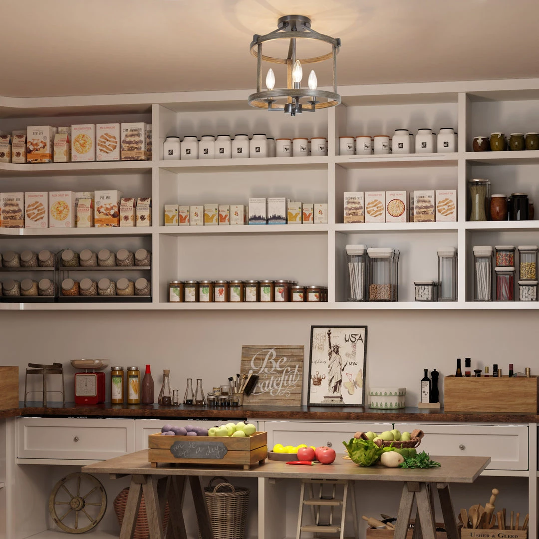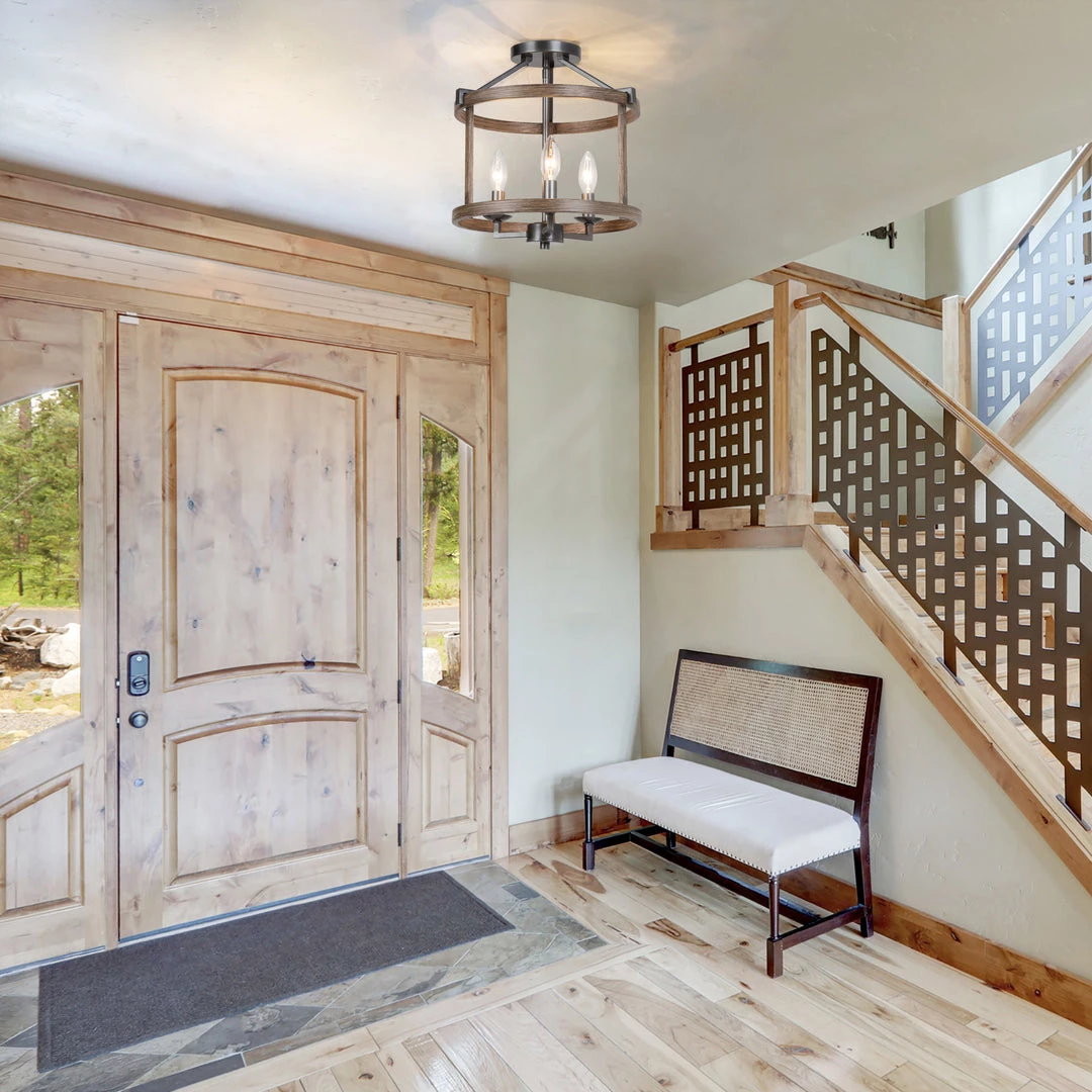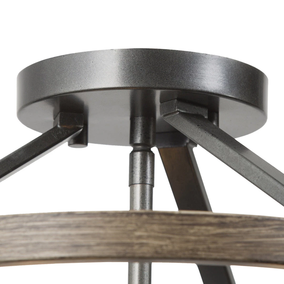 Sleek angles, pure geometry, and rustic finishes combine to make a modern statement. A classic silhouette gets a taste of today with this contemporary three-light semi-flush mount. Lantern-shaped frame line the sides of the light fixture, ornamented by rust iron.