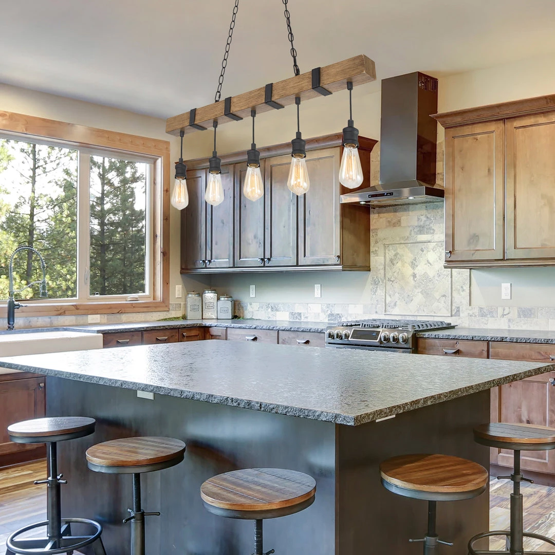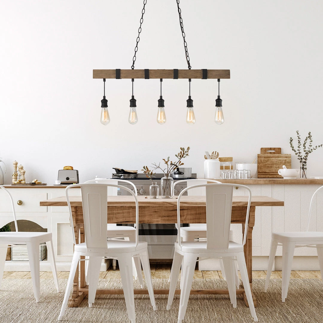 This farmhouse chandelier features clean lines and a minimalist silhouette that fits perfectly into today’s design trends. With the farmhouse charm intertwined with a bit industrial style, it would be a fascinating addition to your sweet home. It’s wood finish gracefully complements the black detailing and exposed bulbs. Perfect for over kitchen island area.