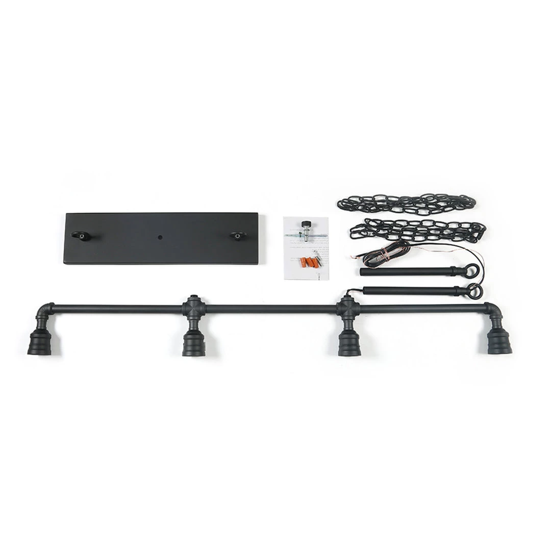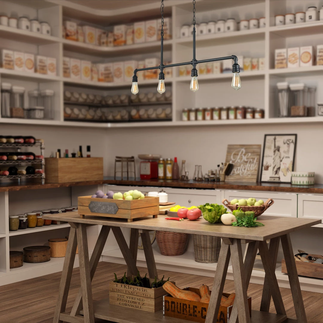 Simple pipe-shaped chandelier, specially designed to illuminate the heart of your kitchen, dining room or industrial styled places. Crafted of metal in a handsome oil rubbed black finish, this design features 4 water-drop-inspired glass shades dropping from a linear straight pipe-shaped base.