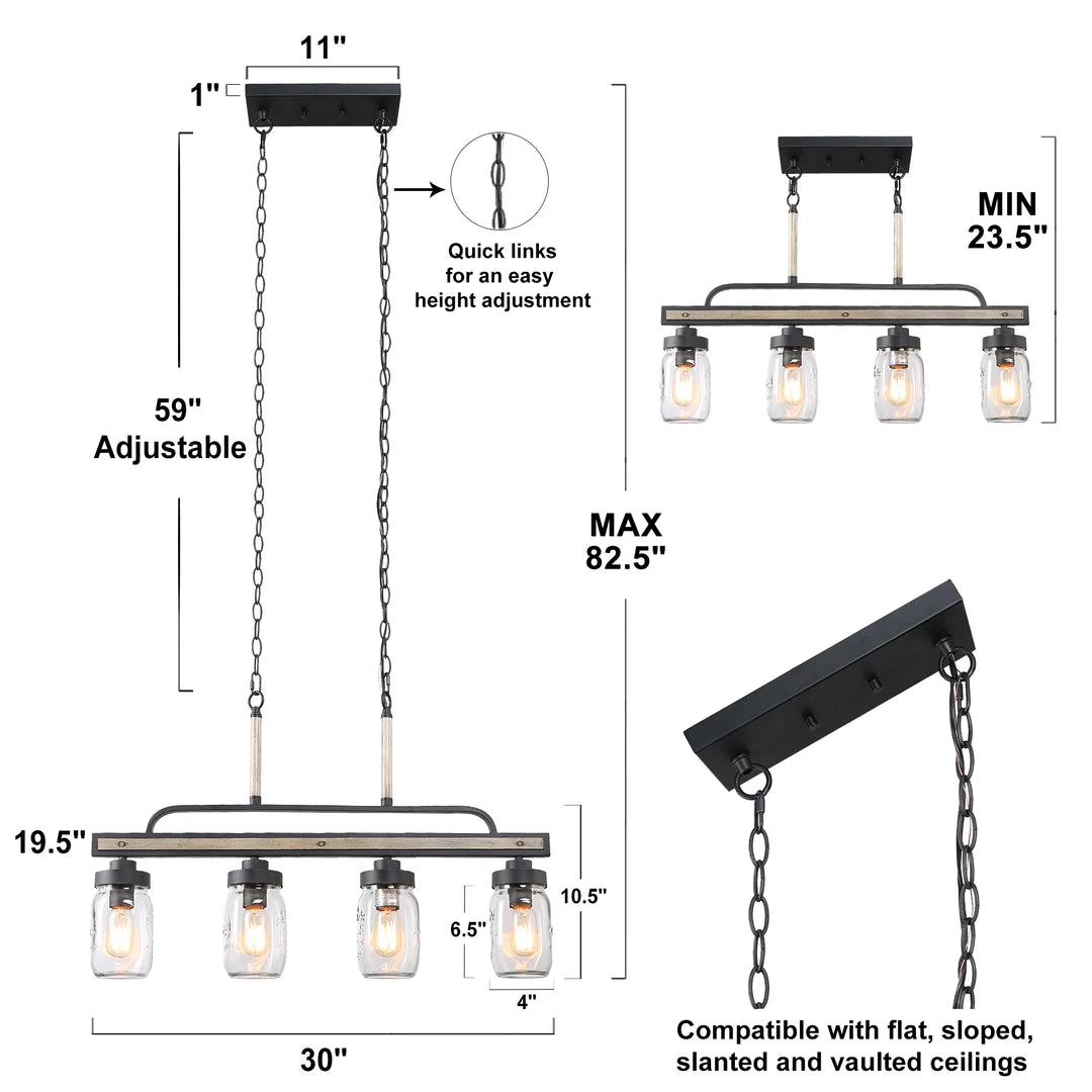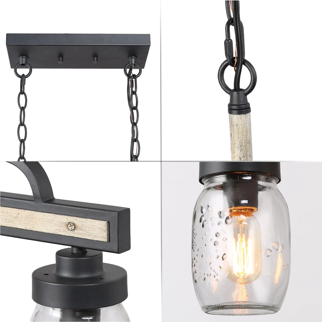 Simple linear island pendant lighting, especially designed to illuminate the heart of your kitchen, dining room or farm styled places. Crafted of metal in painting deep gray and rustic faux wood finish, this design features 4 clear Mason jars dropping down from the wood look linear base.