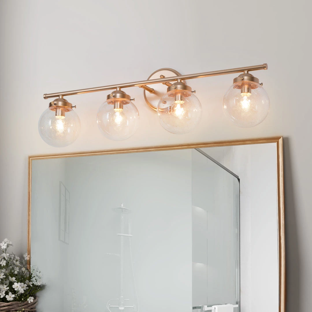 This 4-light seeded-glass Vintage Vanity Light will be a statement piece above your bathroom mirror. The warm vintage gold finish expresses the apparent modern motif of this fixture, while the combination with the seeded glass reaches the perfect harmony of femininity and masculinity.