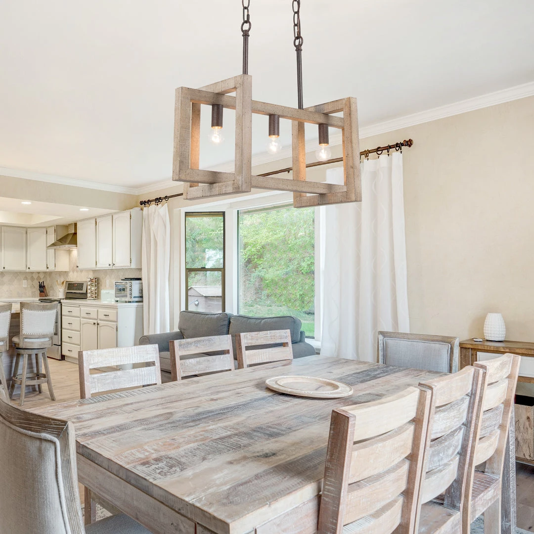 This modern farmhouse chandelier is an element that adds instant personalities and uniqueness to your space. With an open frame design, this fixture allows ample light for any room. The geometric and sleek design infuses fun and elegance when repeated over a kitchen island or hung in a living room or a foyer.