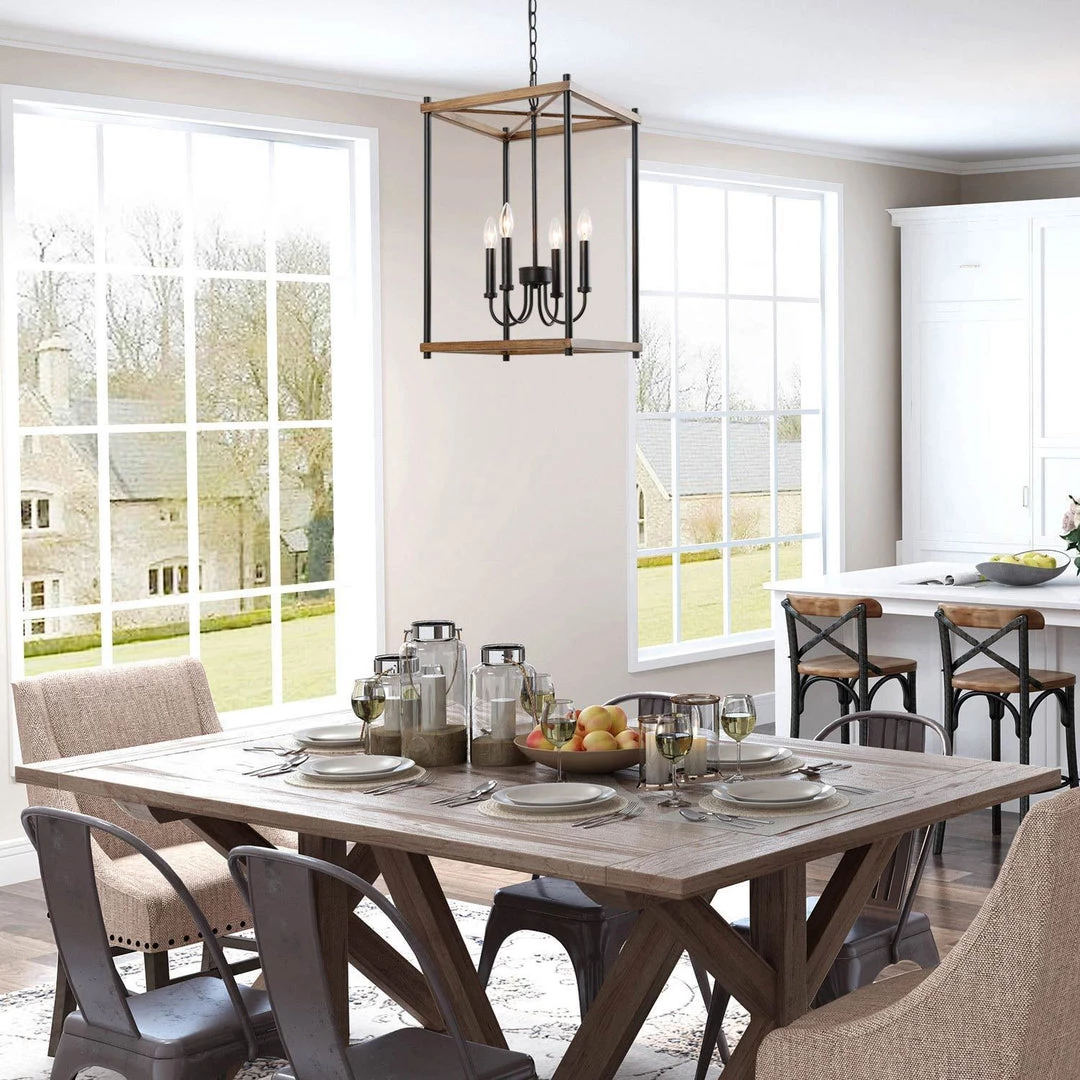 Elements of rustic stylings mix with the industrial details. The wooden frame creates volume and highlights the farmhouse vibe, while the metal details underscore the industrial charm. Perfect to be hung over the kitchen island.