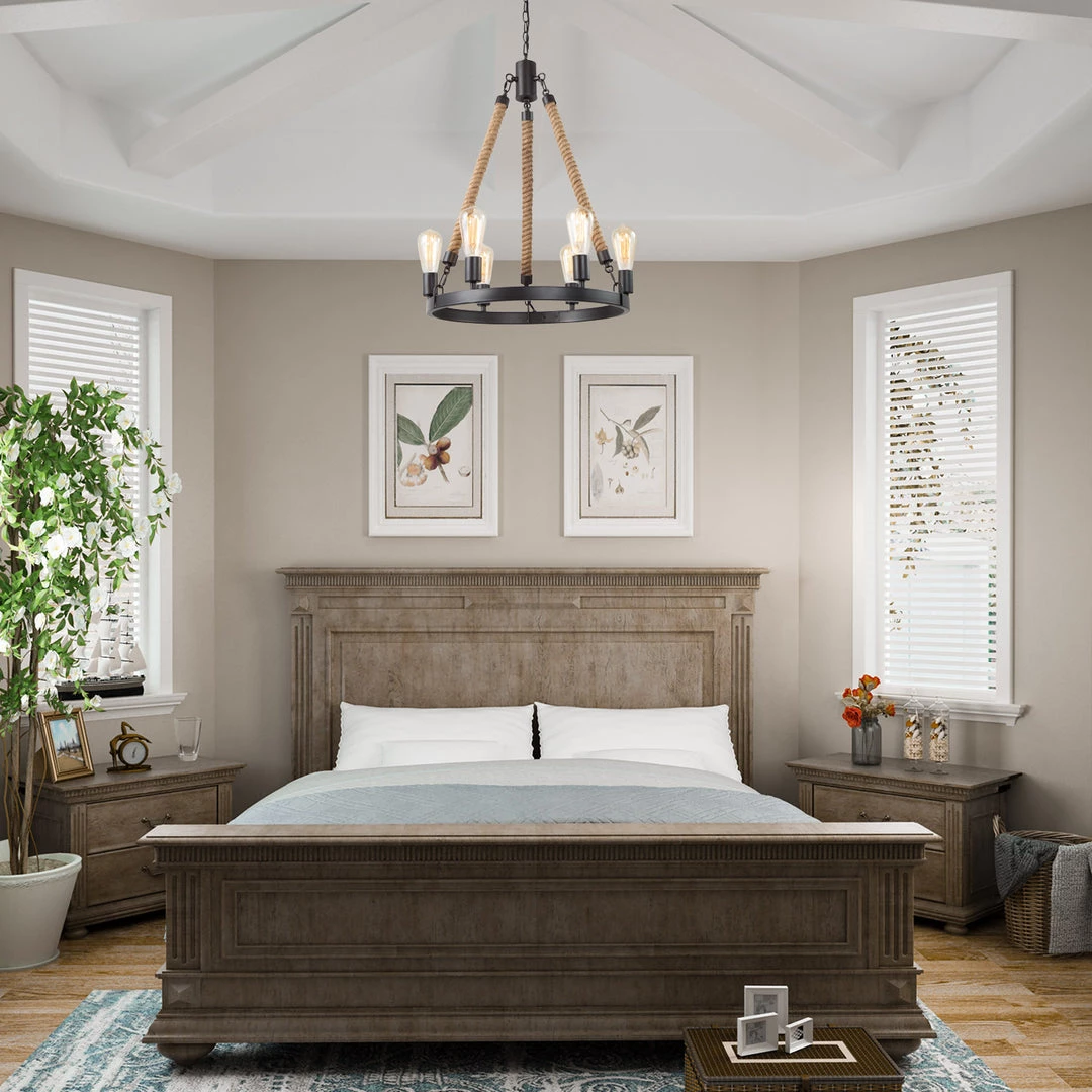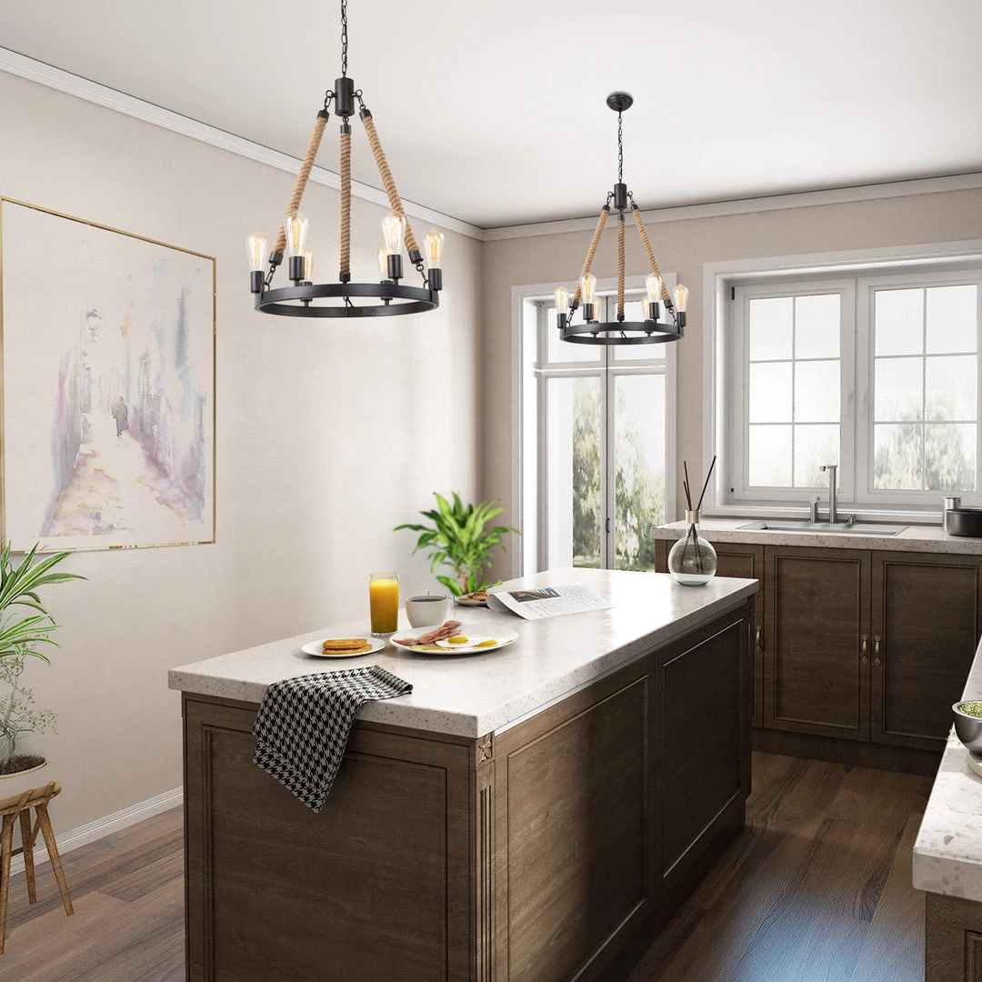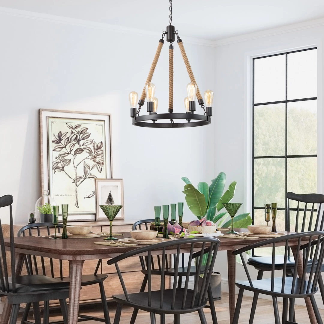 It features a bronze framed fixture with rope-wrapped arms. The frame is hung in place by 3 thick ropes to add charm.