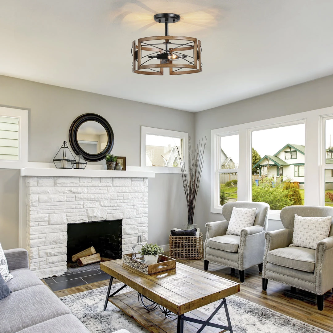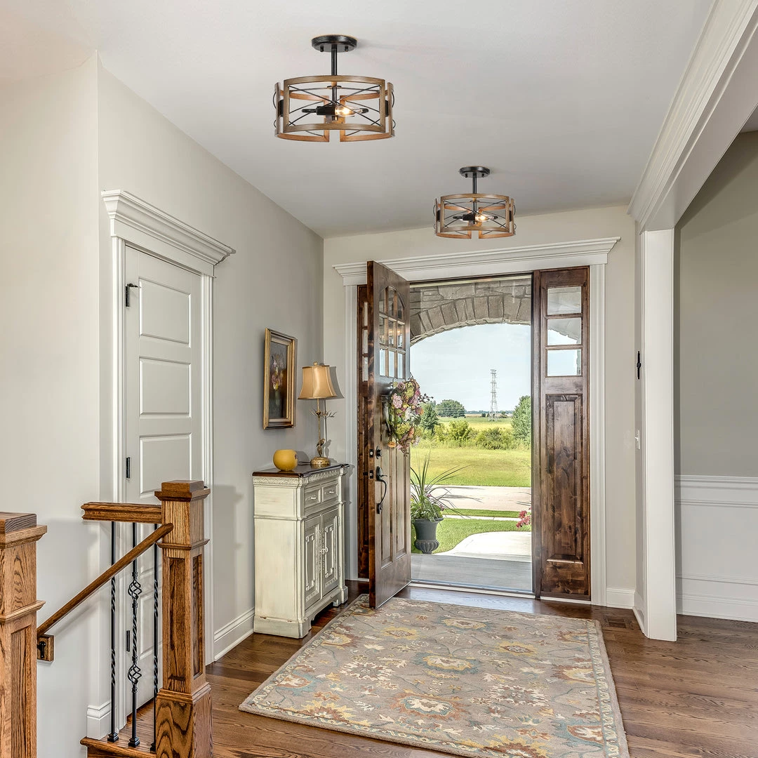 Industrial textured metal combines with rustic farmhouse wood frame in this pendant that adds instant farmhouse chicness to your spaces. Truly a rustic classic, this ceiling light is perfect for a repeated light down your kitchen or foyer.