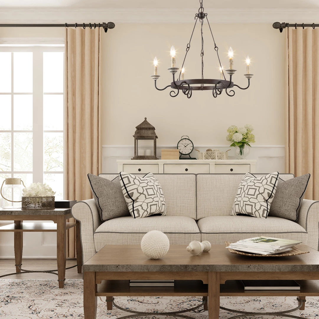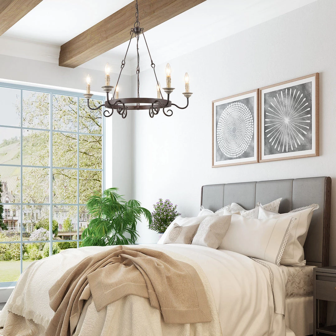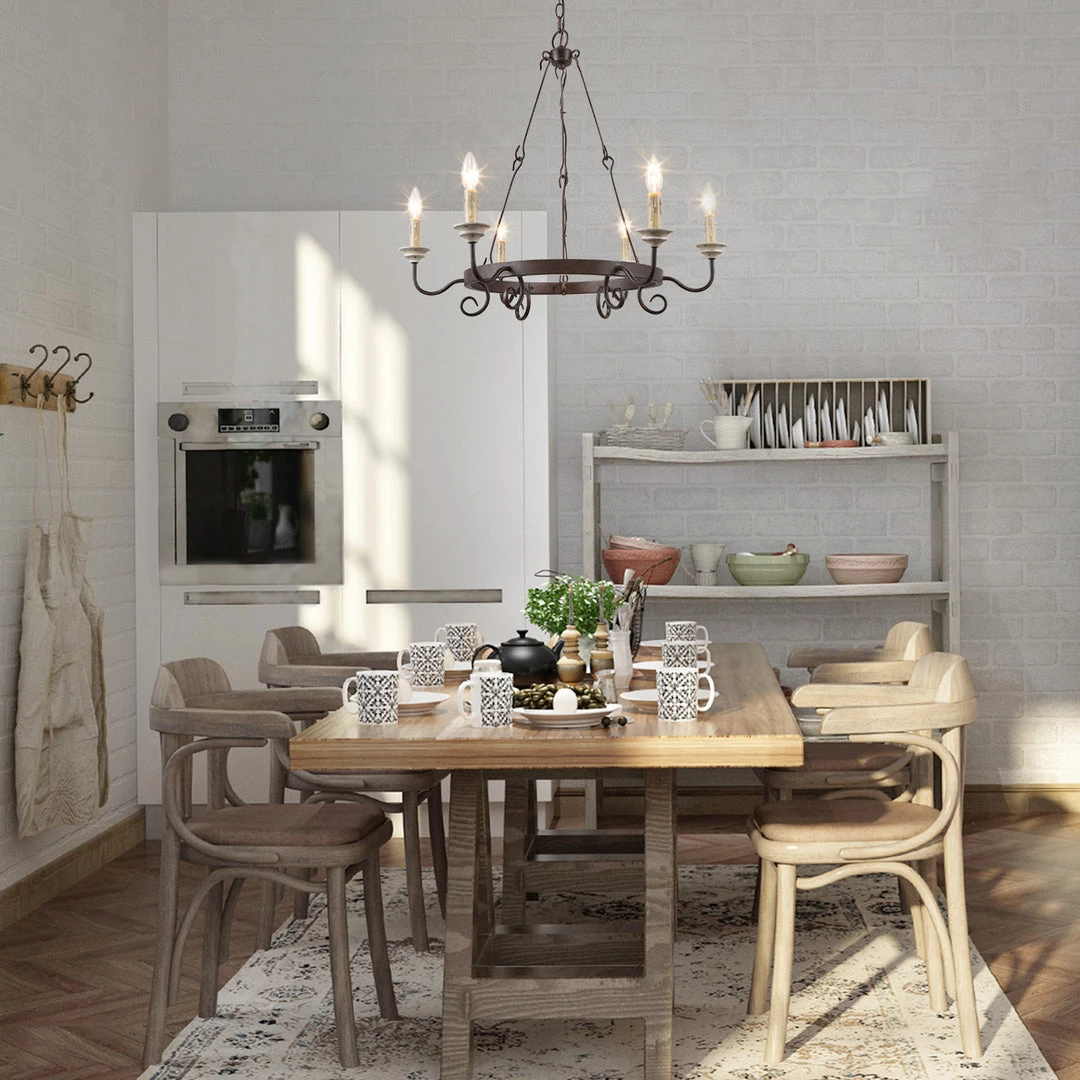 Rustic wagon wheel chandelier, especially designed to illuminate the heart of your living room, foyer, dining room or farmhouse styled places. Crafted of metal in a faux wooden finish, this design features 6 candle-shaped bulb stems with dish cups, placed on 6 simply curved iron arms.