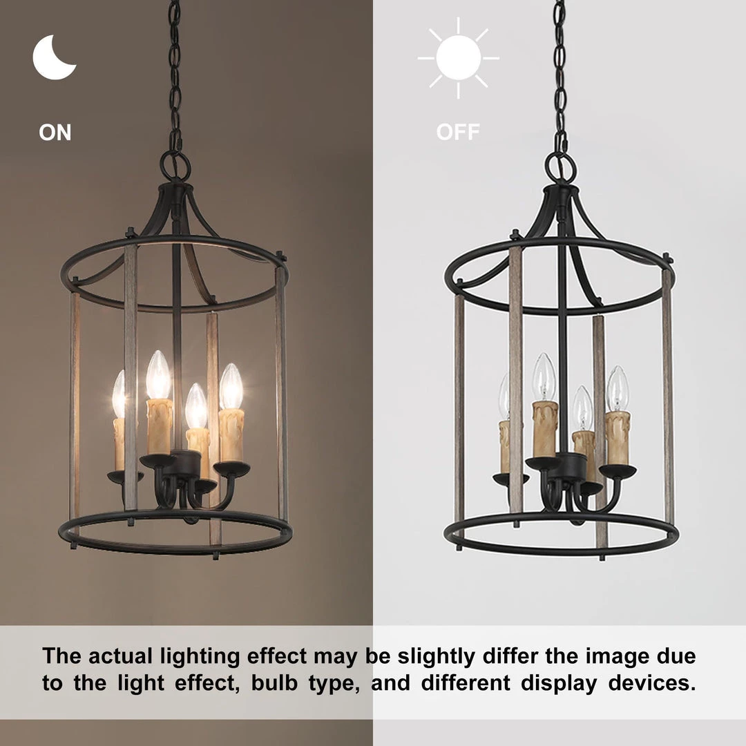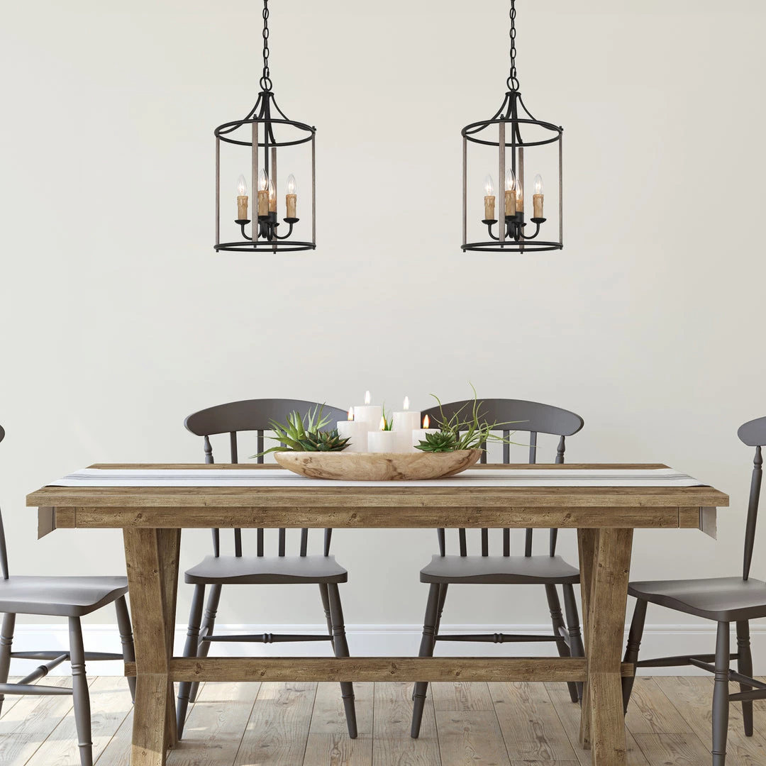 Rustic iron and distressed faux wood complement each other in this rustic lantern pendant. The distressed finish and rustic iron accents complement as well as contrast each other. With an open frame, this light fixture casts enough light to the living room, kitchen and foyer.