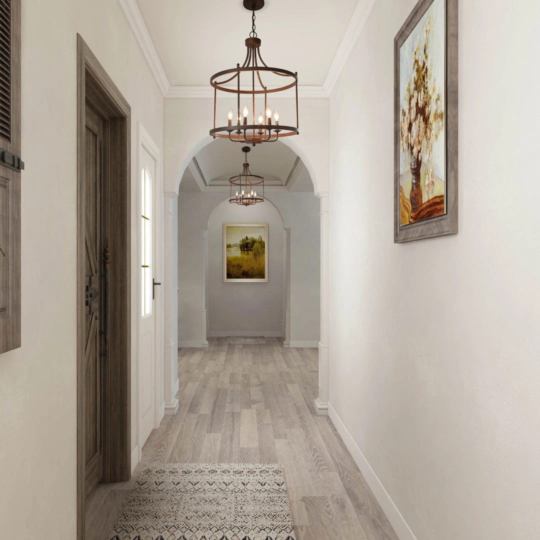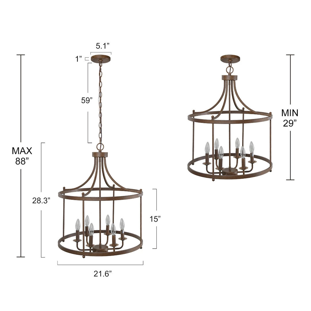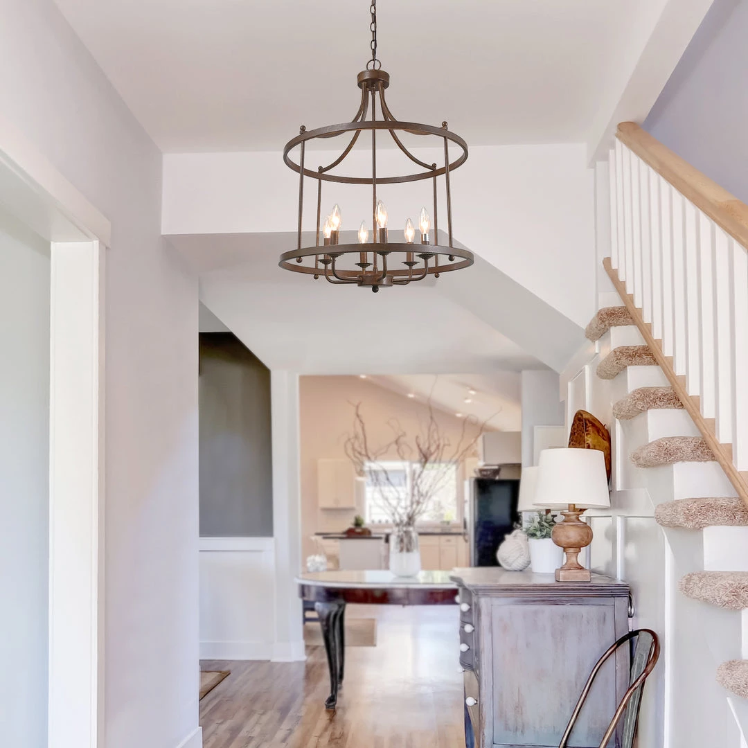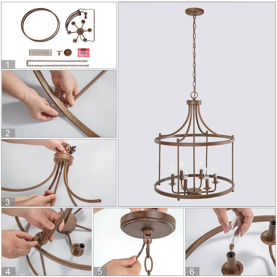 Classic cage-shaped chandelier, specially designed to illuminate the heart of your foyer, entry, or farmhouse/ transitional styled places. Crafted of metal in brown oil rubbed finish, this design features an elegant round drum-shaped base and 6 candle-shaped bulb stems with dish cups. Crafted of metal in an oil-rubbed brass finish, this design features an elegant round drum-shaped base. The chandelier package includes all the necessary assembling and installation parts along with clearly marked cords.