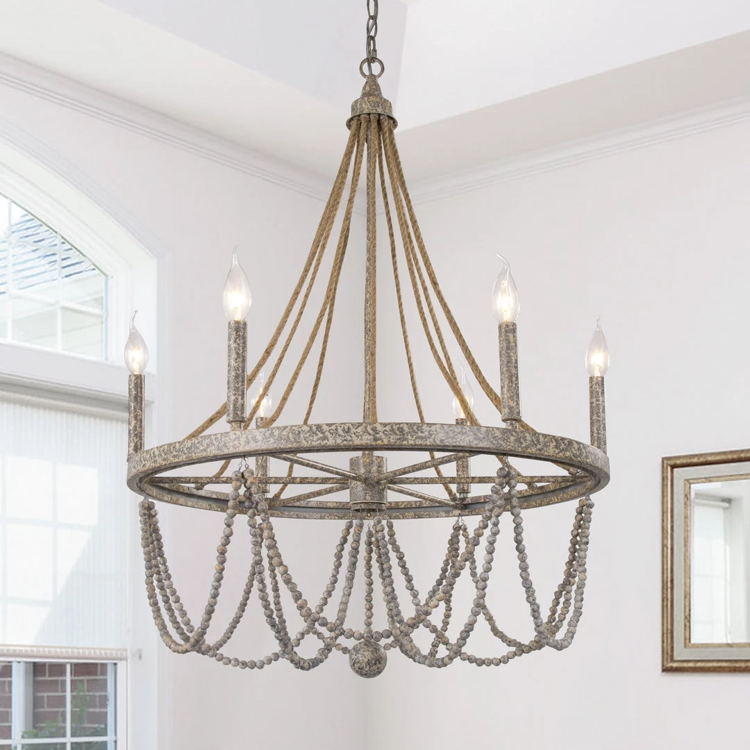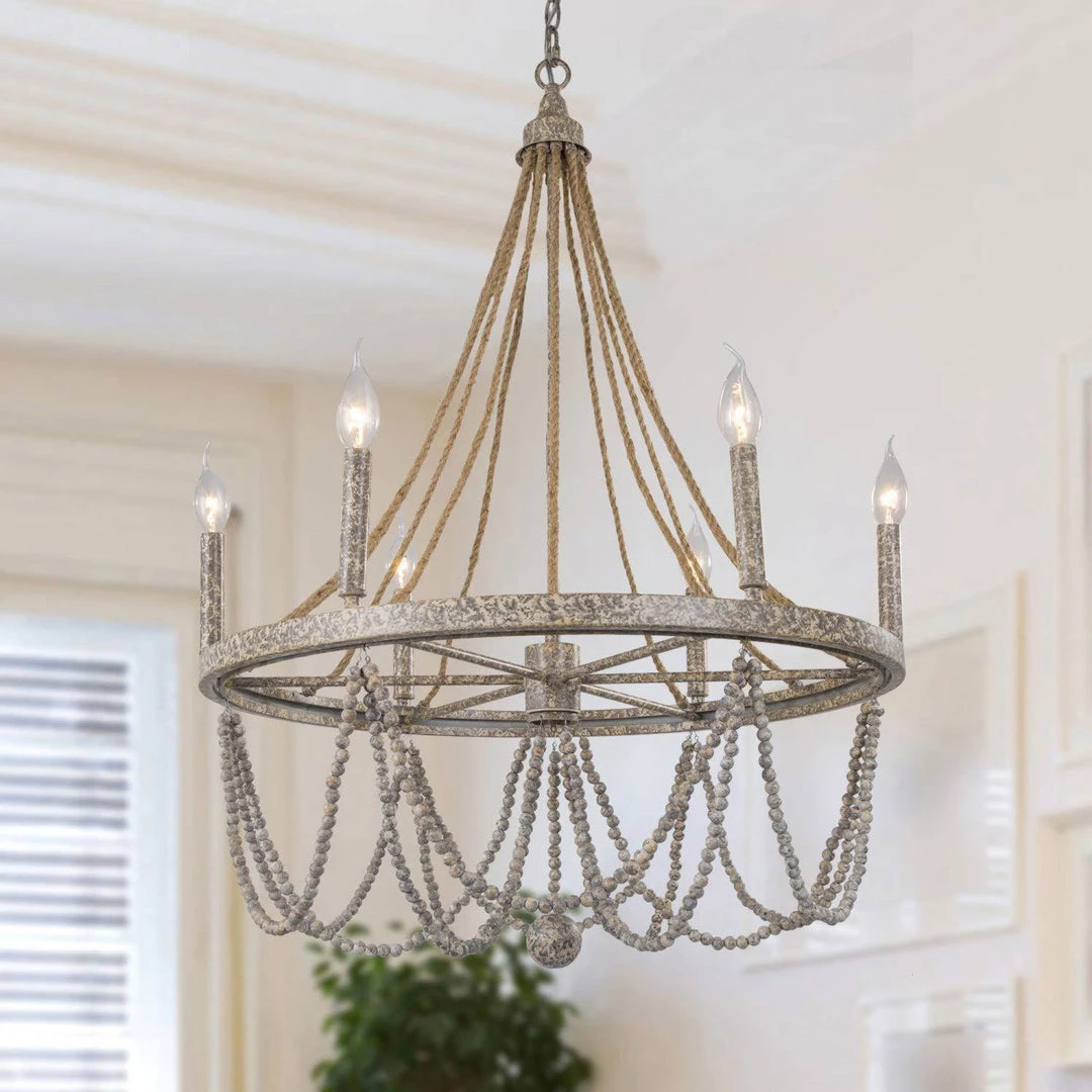 This is a chandelier that will stun all your guests. Elegant with a demure personality, this statement piece has lines of charming wooden beads elegantly hanging around. The marriage of classic style and rustic charm creates this one and only gorgeous piece that creates any space in a dreamland.
