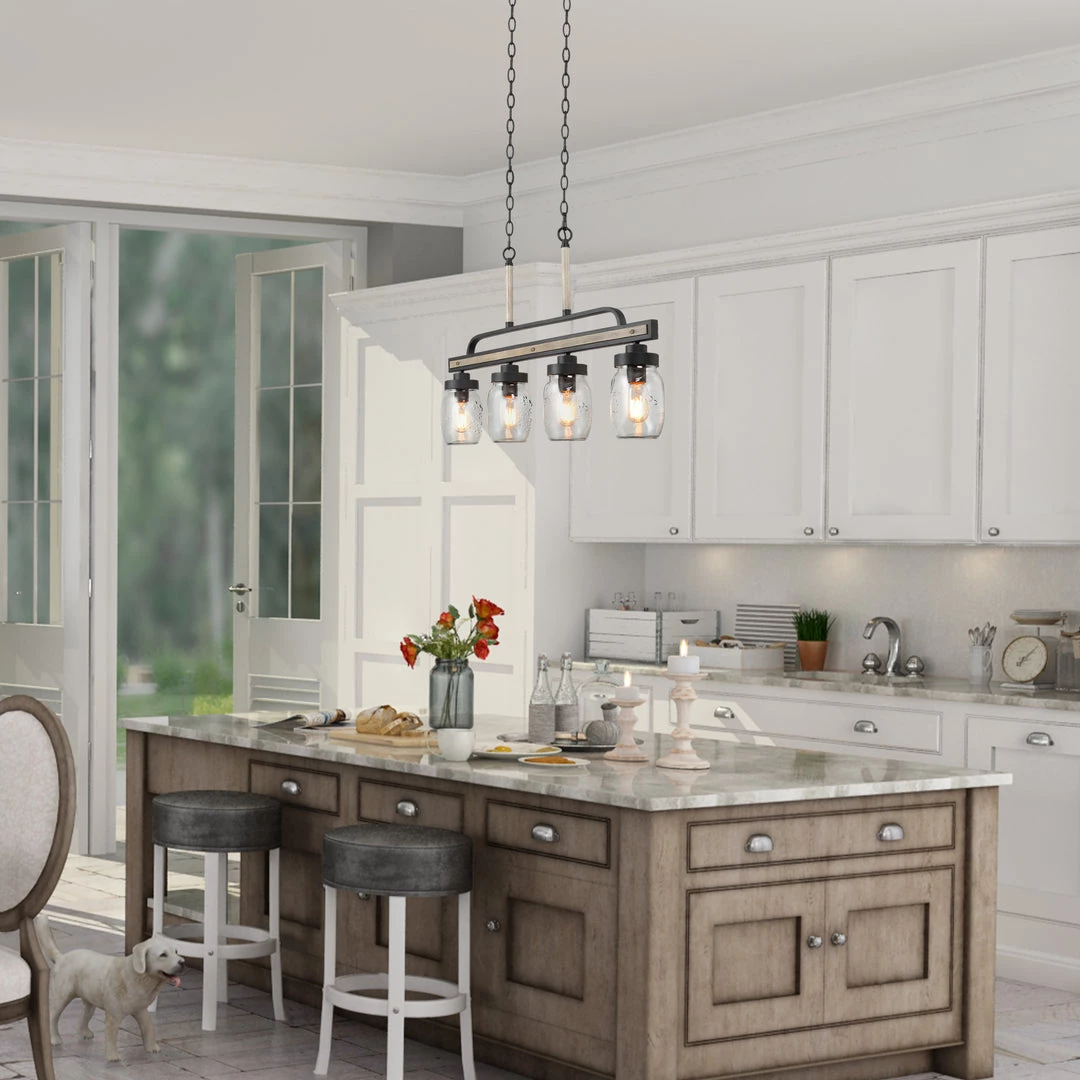 Simple linear island pendant lighting, specially designed to illuminate the heart of your kitchen, dining room or farm-styled places. Crafted of metal in painting deep gray and rustic faux wood finish, this design features 4 clear Mason jars dropping down from the wood look linear base.