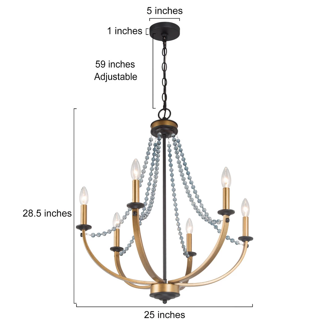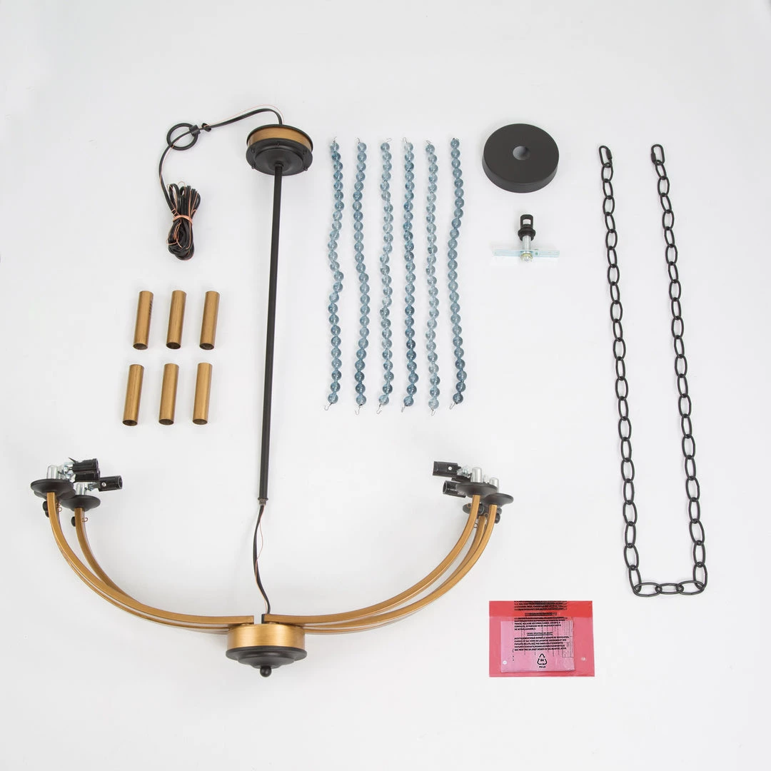 Draped with beads from the top to each candelabra with endless amounts of charm. This collection is glamorous in design finished in gold and black, adding an elegant charm to your styles palette. This chandelier will add instant drama to a bedroom, living or dining room, or foyer!