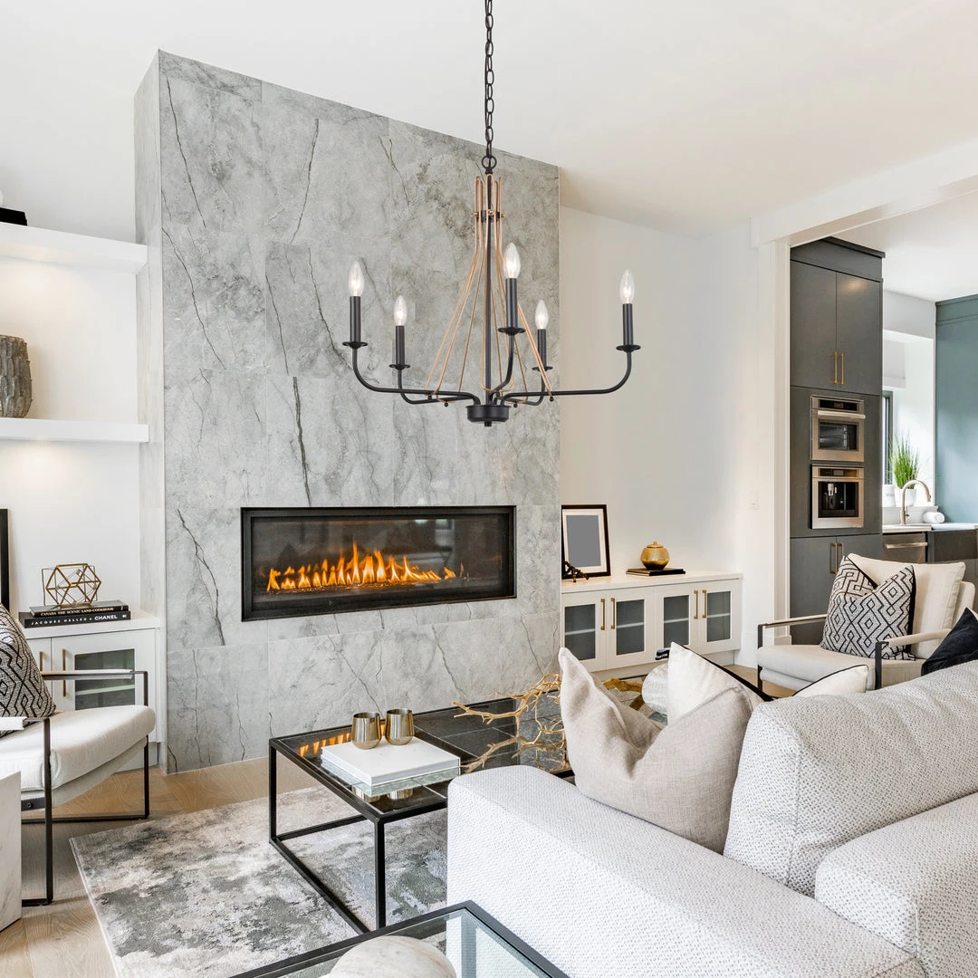 Chic Industrial Black Chandelier, typically designed to shine charmingly in your bedroom, living room, or anywhere you would love to add a touch of modern charm. Crafted of metal in classic black and champagne metal finish, this gorgeous piece features 5 candle-shaped bulb stems, placed on 5 simply curved iron arms.