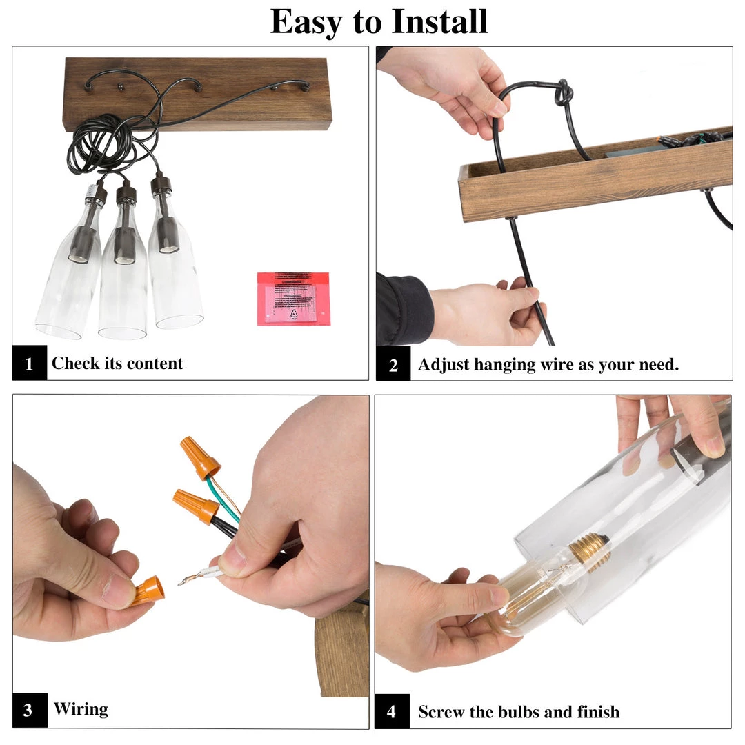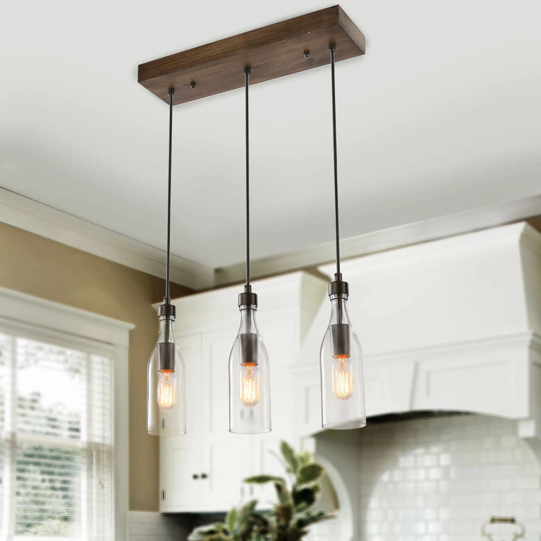Featuring a solid rectangle wooden canopy that holds 3 clear bottle-inspired glass shades, attached by 3 height adjustable cords, this 3-light pendant matches your space whether it is transitional, industrial, modern, or farmhouse style! It is guaranteed to fill your space with lights and joy!