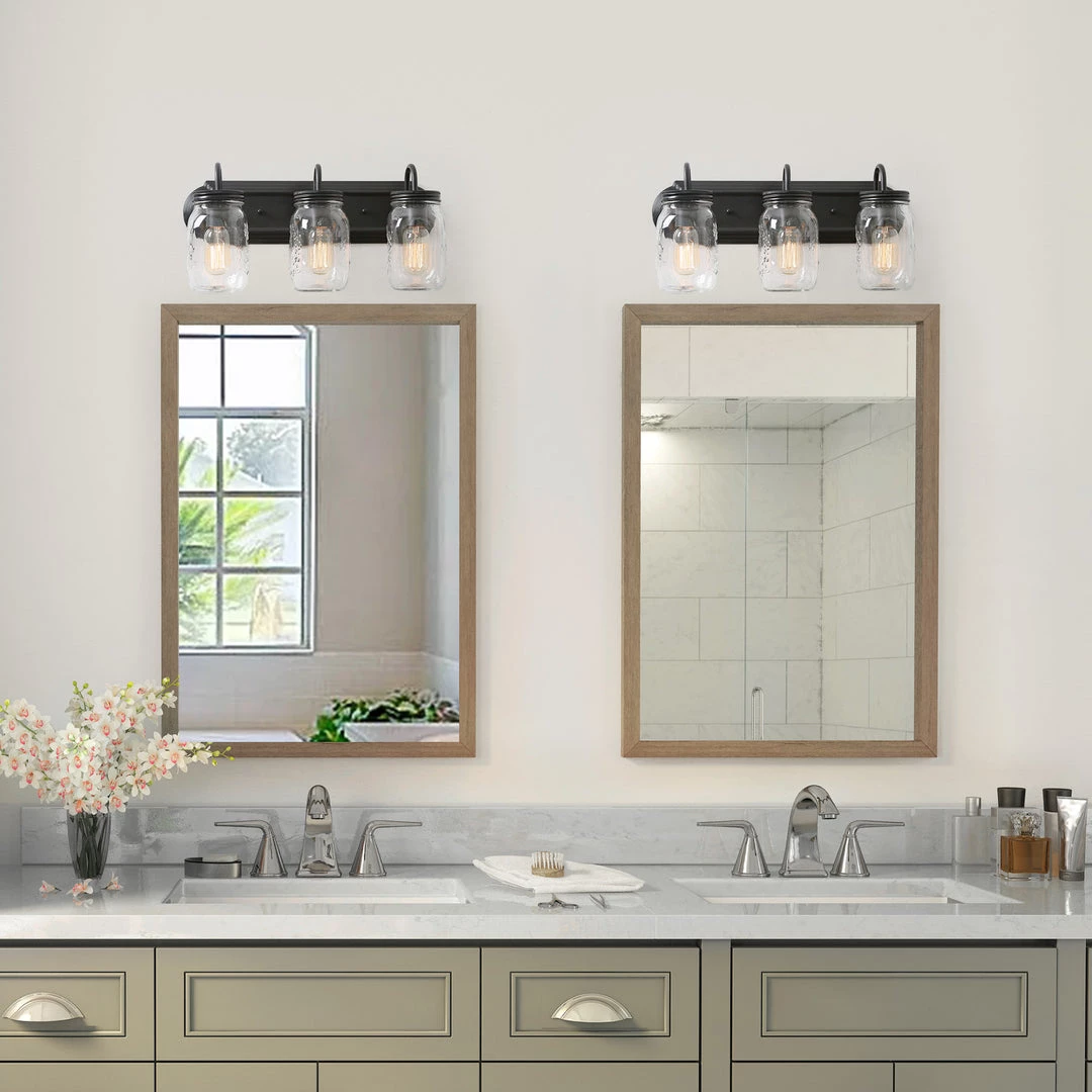 Three simple clear glass jar hangs from a hooked steel arm to create this modest Mason jar wall sconce. The unique and down-to-earth design achieve the perfect combination of versatility and great earthiness. This 3 light Farmhouse Vanity Light Fixture works best over mirror at bedroom, bathroom, foyer, and more.