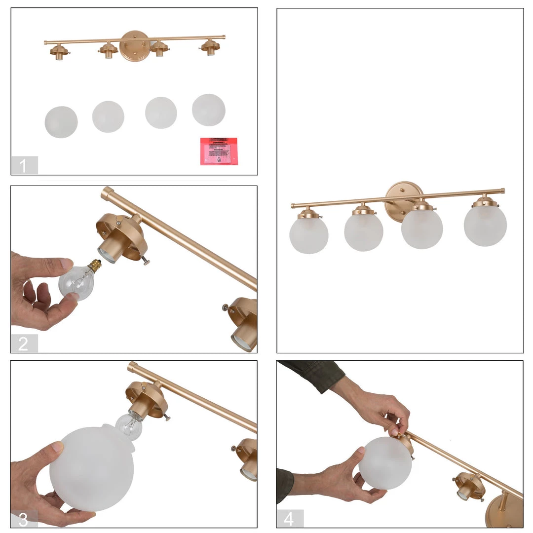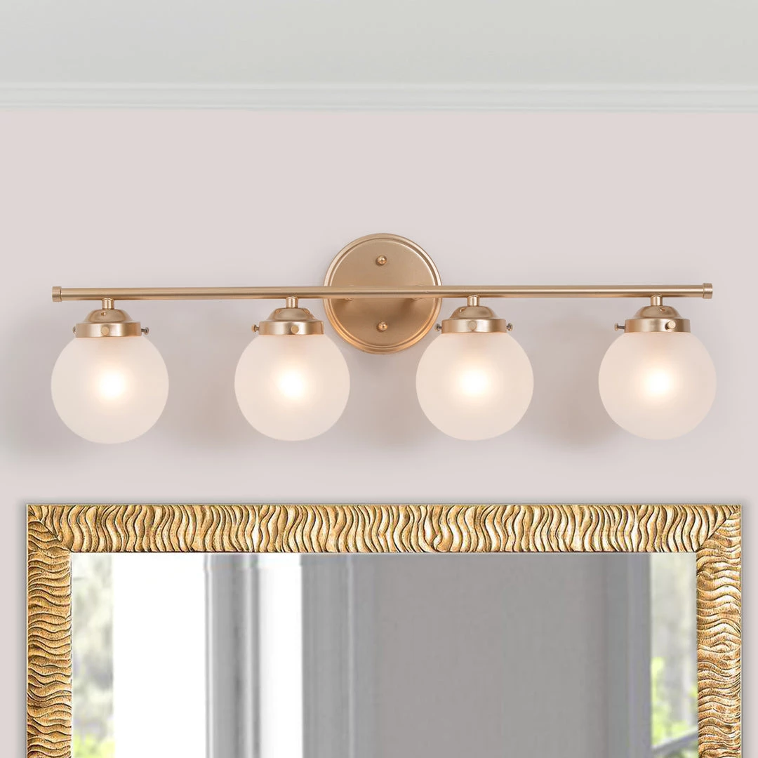This retro-inspired 4-light vanity wall light features 4 cream glass shades that add a note of modernity and vintage vibes to this simplistic fixture. The vintage polished gold bar fuses the apparent vintage aura and creates the contrast with the globes.