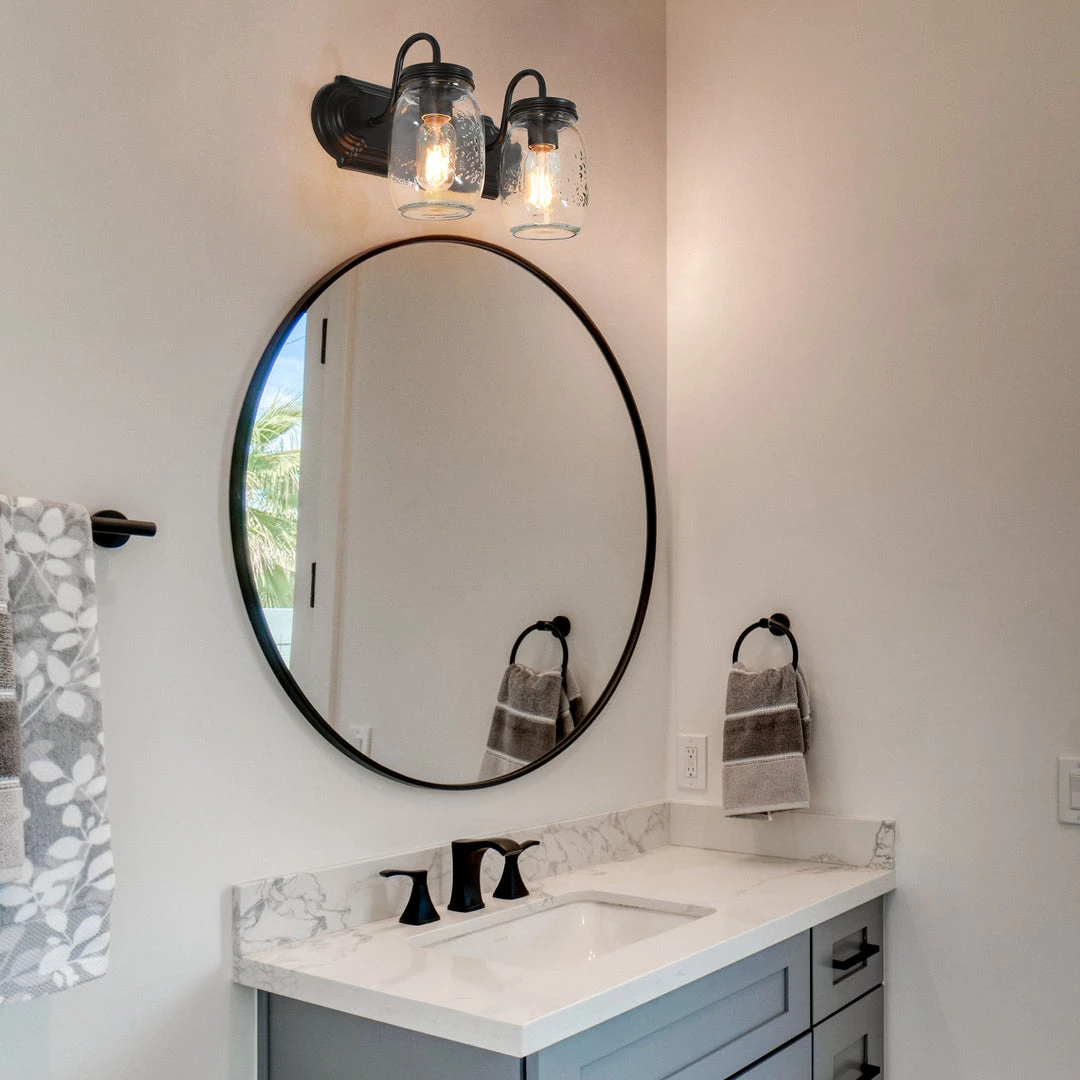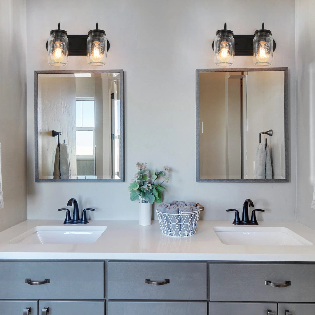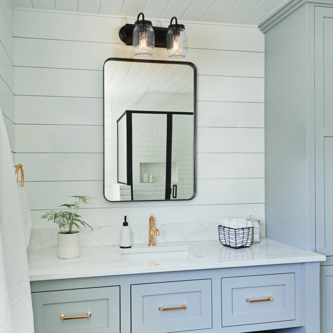 This simplistic modern vanity bathroom light merges the modern sleek physique and the retro-inspired color palette together. Manufactured out of high-quality mixed metals and glass, this fixture is a great combination of durability and aesthetics.