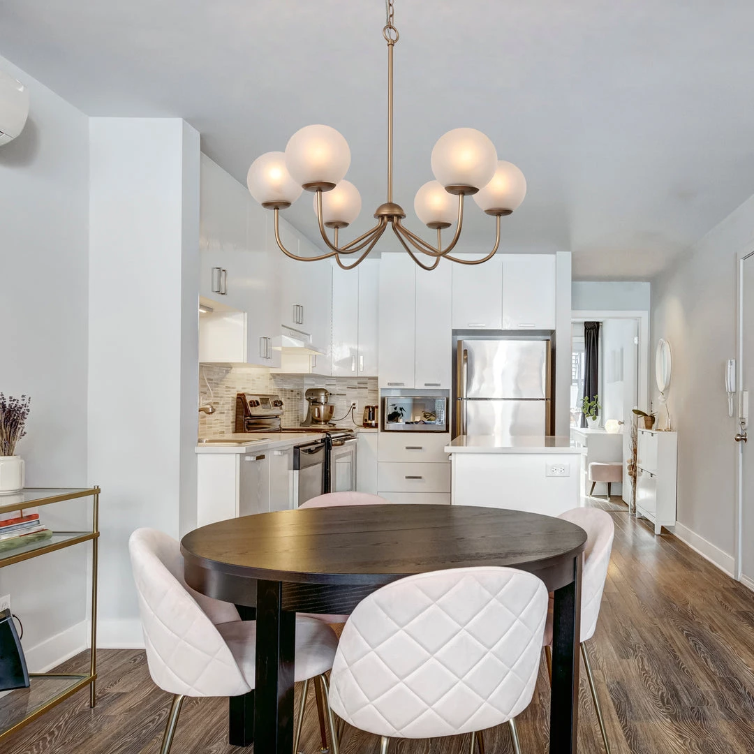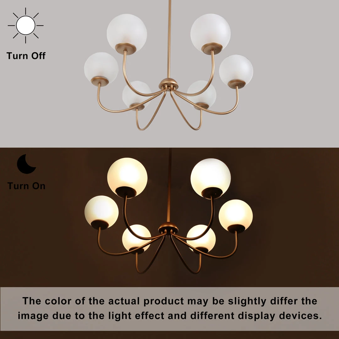 This chandelier is the perfect definition of elegance and simplicity. With the mix of gold sleek arms and creamy glass shades, this exquisite piece will add a finishing touch to your different decoration styles. Make a bold and beautiful statement for your interior with this chandelier now!