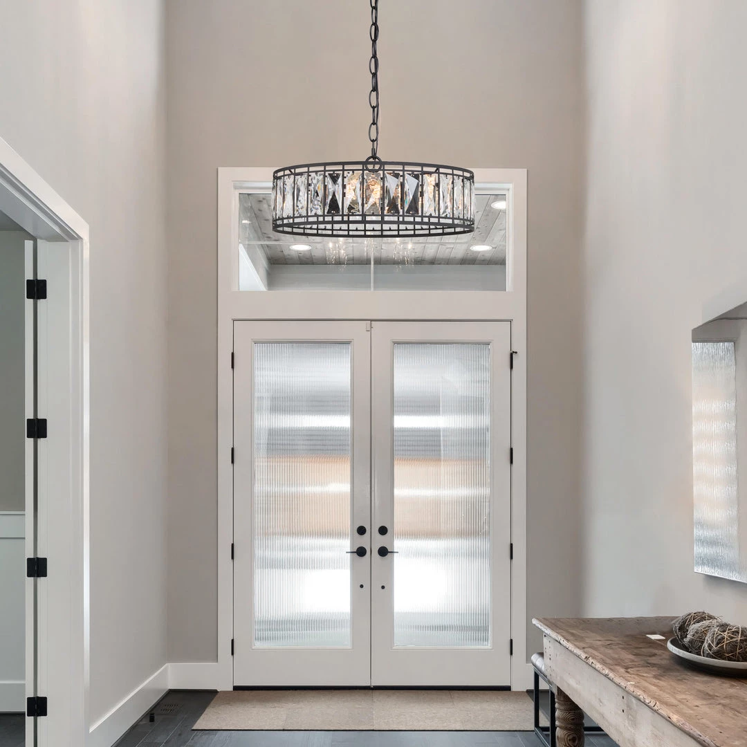 Modern vibes with lots of whimsy define this scintillating crystal chandelier. The glass panels fuse glamorous essence to this truly gorgeous piece, while the black frame underscores the modern classic vibes. The contrast of matte metal and shiny glass is the perfect combination for your modern lifestyle.