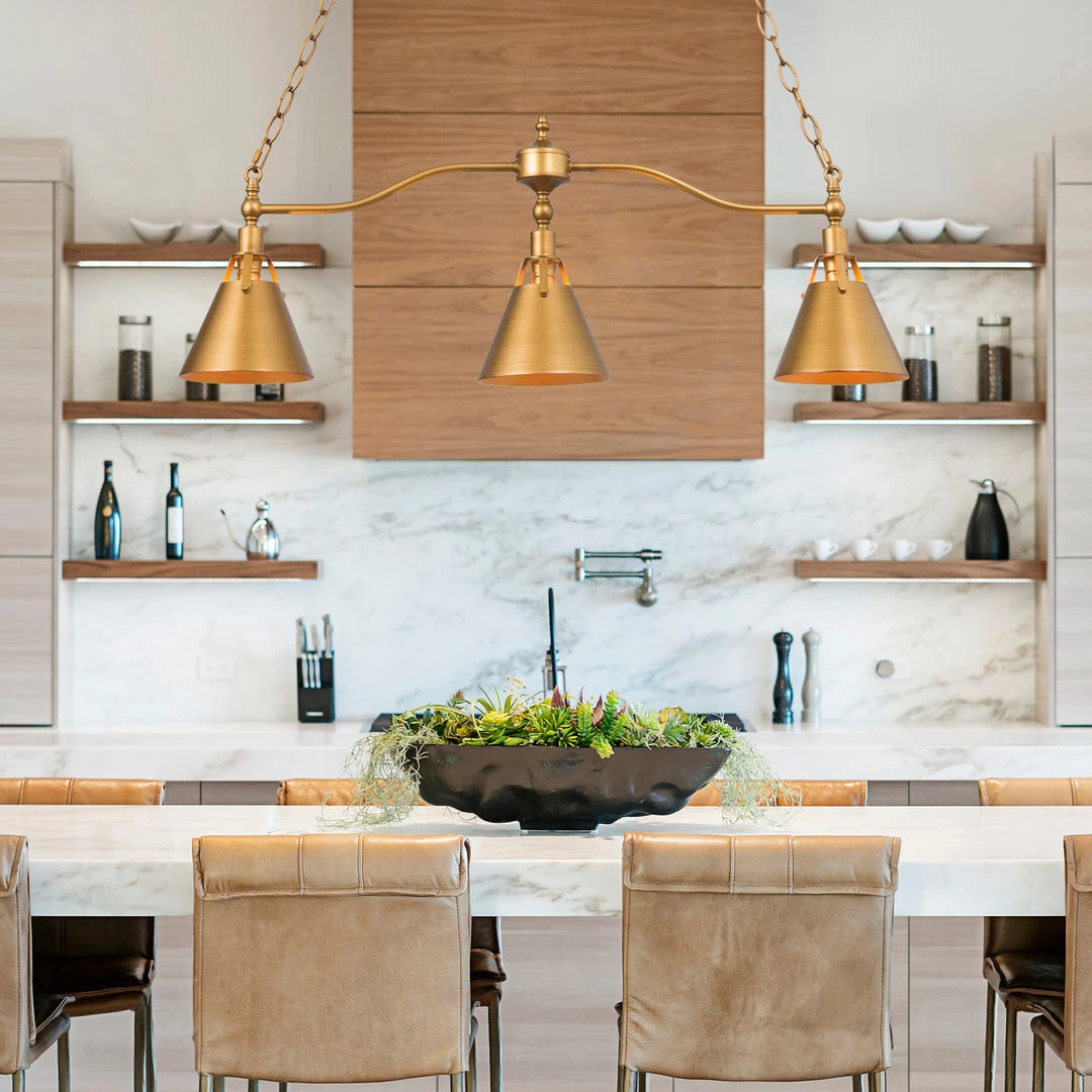 A retro classic is given an update in this glamorous contemporary fixture. With the textured vintage gold veneer, this chandelier is a great way to add a glamorous and unique touch to your modern kitchen or living room. Ideal for a house looking for a hint of glam and charm.