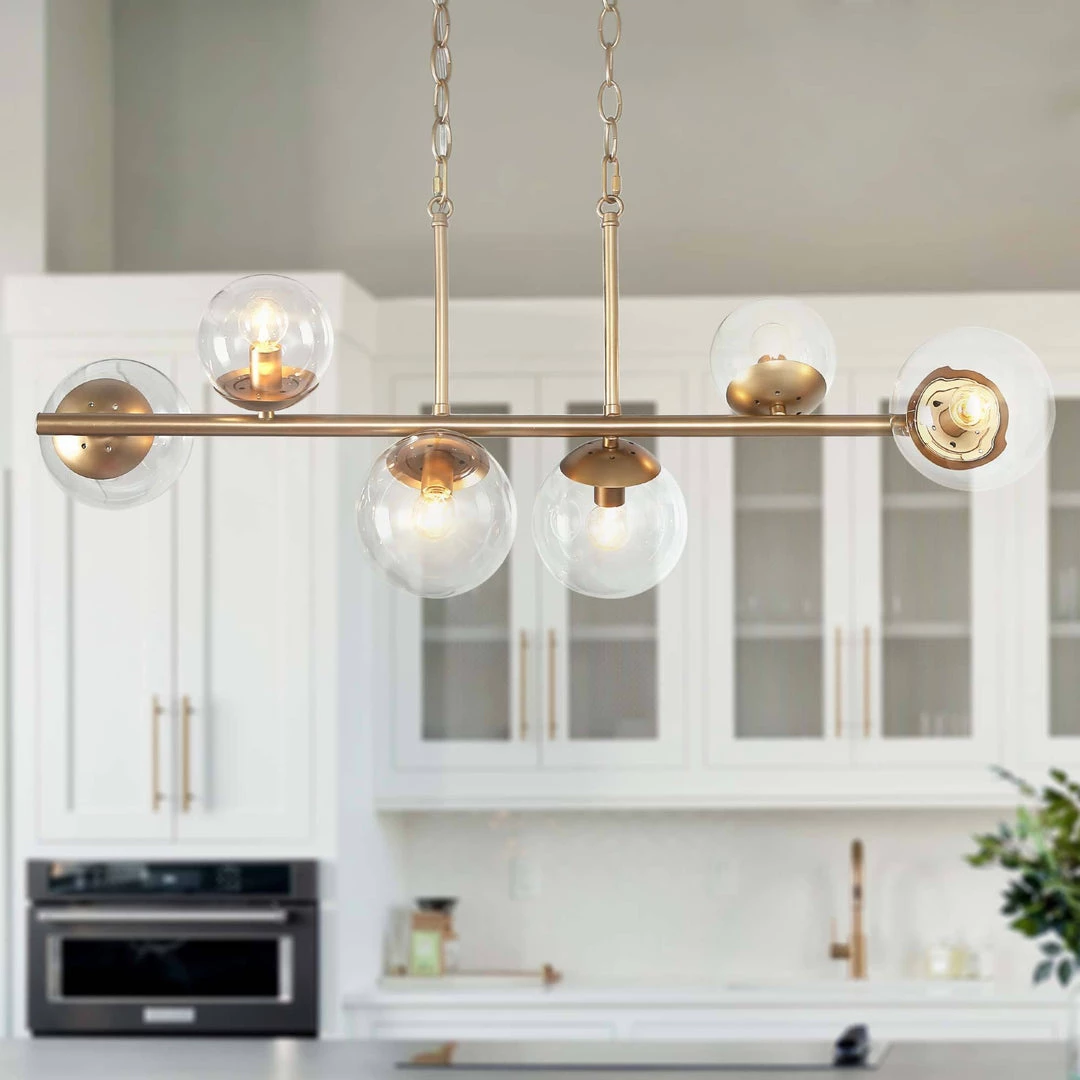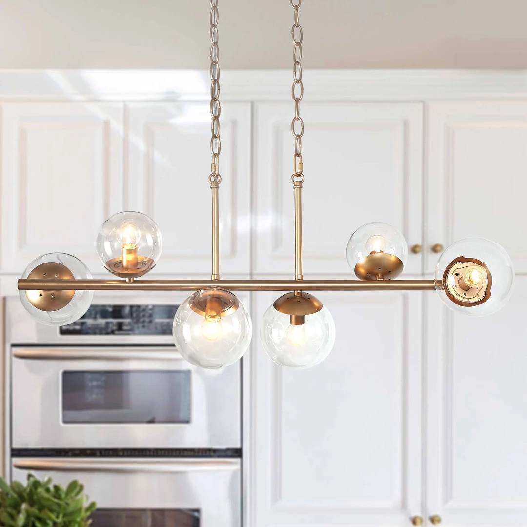 This chandelier has an edgy modern design that will not go unnoticed! Destined to be the centerpiece in any room, this fixture is the sublime of modern edge. The aged gold-finished veneer adds a touch of classic elegance to the piece, while the glass globes of different sizes stress the drama and personalities. Perfect for a modern kitchen or living room.