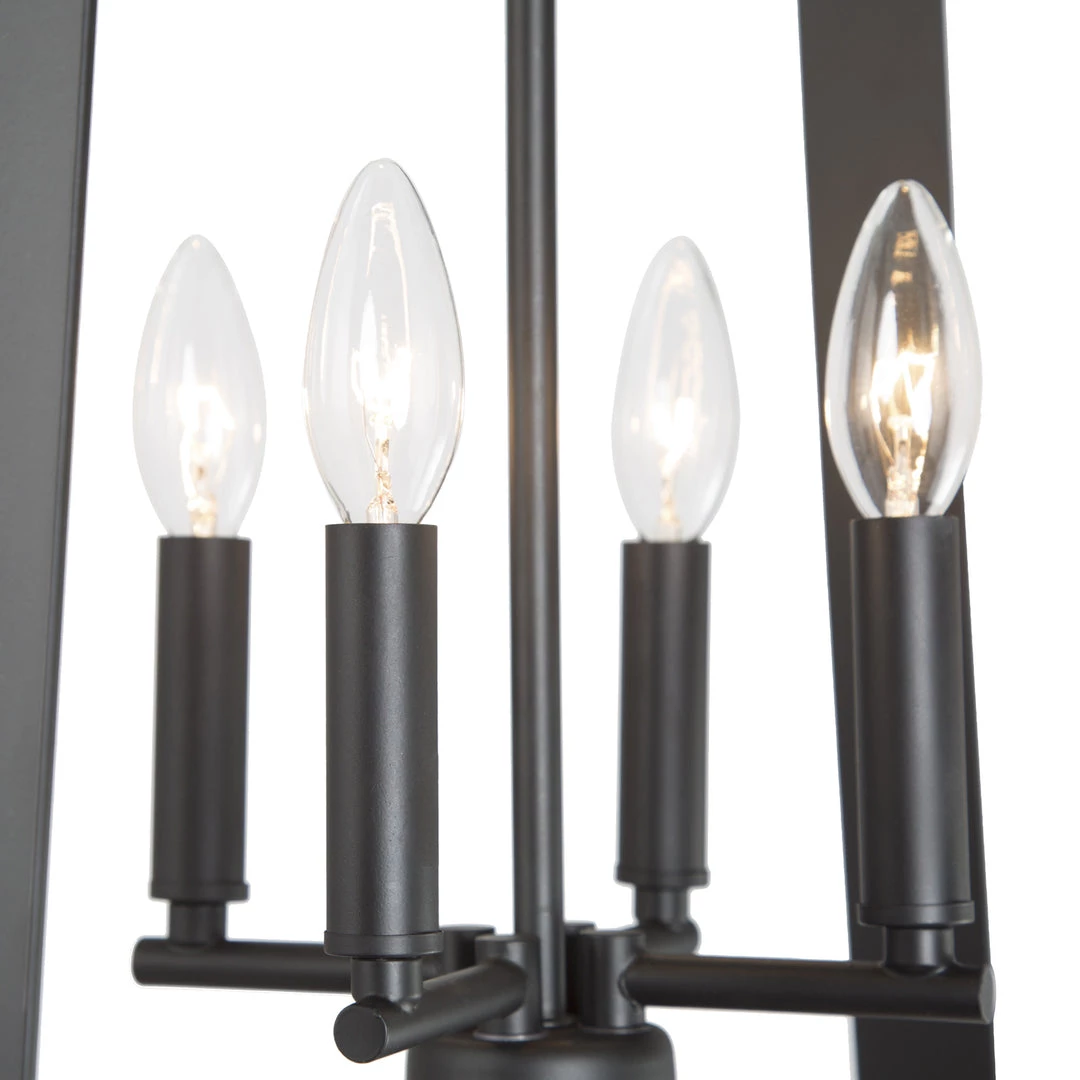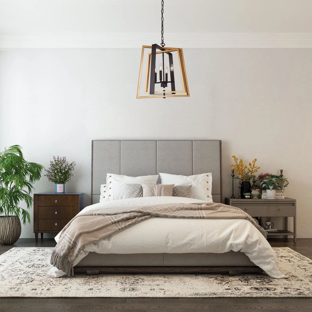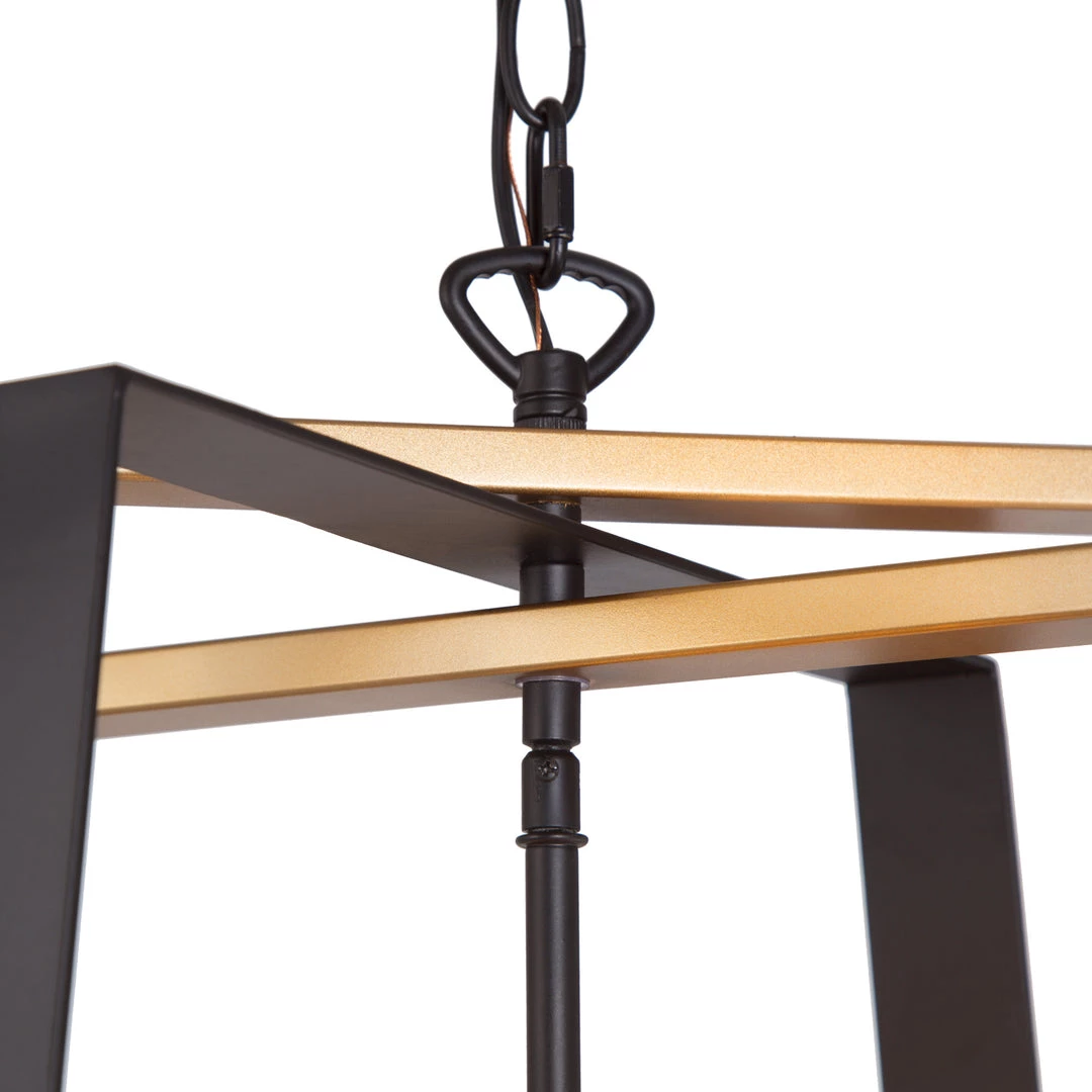 The combination of metallic gold and black creates the sharp contrast that gives off the luxurious and dramatic vibe. Elaborately interweaving trapezium frames add a layer of sophistication to your space. This modern industrial lighting fixture is the perfect add-on for your modern space.
