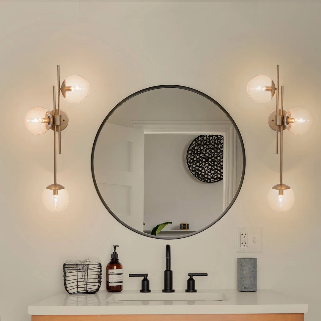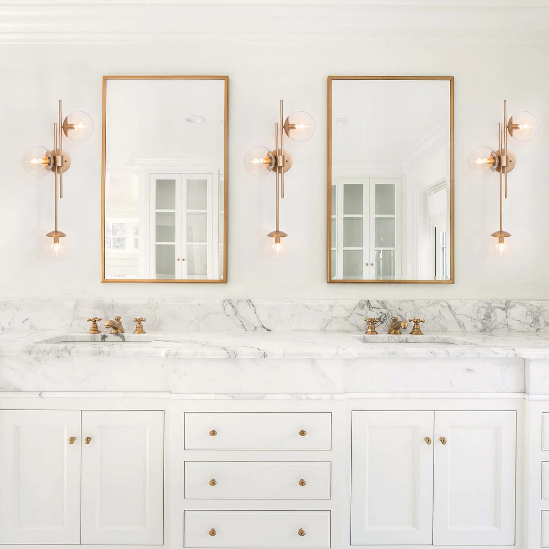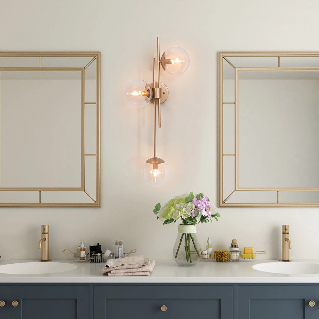 Graceful lines in warm rose gold are complemented with clear ball-shaped glass for the perfect balance of softness and modernity. The combination of metal and glass will energize your eclectic or urban space with unparalleled style.