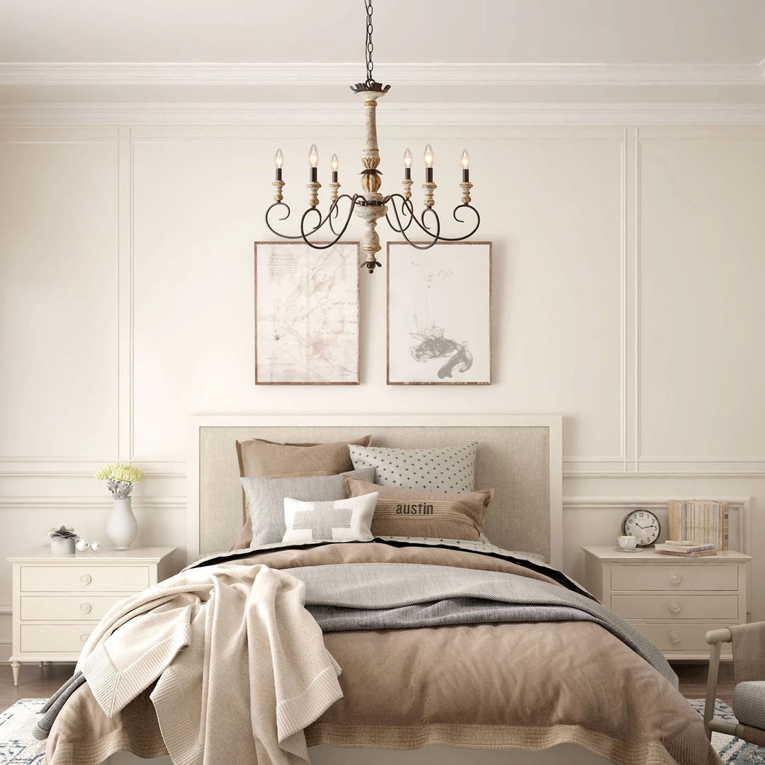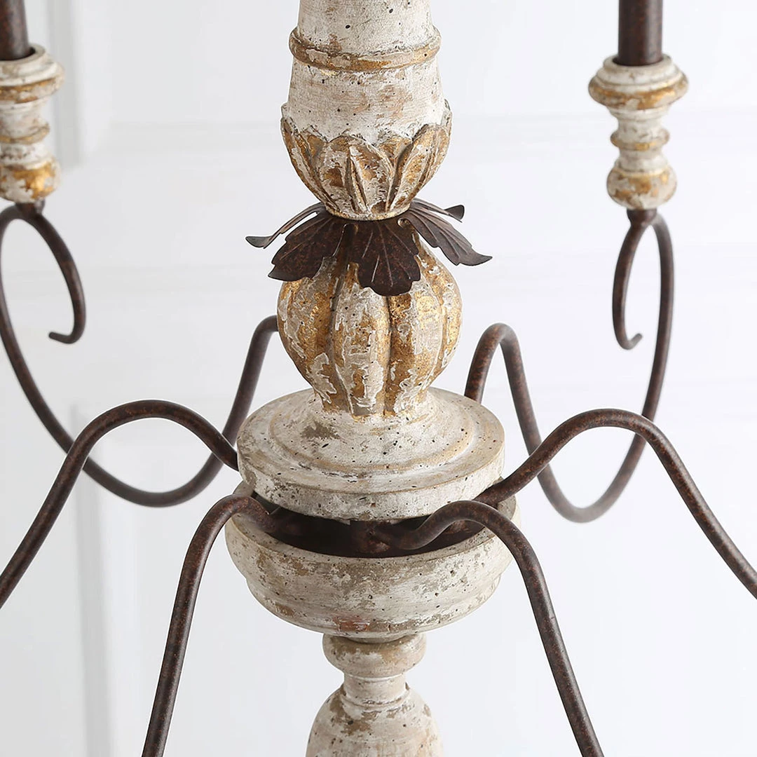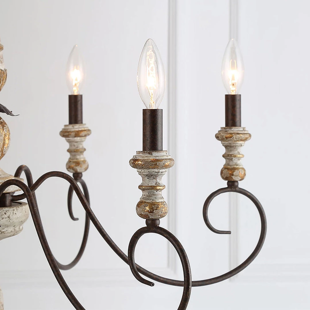 Brimming with rustic countryside flair, the 6-light french country chandelier features soft curves, leaf-like motifs, and candelabra design sharing the elements of the Rococo style. While hand-carved wood center column, antiqued distressing and rust metal finish gives it a rich texture and well-worn appearance. Perfect to install in the dining room, entry, hallway, or foyer, the six-light chandeliers will cast a warm glow and create a relaxing ambiance in the space. This candle chandelier offers a chic french country silhouette in a rust finish. Carved a wooden column with an antique design.