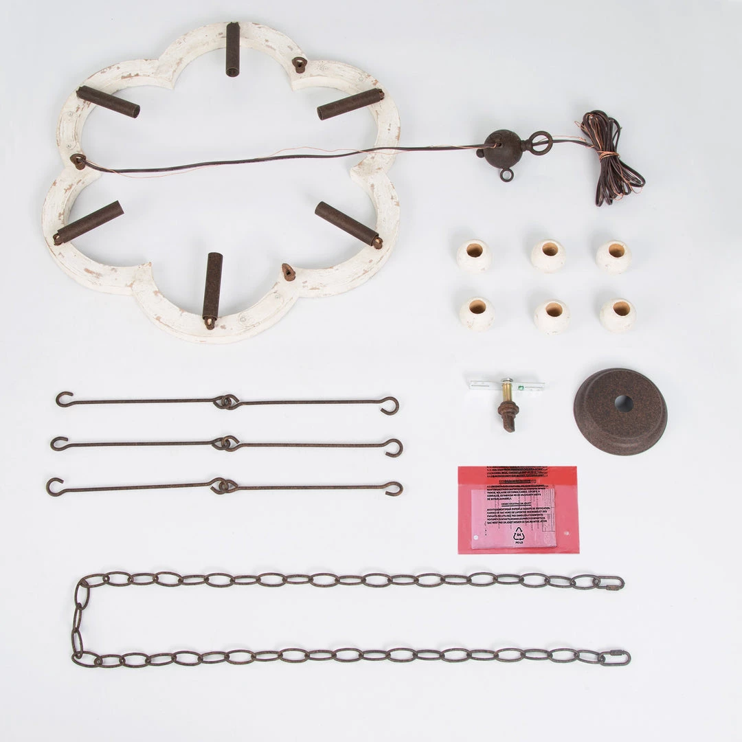 A sturdy, clean design loaded on solid lime oak anchored by sockets mounted on top of the frame creates a statement piece over a dining room table, in a living room, or foyer. The wood ring sand finished in rustic white gives off a subtle and sophisticated vibe. Perfect to be paired with vintage filament bulbs for a warm ambiance.