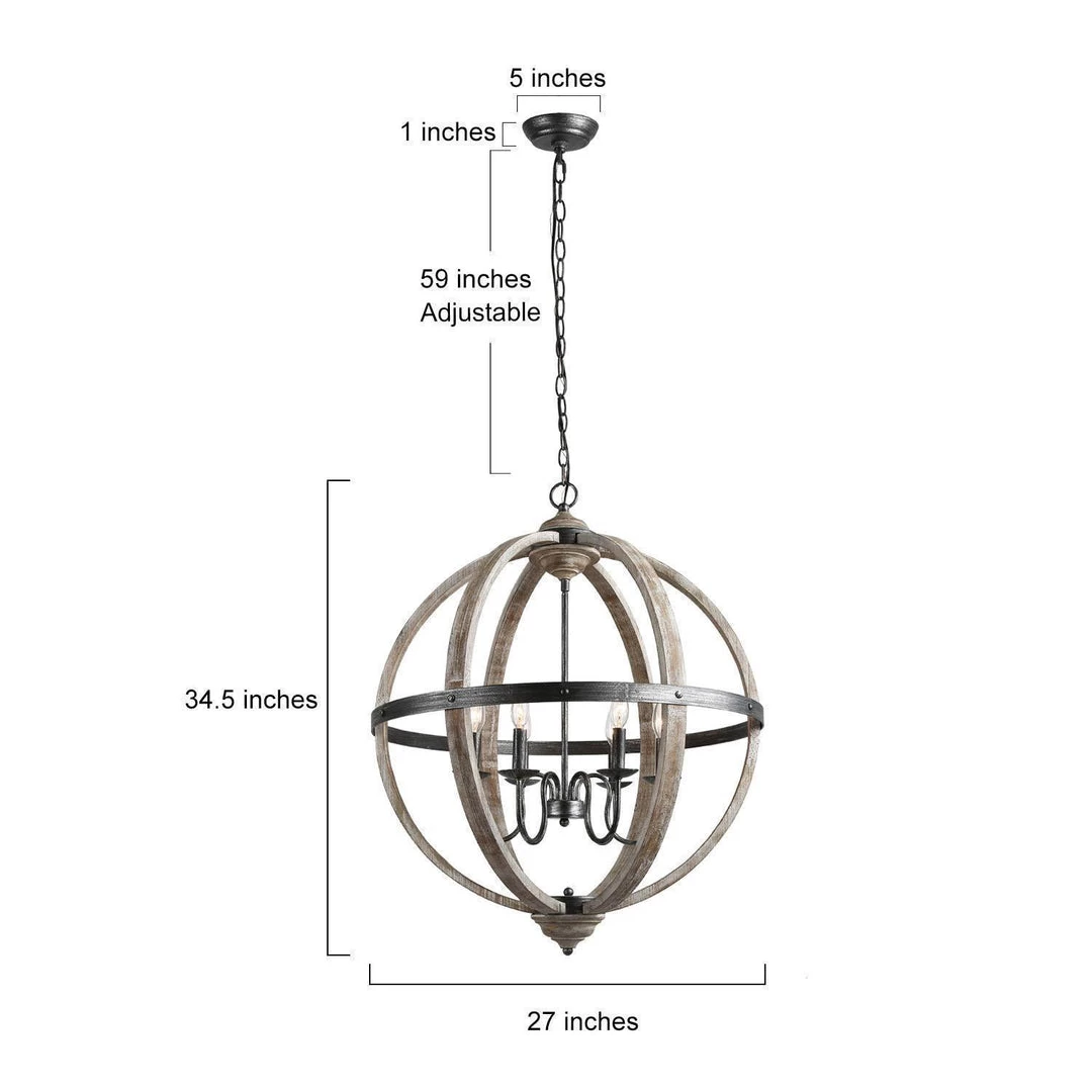 Crafted of quality antique gray finished rustic wood frame, this rustic pendant features an elegant sphere wrapped with hand-polished silver painting metal strap. The light arms finished in black metal work well in complementing this rustic design. This 6-light fixture comes with every element you need for creating a desired style environment.